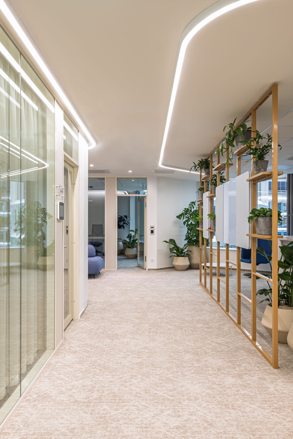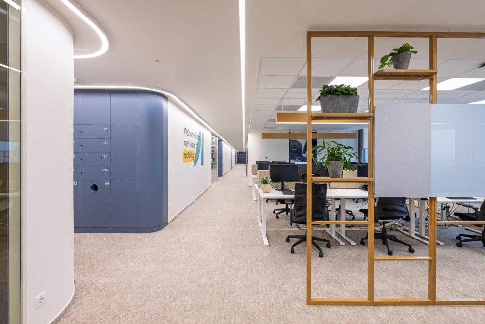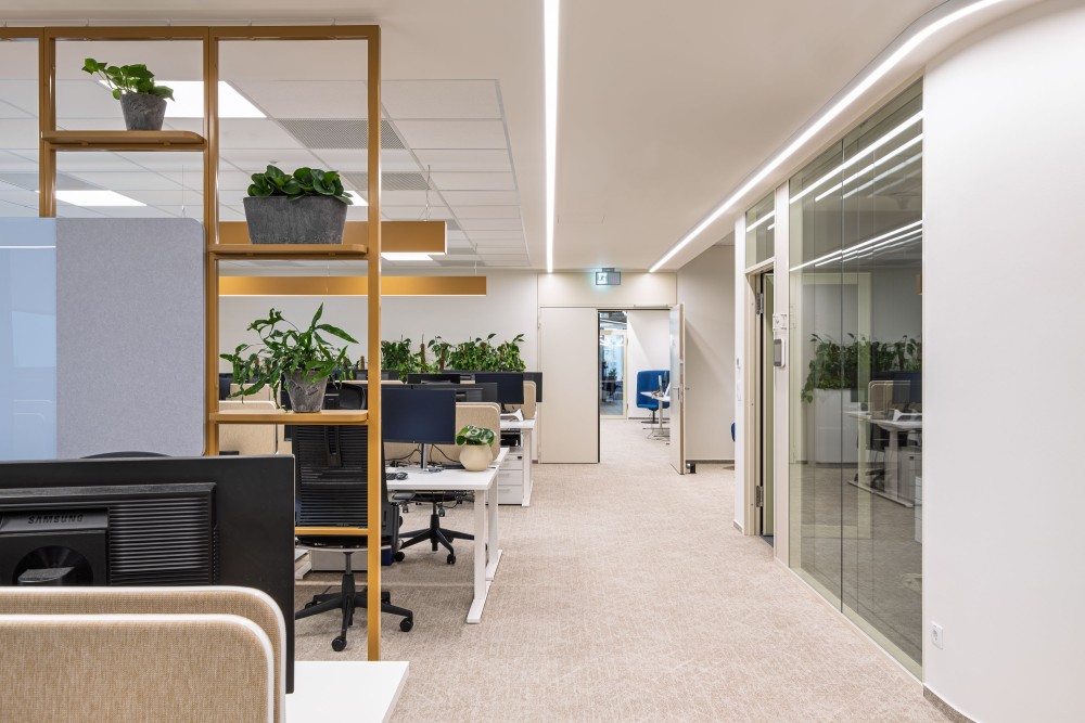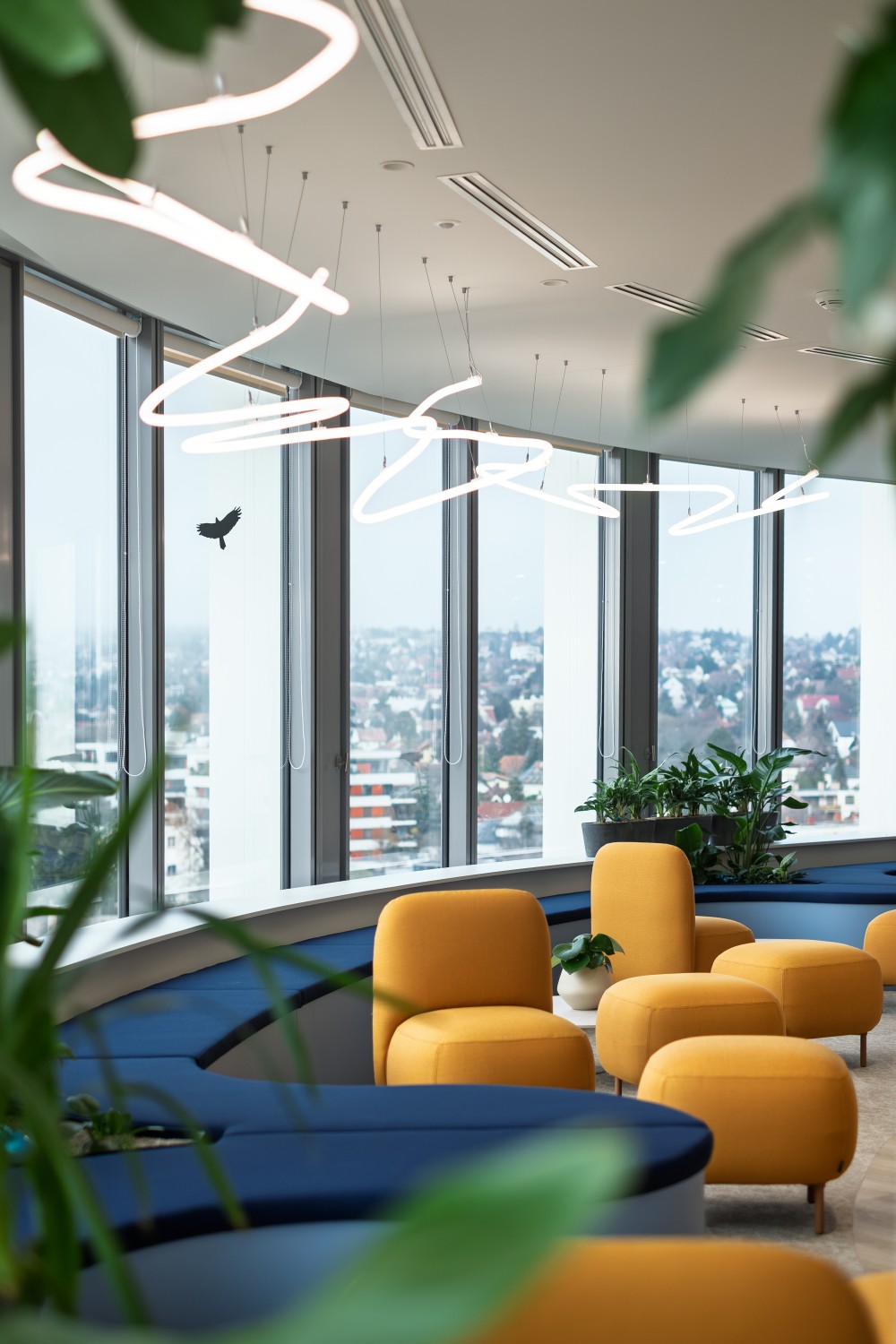 A harsány brand színek puhább, melegebb, lágyabb árnyalatai finoman, térbe integrálva lettek alkalmazva. Industrial jellegű látszó gépészeti területekkel és zártabb, standard mennyezetekkel jelöltünk ki különböző aktivitású zónákat, melyek célzott hangelnyelési felületekkel párosulnak. Célirányos forma- és színvilággal megválasztott kaspókba helyezett növények, függő zöld installációk bizonyítottan csökkentik a stresszt, javítják a fókuszt és a közérzetet. A hangulat így fiatalos, dinamikus, miközben kényelmet és otthonosságot is sugároz.