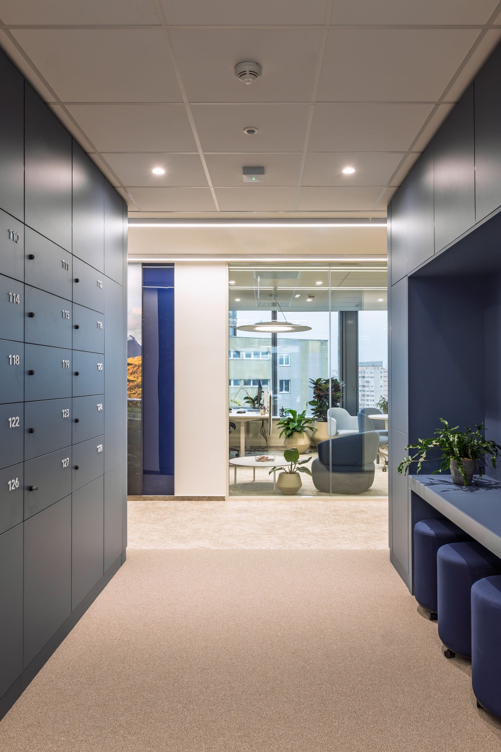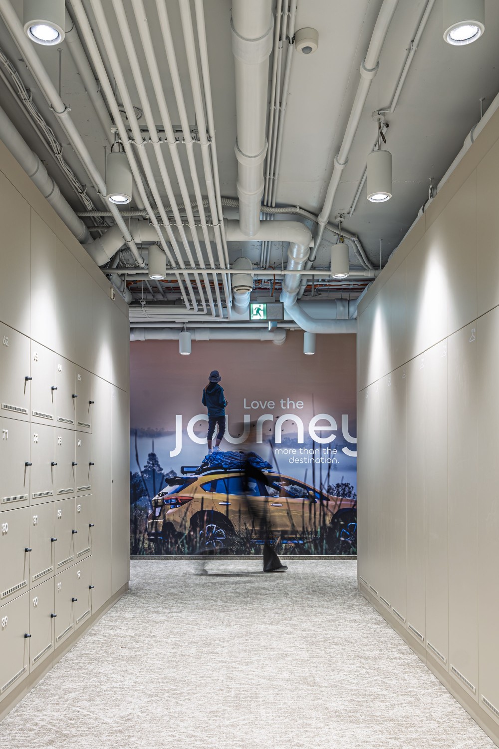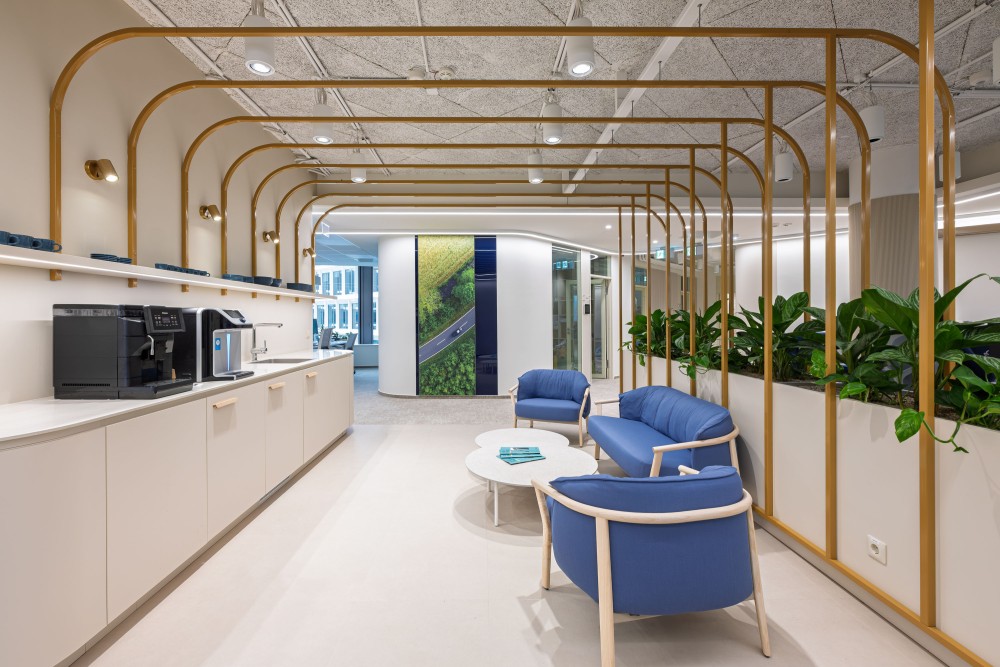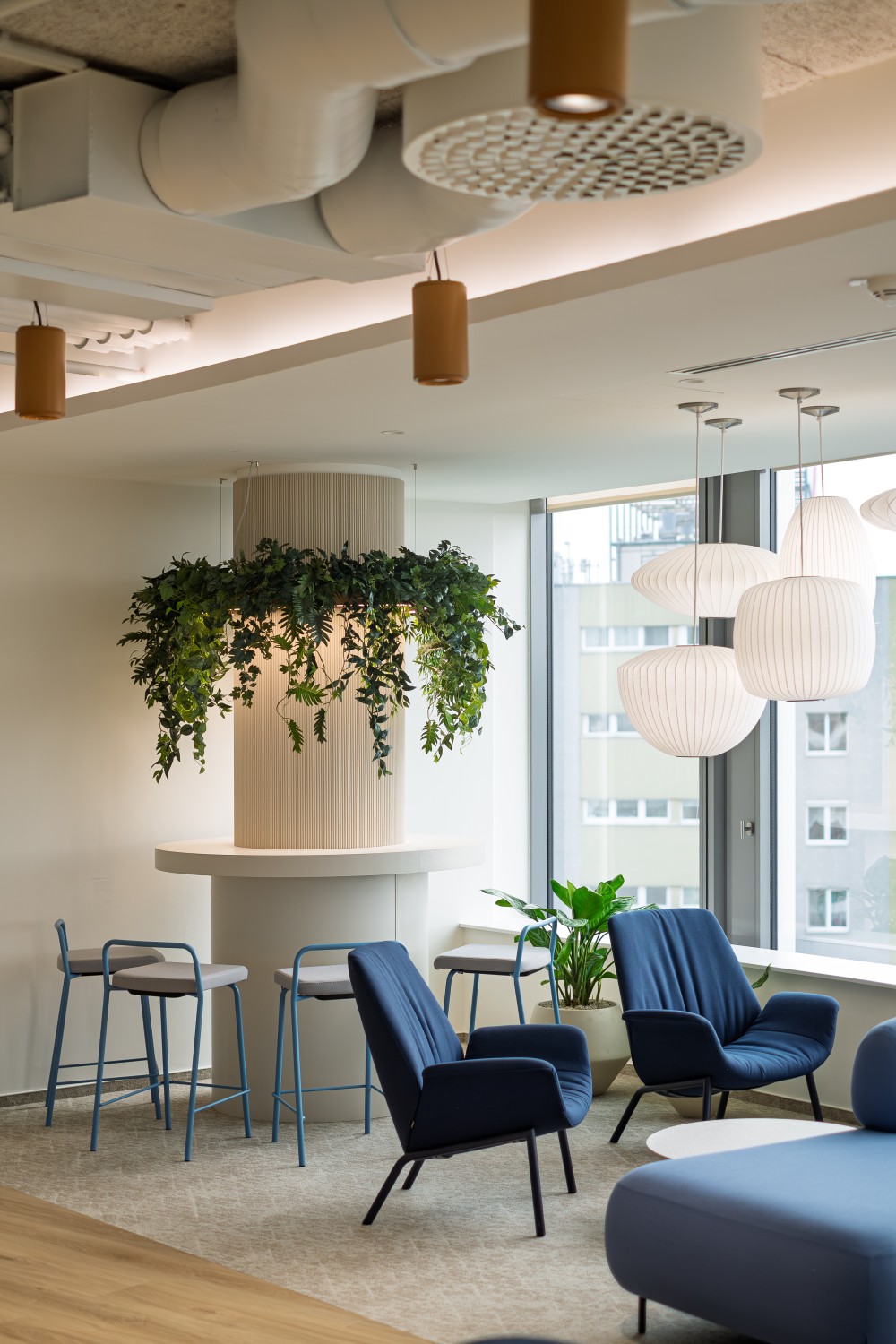 A harsány brand színek puhább, melegebb, lágyabb árnyalatai finoman, térbe integrálva lettek alkalmazva. Industrial jellegű látszó gépészeti területekkel és zártabb, standard mennyezetekkel jelöltünk ki különböző aktivitású zónákat, melyek célzott hangelnyelési felületekkel párosulnak. Célirányos forma- és színvilággal megválasztott kaspókba helyezett növények, függő zöld installációk bizonyítottan csökkentik a stresszt, javítják a fókuszt és a közérzetet. A hangulat így fiatalos, dinamikus, miközben kényelmet és otthonosságot is sugároz.
