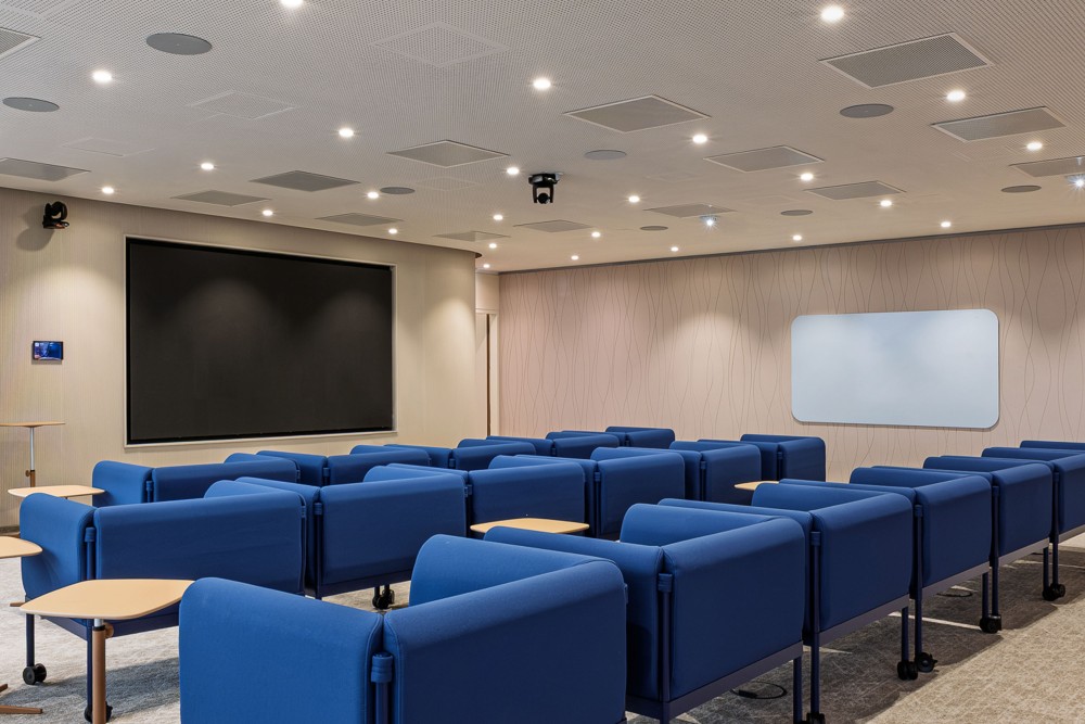 A modern technológiák integrálása a cég innovációs szellemiségét tükrözi. Az érintőpaneles tárgyalófoglaló rendszer az ajtónál valós időben mutatja a szobák státuszát és átláthatóvá teszi a kihasználtságot—így rugalmasan szervezhetik a kollégák mindennapjaikat. A méretezett LED fal + kalibrált AV megoldás minden üléspontról jól olvasható tartalmat és tiszta hangot biztosít, ami a hibrid egyeztetéseket érdemben javítja. Természetes megvilágítás maximalizálása mellett a mesterséges világítási rendszer a közös területeken jelenlét- és napfénykövető szenzorokkal, DALI világításvezérlő rendszerrel működik, így mindenhol annyi fény lesz jelen, amennyi az ideális munkavégzéshez kell.
