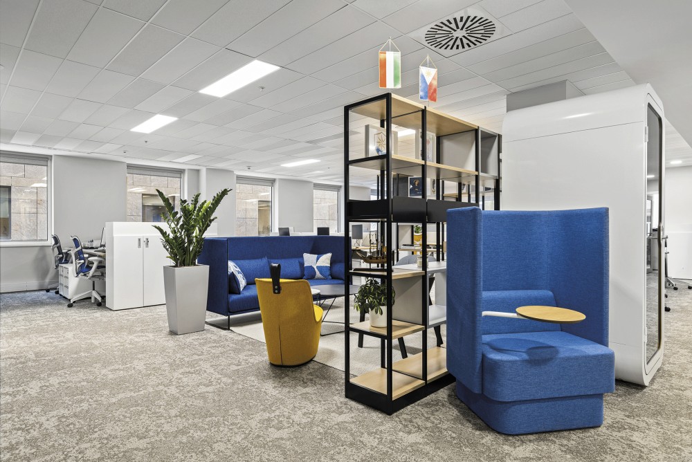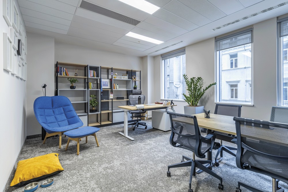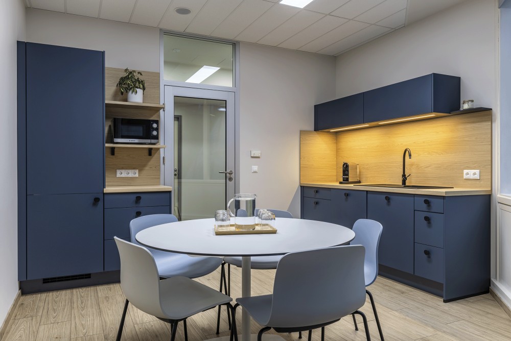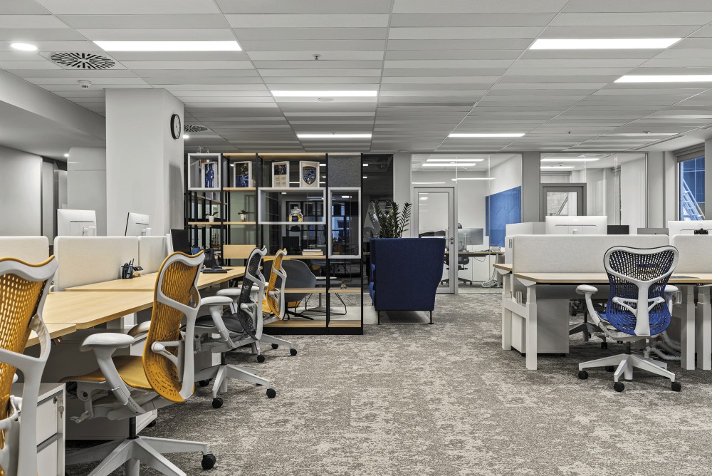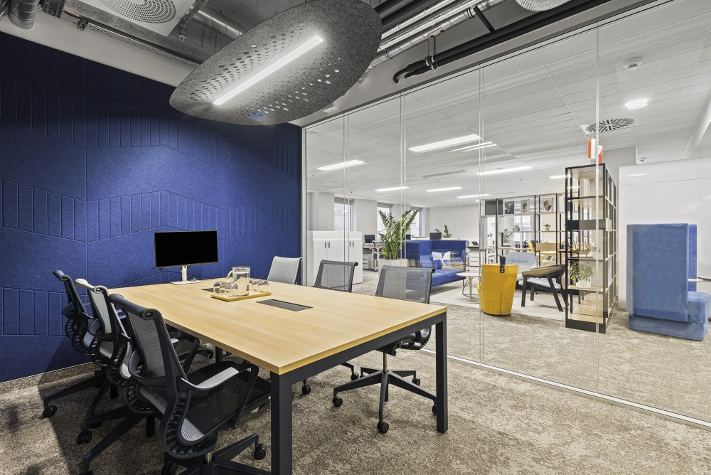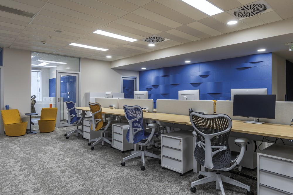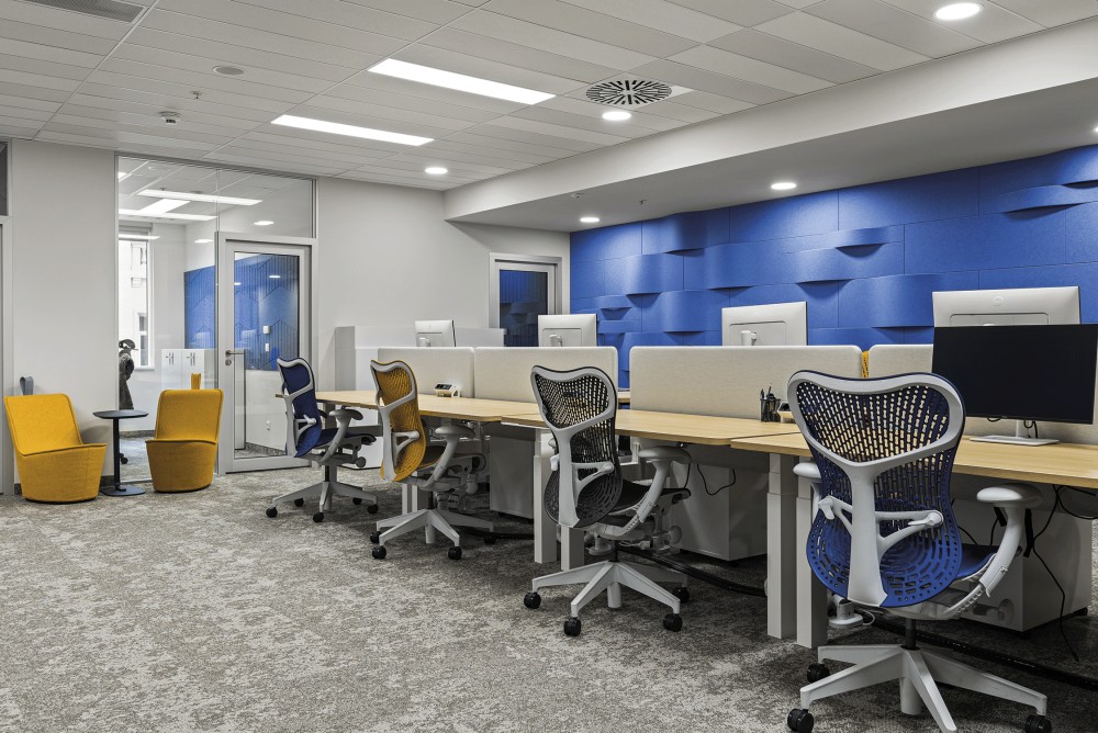 A kék a fókuszt, stabilitást és megbízhatóságot erősíti, míg a sárga kiegészítők/székek energiát, kreativítást, játékosságot visznek a térbe Ez az egyensúly barátságos, inspiráló atmoszférát teremt. A tér egyik meghatározó eleme az akusztikus hullám- motívum, amely nemcsak zajt csillapít, hanem vizuálisan dinamizmust, ritmust ad a helyiségnek. A hullámzó formák a folyamatos fejlődést, alkalmazkodást szimbolizálják. A prémium MillerKnoll bútorok magas szintű ergonómiát, hosszútávú komfortot, fenntarthatóságot és rugalmasságot biztosítanak, támogatva a különböző munkastílusokat. Az iroda így nemcsak kiszolgálja a mindennapi munkát, hanem inspiráló, élhető és szerethető munkahellyé válik.