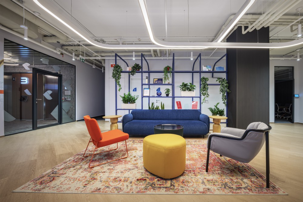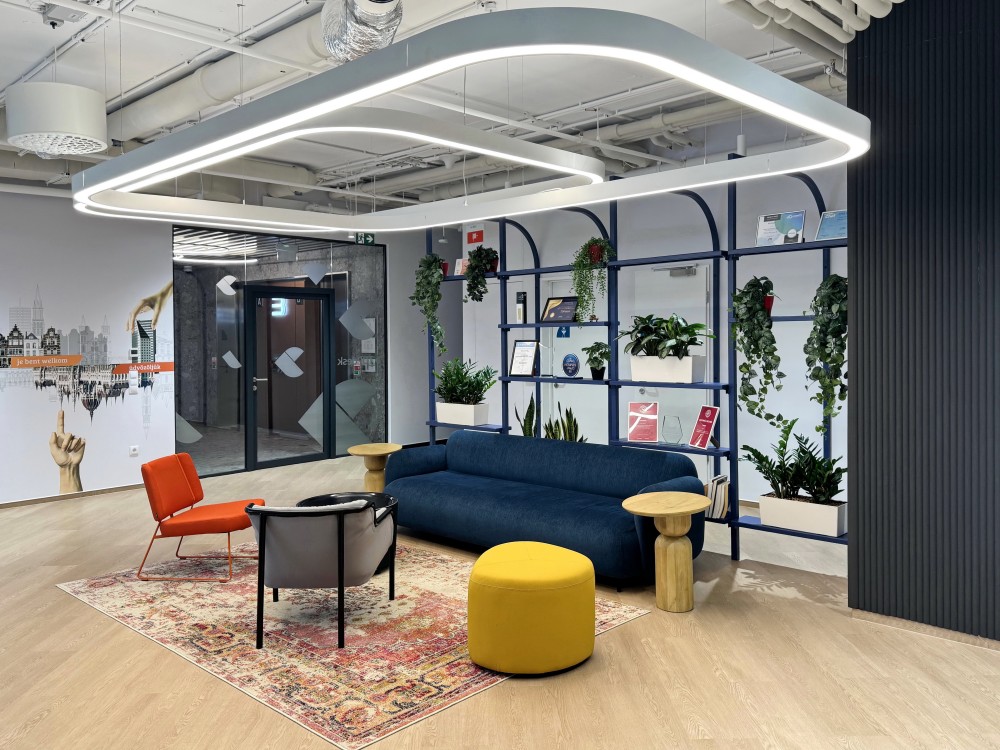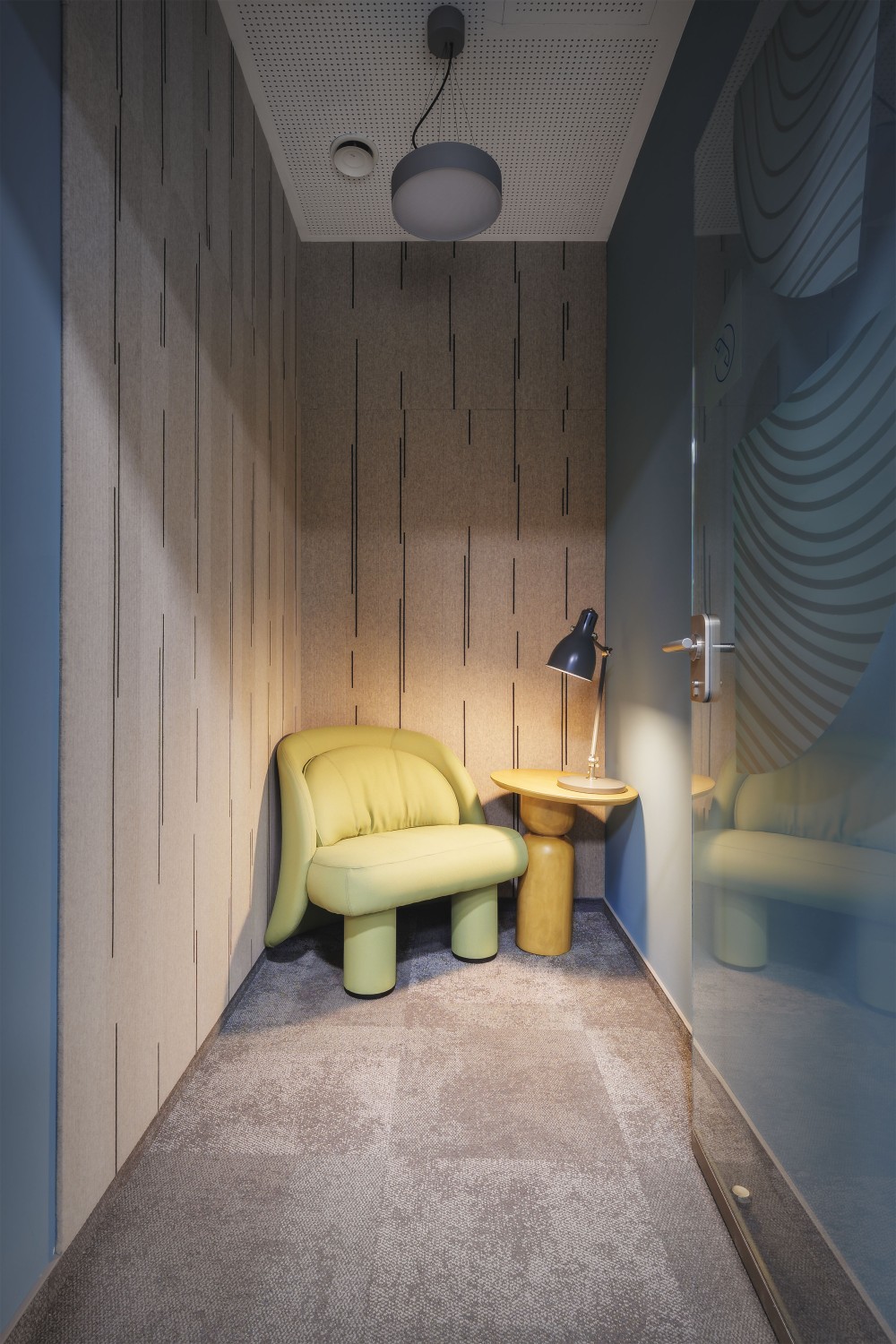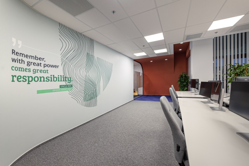 Logónk és brandbookunk meghatározó inspirációs forrásként szolgált a tér vizuális szervezésében. A márkánk jellegzetes, egyik sarkán lekerekített formavilága visszatérő motívummá vált az iroda egészében: megjelenik a grafikákban, a térelválasztók kialakításában, a szőnyegburkolatok váltásaiban, valamint a falak és álmennyezeti elemek íves, lágy geometriájában.