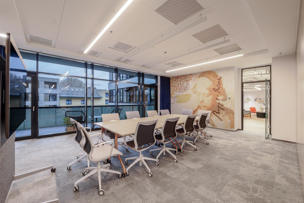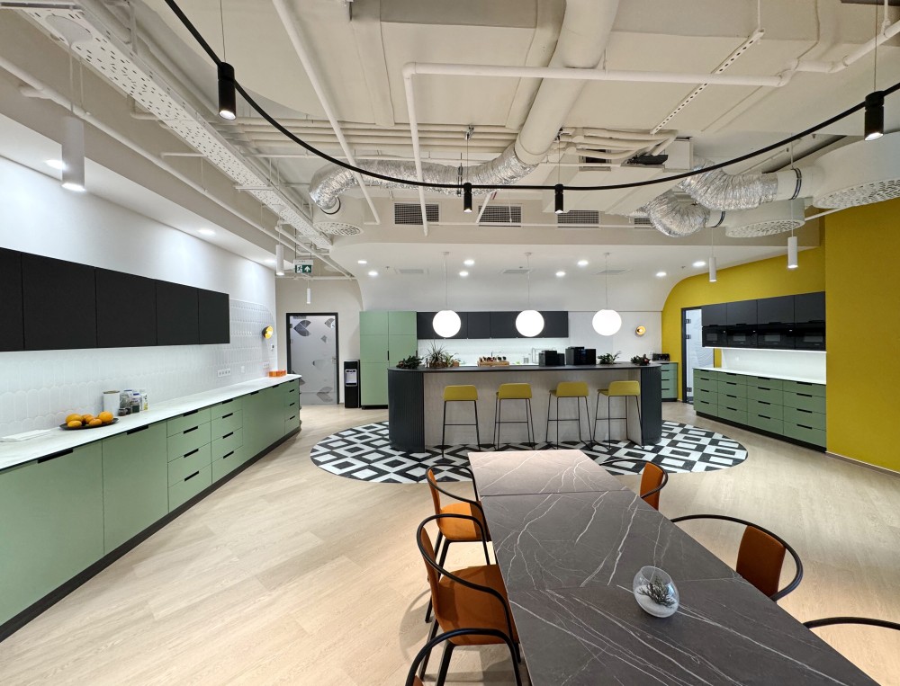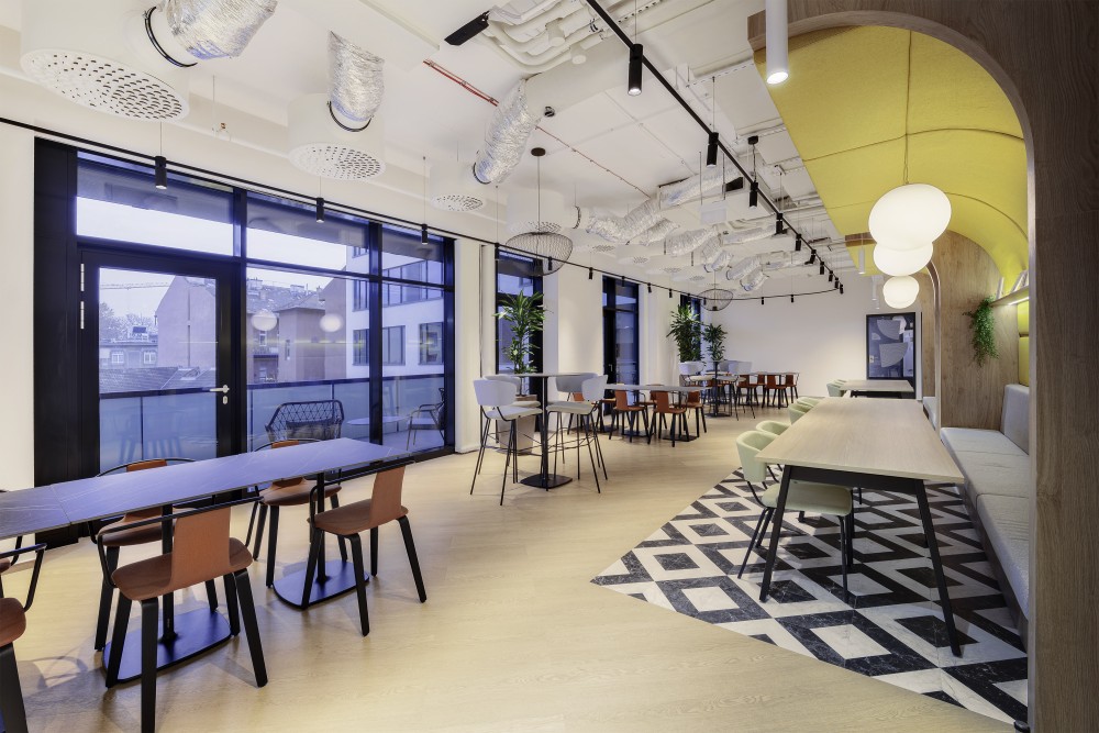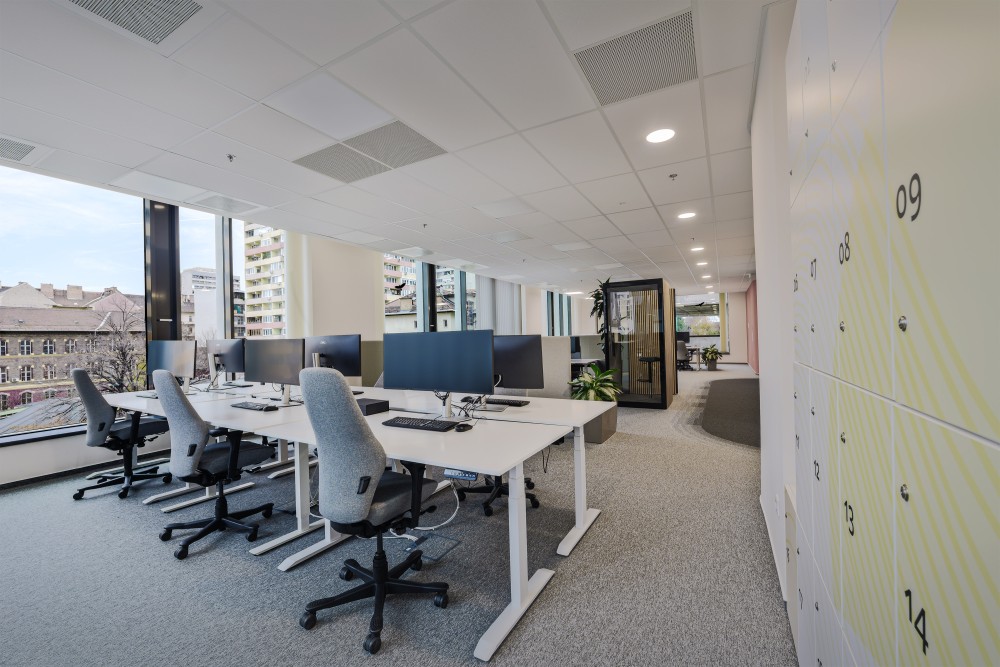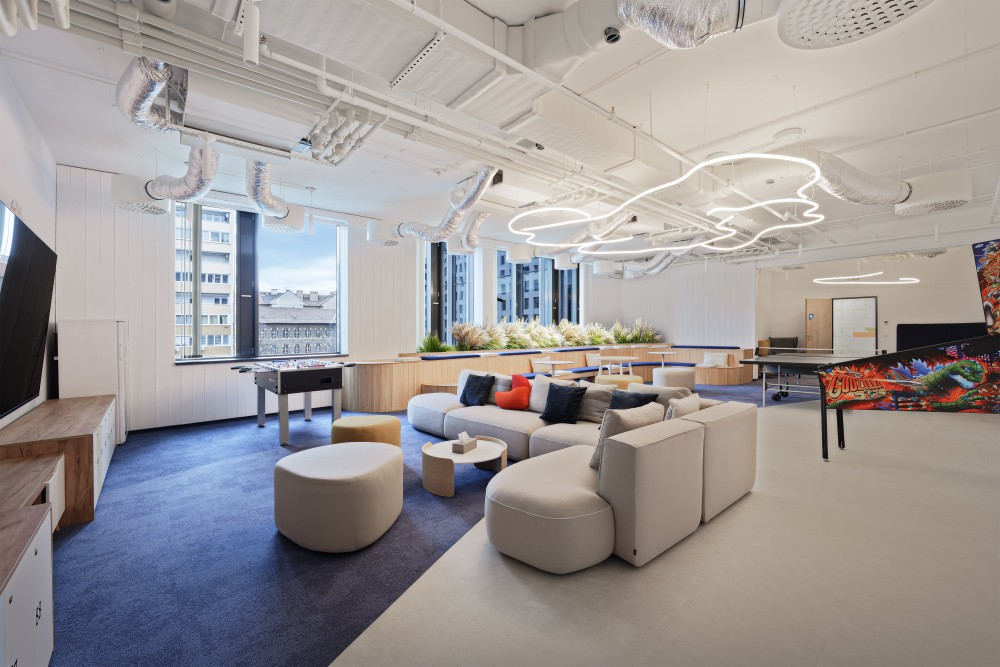 A funkcionalitás kiemelt szerepet kapott: a tárgyalók többféleképpen nyithatók össze, akár 50 fős tér is kialakítható, a gurulós bútorok egyszerűen mozgathatók, ezáltal könnyedén alkalmazhatóak meetingekre, csapatépítőkre vagy irodai jógára is. A tárgyalók elnevezésében is számítunk a kollégák ötleteire: bárki javasolhat fantázianeveket, majd a legjobbakat közösen szavazzuk meg. Ergonomikus környezet támogatja a napi munkát: állítható asztalok, ultrawide monitorok, zajszűrős fejhallgatók, hat telefonfülke és korszerű videókonferencia-rendszer segíti a nemzetközi csapatokat. A közösségi élet szíve a tágas konyha-étkező és a közösségi tér csocsóval, flipperrel, TV-vel és PlayStationnel, amely egyszerre meetinghelyszín, pihenőtér és informális zóna.