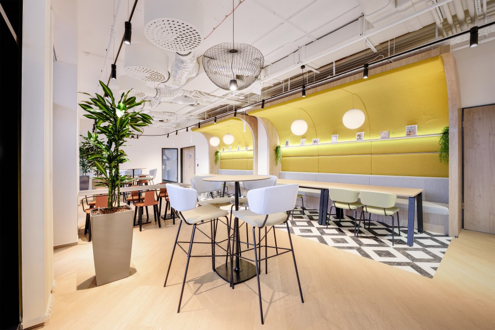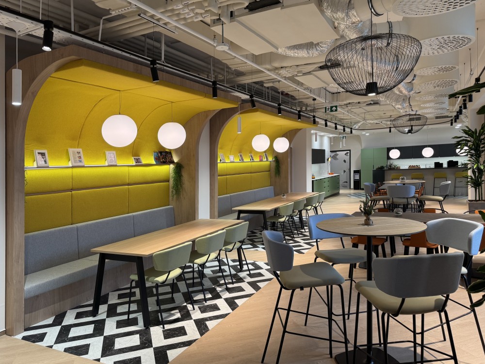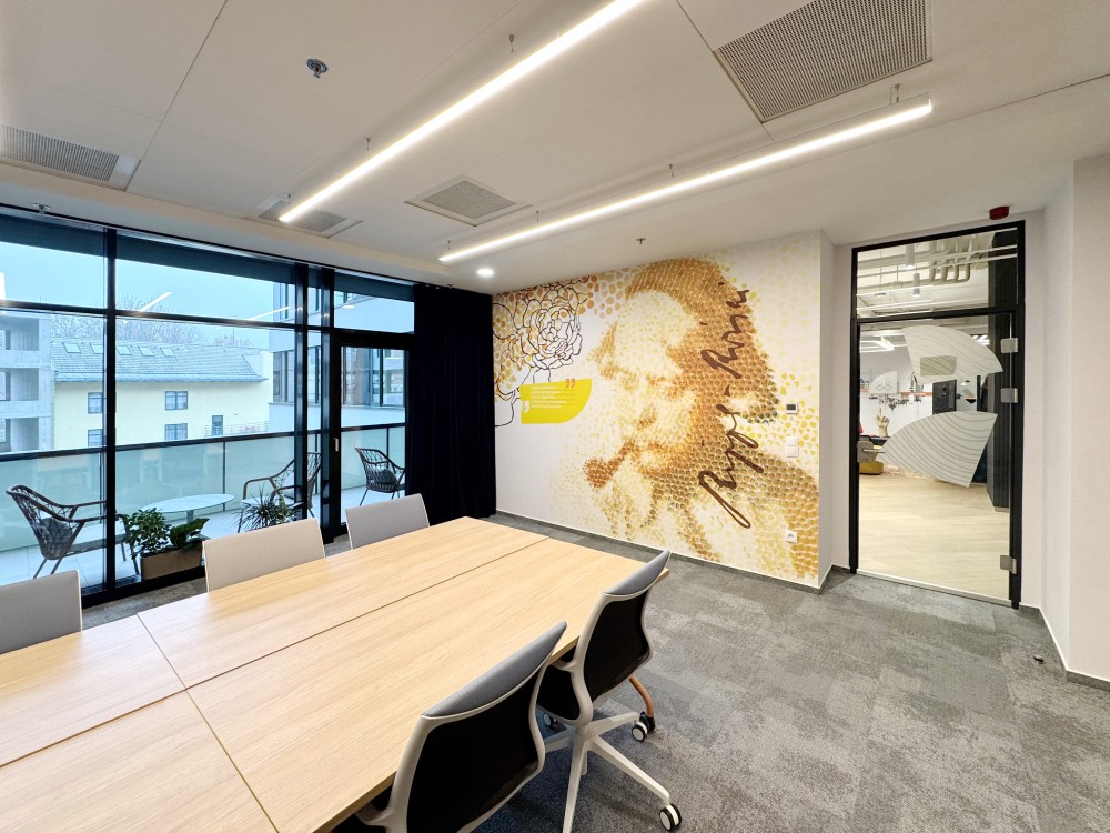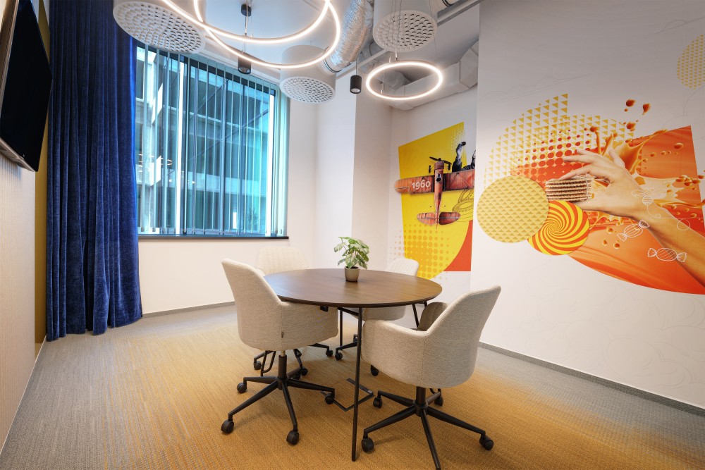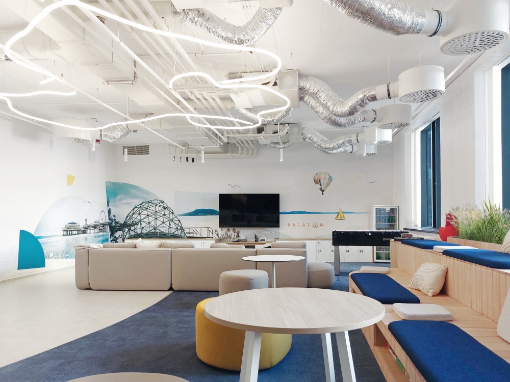 A funkcionalitás kiemelt szerepet kapott: a tárgyalók többféleképpen nyithatók össze, akár 50 fős tér is kialakítható, a gurulós bútorok egyszerűen mozgathatók, ezáltal könnyedén alkalmazhatóak meetingekre, csapatépítőkre vagy irodai jógára is. A tárgyalók elnevezésében is számítunk a kollégák ötleteire: bárki javasolhat fantázianeveket, majd a legjobbakat közösen szavazzuk meg. Ergonomikus környezet támogatja a napi munkát: állítható asztalok, ultrawide monitorok, zajszűrős fejhallgatók, hat telefonfülke és korszerű videókonferencia-rendszer segíti a nemzetközi csapatokat. A közösségi élet szíve a tágas konyha-étkező és a közösségi tér csocsóval, flipperrel, TV-vel és PlayStationnel, amely egyszerre meetinghelyszín, pihenőtér és informális zóna.