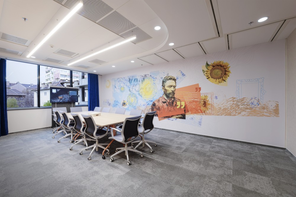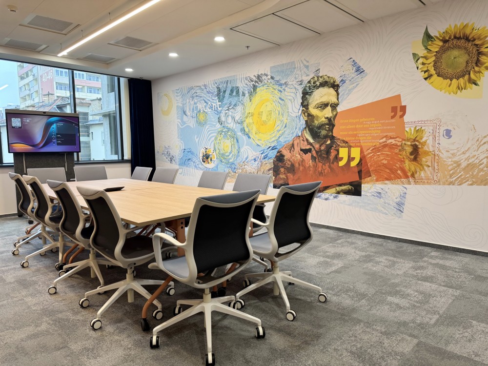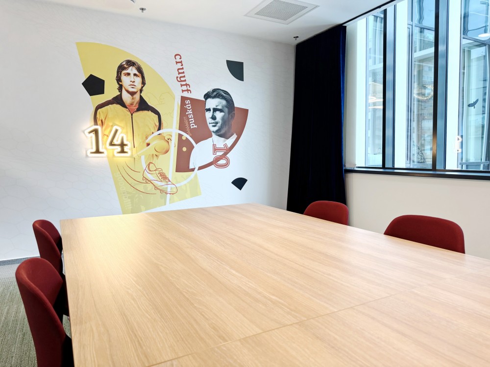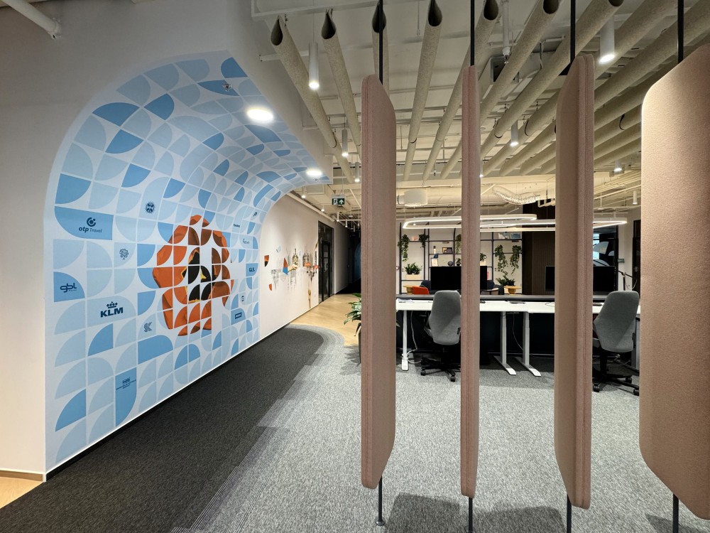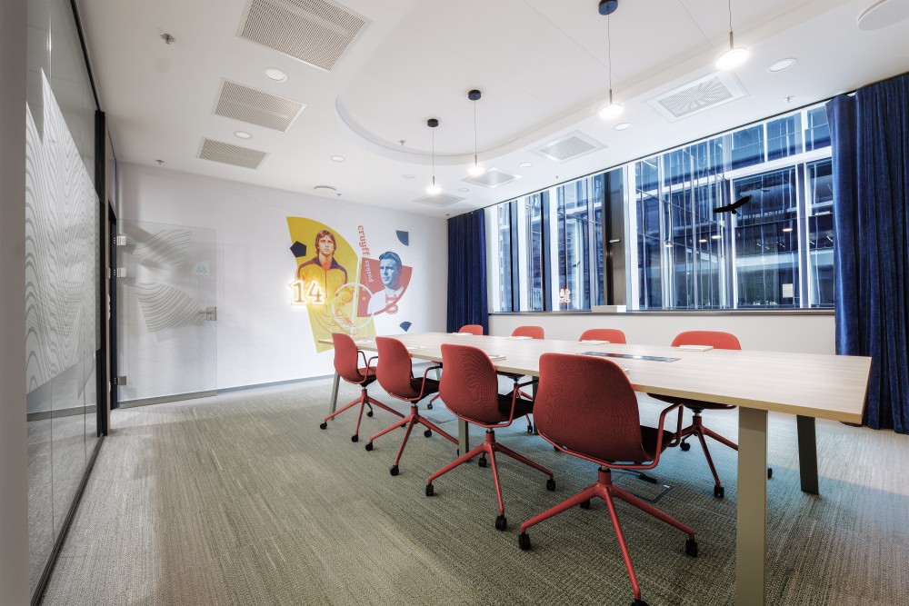A tervezést egy vállalaton belüli stakeholder-csapat kísérte végig, biztosítva, hogy minden részleg érdekei érvényesüljenek. A koncepció három fő szempontot ötvözött: fenntarthatóság, emberközpontúság és a funkcionalitáshoz való alkalmazkodás. A kialakításnál kreatív, tartalmi alapú koncepcióban gondolkodtunk, amely önmagában ad erős vizuális identitást. Így született meg az a több rétegben felépített narratíva, amely a holland és magyar kultúra, művészet, sport és gasztronómia kapcsolódási pontjait jeleníti meg a különböző kollaborációs terekben. Az egyik tárgyalóban Van Gogh és Rippl-Rónai impresszionista világa találkozik, egy másikban Max Verstappen 2023-as malőrje kerül újraértelmezésre Herendi porcelánmotívumokkal, máshol pedig Puskás Ferenc és Johan Cruyff kapott közös falat. A tematikák között megjelenik továbbá az Északi-tenger és a Balaton, a fapapucs és a csizma, vagy éppen a muskátli és a tulipán párhuzama is, játékos és edukatív módon gazdagítva a munkakörnyezetet.