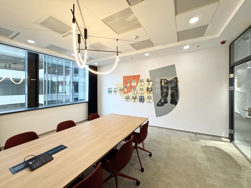 Ez a következetes formai rendszer egységbe rendezi a vizuálisan sokszínű, kulturális párhuzamokra épülő tereket, és elegáns, letisztult arculati kontinuitást teremt az iroda teljes egészében.