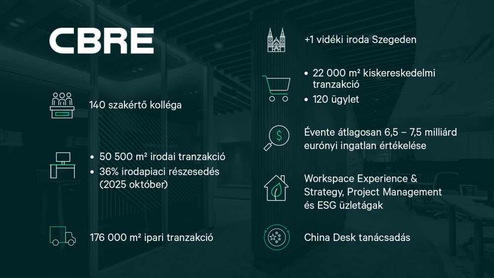 A CBRE Magyarországot két különleges tényező emeli ki a hazai ingatlanpiacon. A China Desk csapatunk kiemelten a kínai ügyfelek magyarországi törekvéseit segíti, aminek köszönhetően megerősítjük Magyarország szerepét Európa egyik kulcsfontosságú belépési pontjaként. Emellett egyedülálló a vidéki jelenlétünk, Szegedi irodánkat megnyitásával aktívan jelenléttel rendelkezünk Csongrád-Csanád megye ingatlanpiacán. A piac előtt jelentős változások és kihívások állnak, ezért építjük kapcsolatainkat fejlesztőkkel, üzemeltetőkkel és új szereplőkkel, illetve bővítjük értékesítési csatornáinkat. Ügyfeleinknek személyre szabott megoldásokat kínálunk, hogy hatékonyan támogassuk jövőbeli terveiket. A budapesti és szegedi irodák tagjai annak a több mint 500 irodának, amelynek köszönhetően a cég a Fortune 500-as listáján a 128. helyet foglalja el, és már 15 egymást követő évben a Fortune legelismertebb ingatlanközvetítő vállalatának választották.