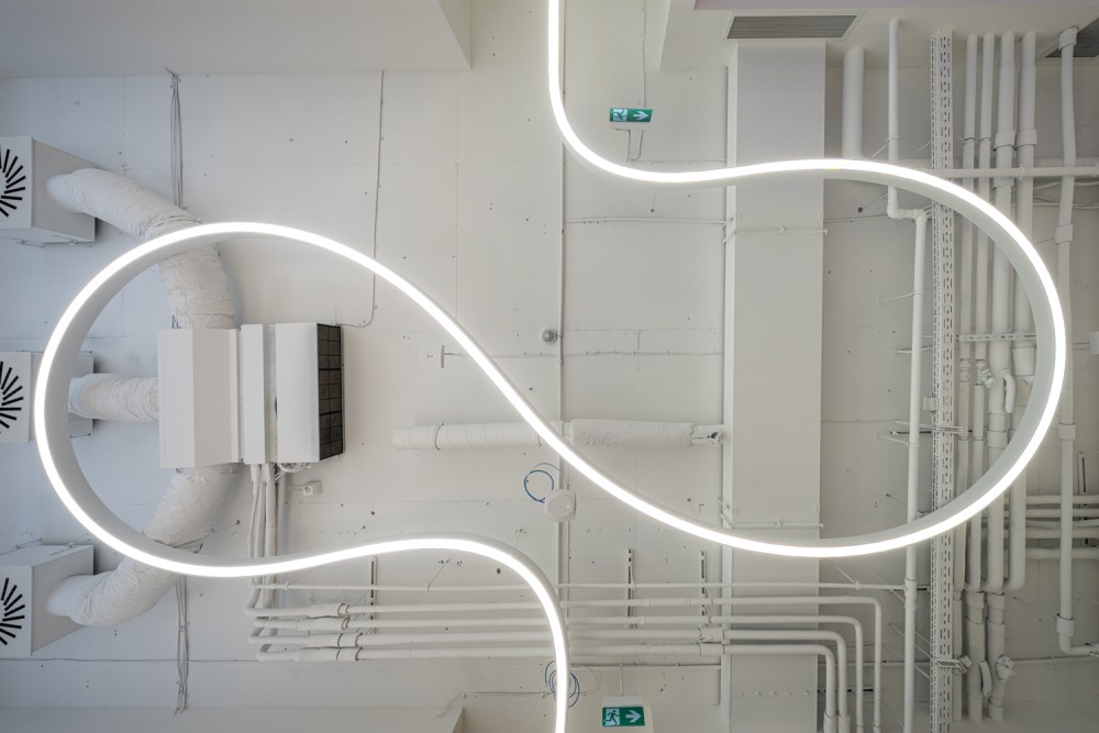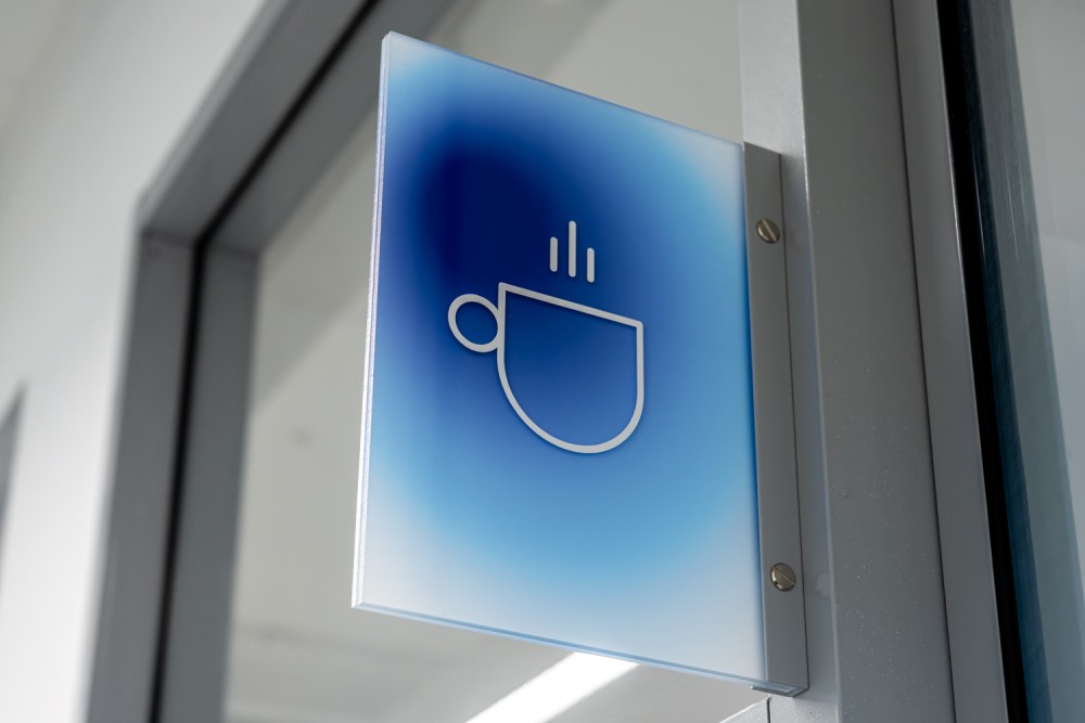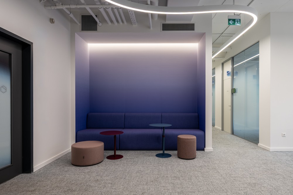 A gradiensek az akusztikus lámpatestek és paravánok színválasztásában, valamint a grafikai elemekben is megjelennek: a helyiségeket jelölő táblákon, a cég történtetét bemutató háromdimenziós idővonalon.