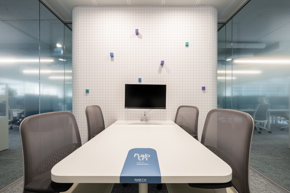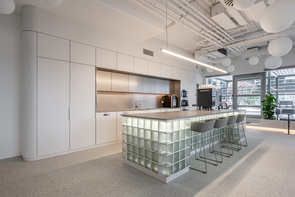 A különböző terekben a Tresorit értékei grafikai és belsőépítészeti eszközökkel is megjelennek: a tárgyalók tapétáin, a recepciós pulton és a workcafé világító üvegtégla konyhaszigetén megjelenő négyzethálós raszter a kiberteret és az adathálókat idézi, a recepció melletti egyedi vendégbútor a biztonság és transzparencia közötti átmenetet, míg a jellegzetes Link sofa a Tresorit és ügyfelei közötti szoros kapcsolatot szimbolizálja. A gradiens felületek és a felhő-szerű, egyedi tervezésű fóliával ellátott üvegfalak a zárt, biztonságos adatkezelés és a nyitott, együttműködésen alapuló működés dinamikáját jelenítik meg. A lockerek kialakítása, valamint a szomszédos tárgyalóba nyíló nagy körablak a trezorok világára reflektál.