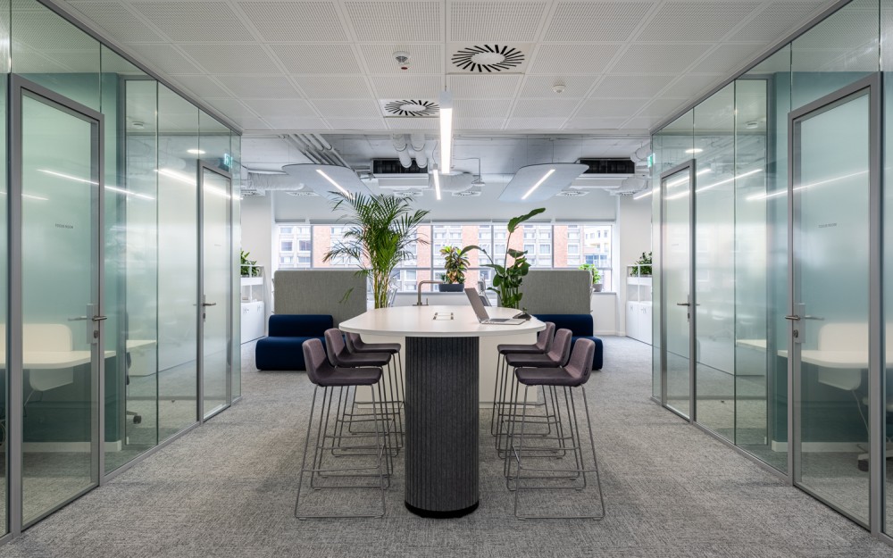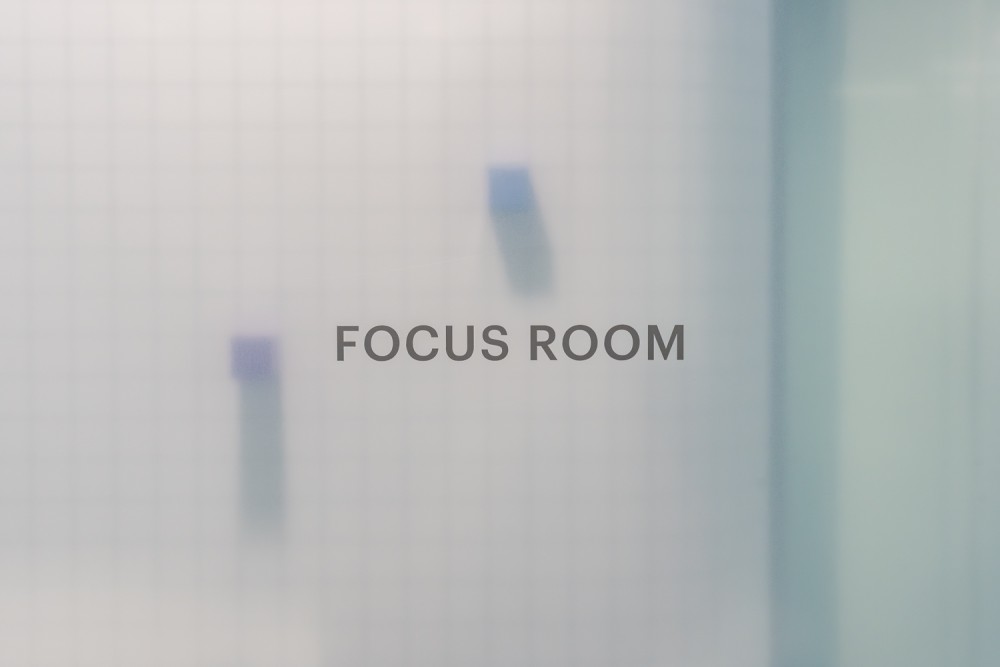 Az open office területét egy központi blokk tagolja, kis foglalható tárgyalókkal, amik egyben rugalmasan használható vezetői irodaként is szolgálnak. A zárt tömb középen áttörésre került egy átjárható közösségi térrel, amelyhez vízvételi pont és fókusz szobák kapcsolódnak, teret biztosítva a hívásokhoz és rövid idejű koncentrált munkavégzéshez. A legszélső helyiségek két ajtóval rendelkeznek: nyitásukkal plusz átjárási pont jön létre, zárásukkal pedig önálló, teljes értékű tárgyalók maradnak. Az üvegfalakat borító egyedi, félig áttetsző, gradiens fólia a cég tevékenységére is reflektálva felhőt idéz.
