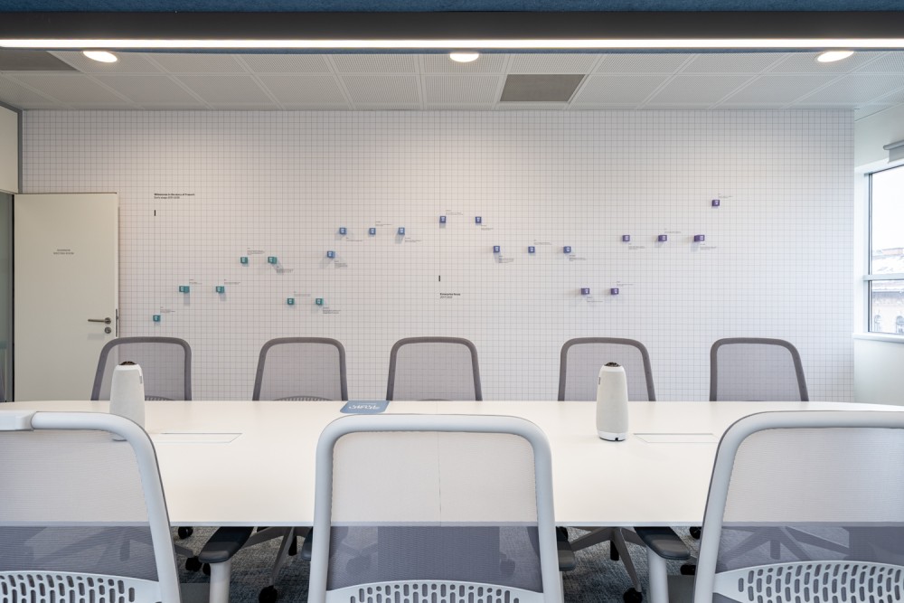 A gradiensek az akusztikus lámpatestek és paravánok színválasztásában, valamint a grafikai elemekben is megjelennek: a helyiségeket jelölő táblákon, a cég történtetét bemutató háromdimenziós idővonalon.