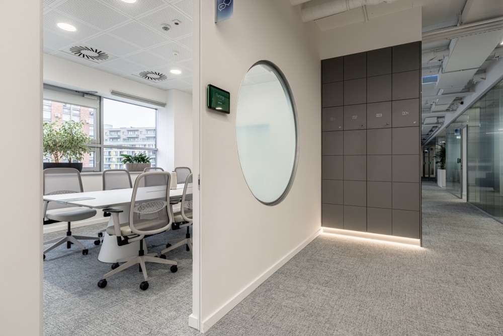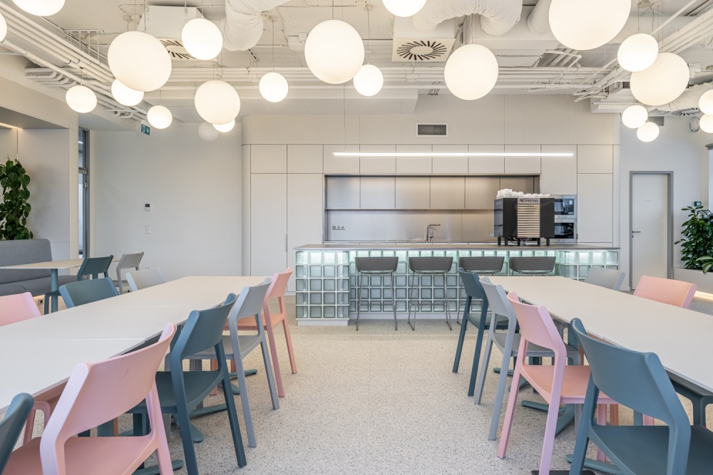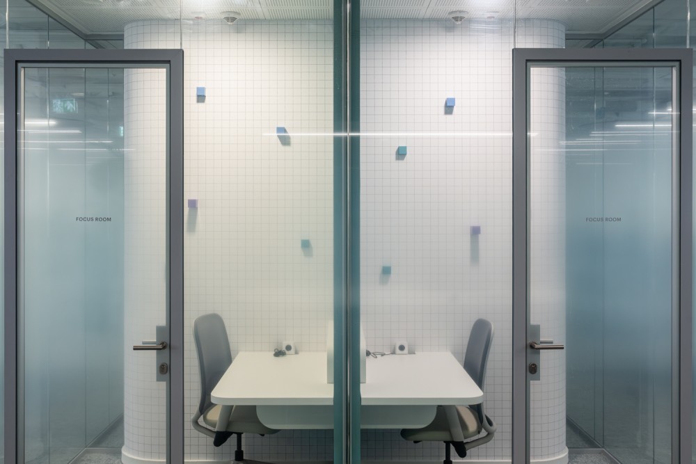 Az open office területét egy központi blokk tagolja, kis foglalható tárgyalókkal, amik egyben rugalmasan használható vezetői irodaként is szolgálnak. A zárt tömb középen áttörésre került egy átjárható közösségi térrel, amelyhez vízvételi pont és fókusz szobák kapcsolódnak, teret biztosítva a hívásokhoz és rövid idejű koncentrált munkavégzéshez. A legszélső helyiségek két ajtóval rendelkeznek: nyitásukkal plusz átjárási pont jön létre, zárásukkal pedig önálló, teljes értékű tárgyalók maradnak. Az üvegfalakat borító egyedi, félig áttetsző, gradiens fólia a cég tevékenységére is reflektálva felhőt idéz.