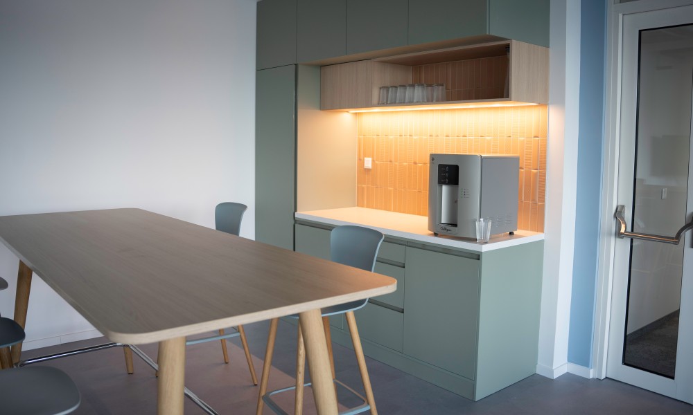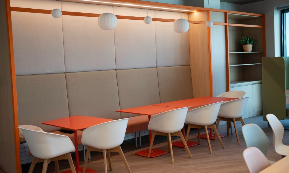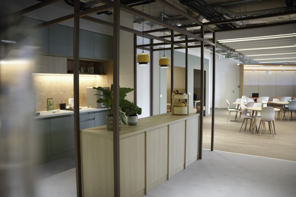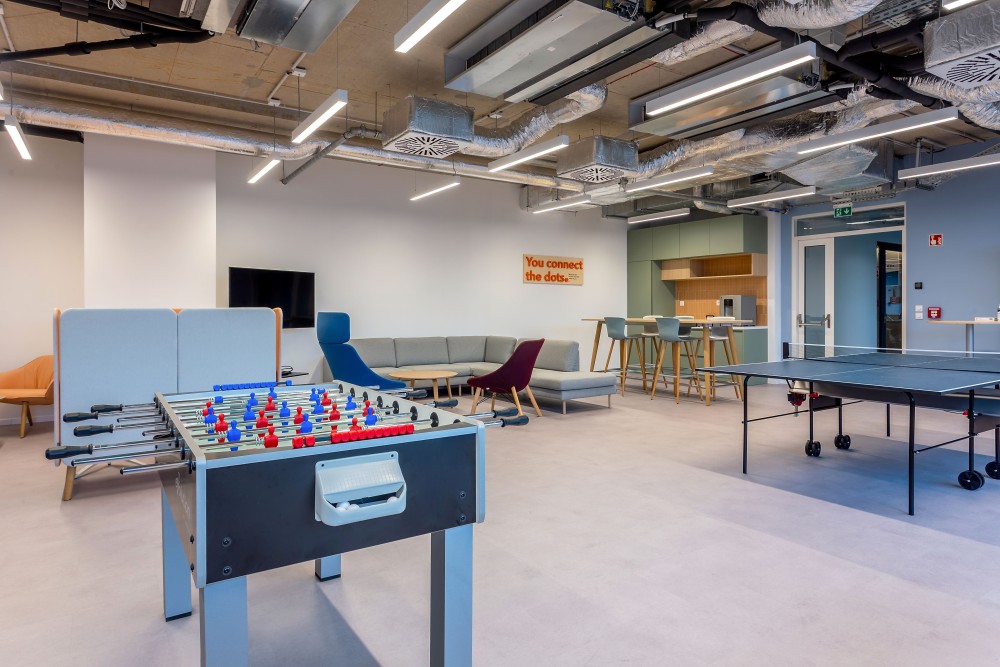 A wellbeing és a közösségi élet erősítése érdekében nagy felületet adtunk közösségi tereknek az új irodában – helyet pihenésre, kötetlen közös ebédekhez alkalmas tereket, valamint az aktív szüneteket támogató mozgás- vagy játéklehetőségeket. A két legfontosabb ilyen tér a Work Café és a multifunkcionális közösségi tér. A Work Café egy magas színvonalon kialakított tér, melyben lehet étkezni kávézni és kisebb rendezvényeink befogadására is alkalmas. Ebben a térben szívesen fogadjuk vendégeinket is, ezért a recepció mellett helyeztük el. A multifunkcionális közösségi térben kevés fix elem van, berendezése könnyen alakítható. Ide be tudnak vinni a kollégák szabadidős tevékenységeket, kisebb és nagyobb csapat meetingeket is.