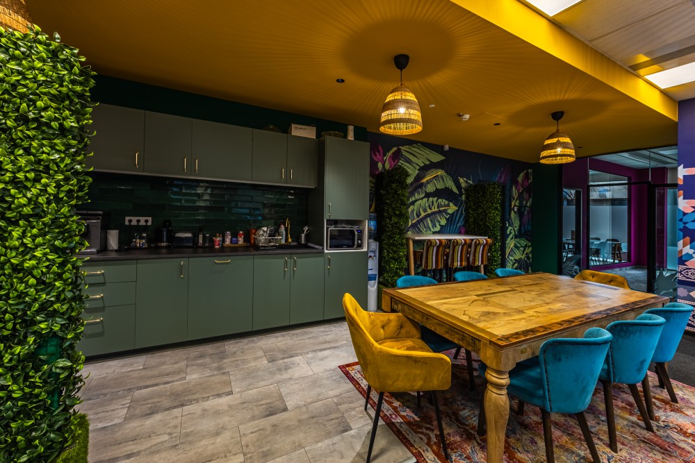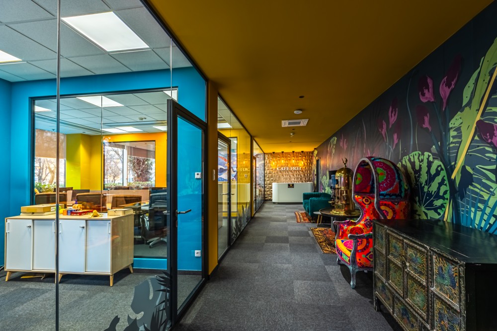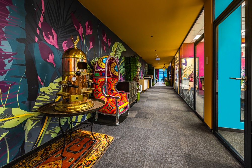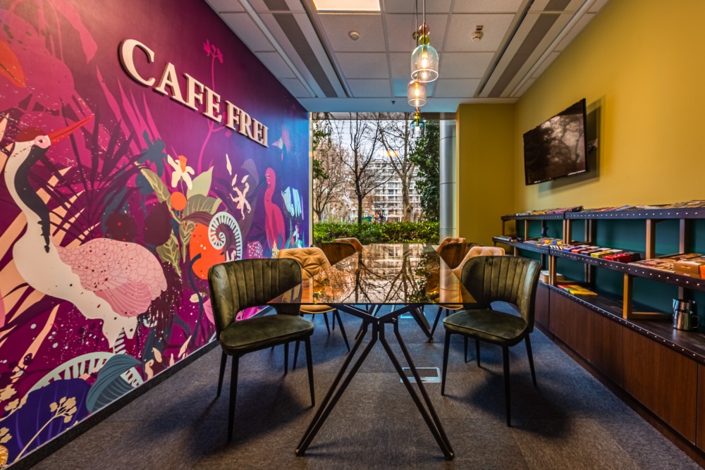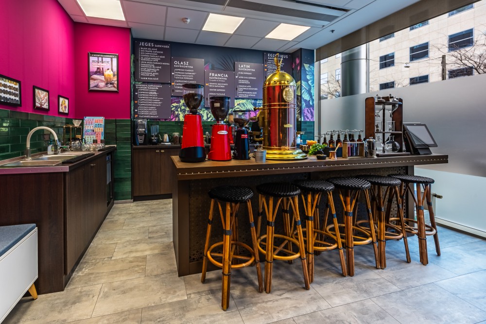 Ez nem csupán egy munkatér, hanem egy kreatív közeg, ahol kollégáink szabadon alkothatnak. Az enteriőr minden részlete a márka filozófiáját tükrözi: a világ kávékultúrájának sokszínűségét, az egzotikumot, a kalandot, a fenntarthatóság iránti elkötelezettséget és az innovációt. A vibráló színek, egyedi grafikájú faldekorációk és természetes fényben úszó terek olyan atmoszférát teremtenek, amely ösztönzi a kreativitást és a közösségi élményt.