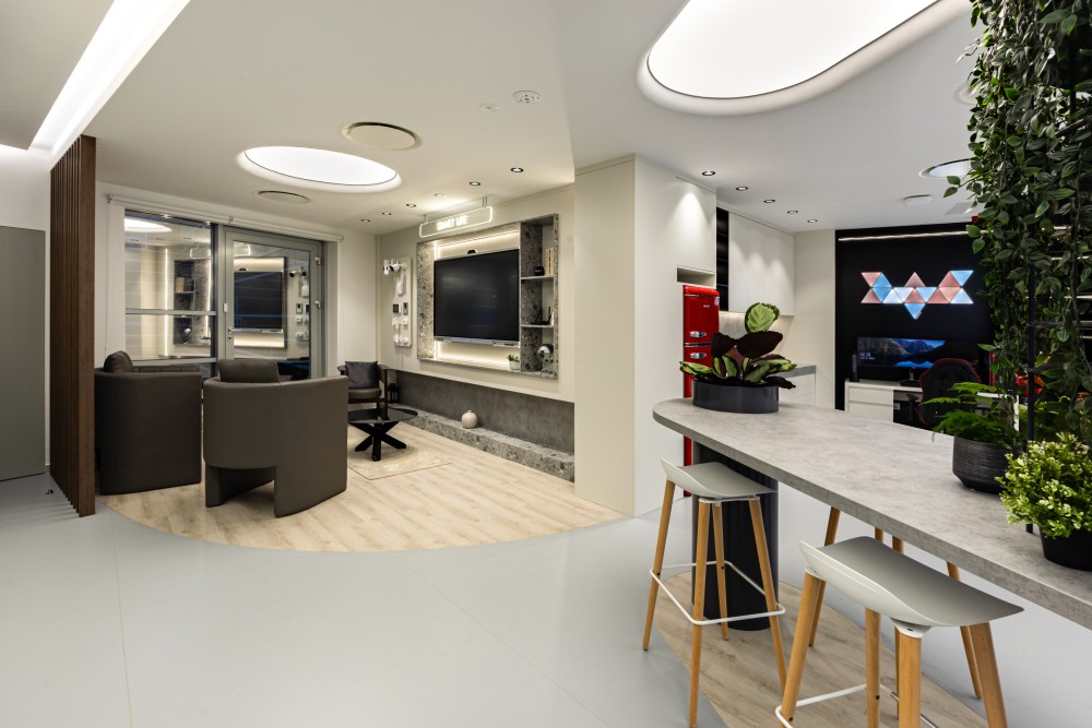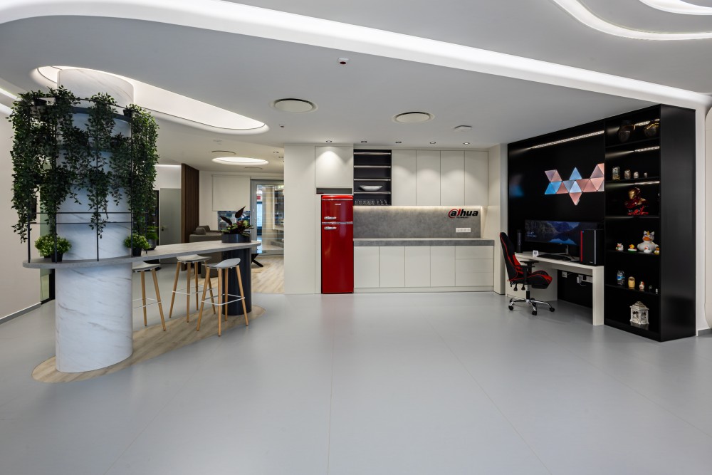 Az iroda különlegessége a bemutató- és élménytér, ahol a legmodernebb biztonságtechnikai és okos megoldások kaptak helyet. Interaktív installációk, digitális kijelzők és élő demók biztosítják, hogy a látogatók és partnerek testközelből tapasztalhassák meg a Dahua innovációit. A tágas, világos terek ergonomikus bútorokkal és rugalmas elrendezéssel segítik a hatékony munkavégzést, míg a közösségi zónák és tárgyalók a csapatmunka és a kreatív ötletelés színterei.