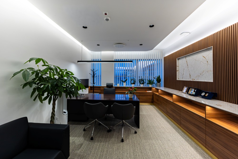 A fenntarthatóság kiemelt szerepet kapott a tervezés során: energiatakarékos világítás, korszerű HVAC rendszerek és környezettudatos anyaghasználat gondoskodik arról, hogy az iroda ne csak esztétikus, hanem felelős is legyen. A természetes fény és a zöld elemek harmóniát teremtenek a high-tech környezetben, így a tér egyszerre modern és emberközeli.