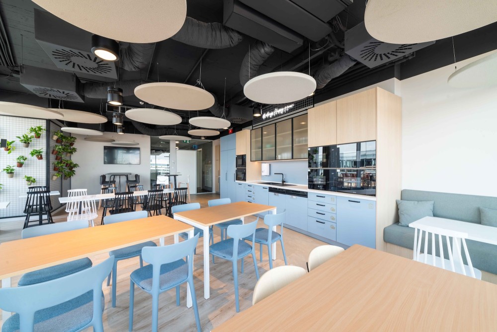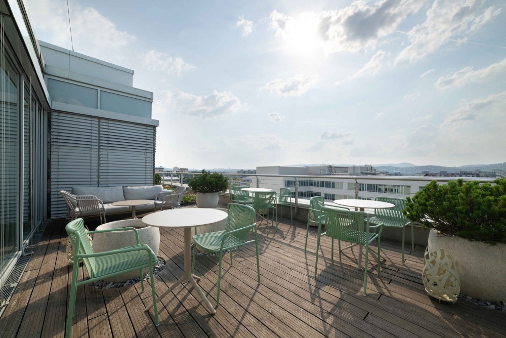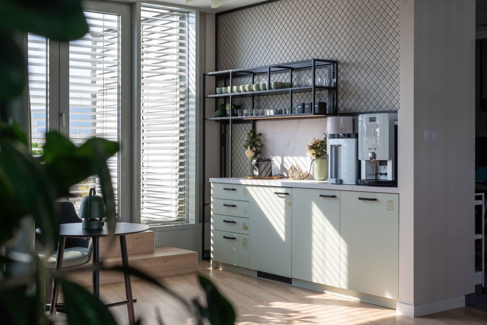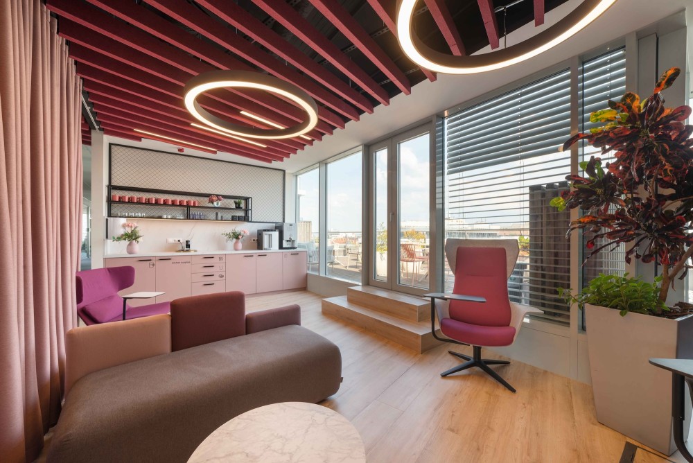 A projekt egyik különlegessége, hogy a közösségi tereket nem a teraszokhoz igazítottuk — épp fordítva történt: a terasz „mozdult” a közösségi funkció mellé: a meglévő teraszburkolatot és növényeket áthelyeztük, és egy új külső teret alakítottunk ki közvetlenül a konyhához kapcsolva. Így a dolgozókat egy egységes közösségi tengely fogadja, ahol a belső tér a külső térrel egészül ki.