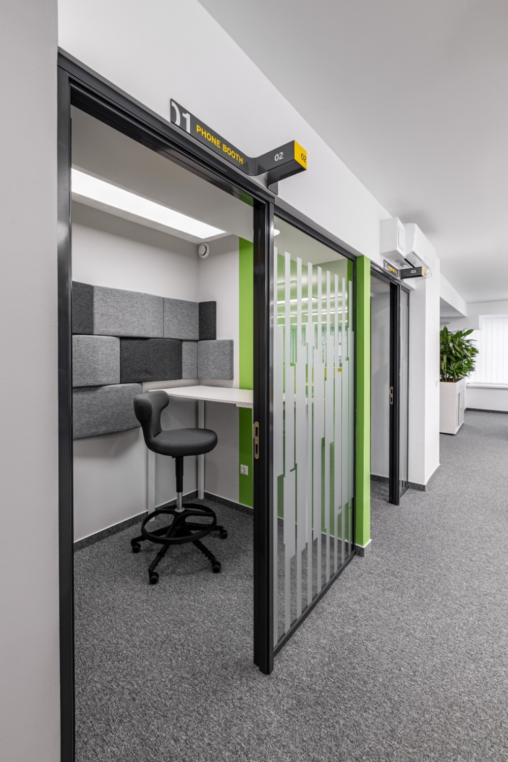 Alapvetőnek tartottuk, hogy olyan inspiráló környezetet alakítsunk ki, ahol amellett, hogy maximálisan a feladatainkra tudunk fókuszálni, kikapcsolódásra vagy szükség esetén feltöltődésre is lehetőségünk lesz. Rugalmas munkaidőben dolgozunk, ezért több mint 100 egyenértékű munkaállomás és clean desk policy teszi lehetővé, hogy bárki megtalálja a számára legmegfelelőbb helyet. A 10 különböző méretű tárgyaló a csapatmunkát és az ügyfélkapcsolataink további mélyítését segítik, míg a 6 irodai akusztikus telefonfülke vagy más néven tárgyaló boksz szolgálja a lehető legcsendesebb környezet elérését, ezáltal segíti az egyéni, koncentrált munkavégzést és a zavartalan telefon- vagy videóhívásokat.