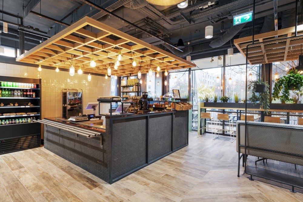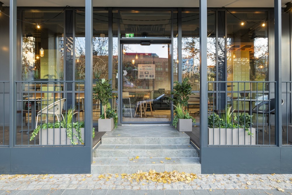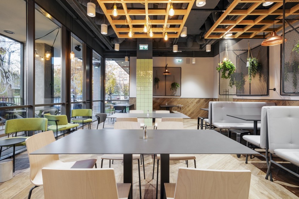 A 180 m2-es belső alapterületen és az ehhez tartozó külső teraszon számos különböző leülési lehetőség került kialakításra: a homlokzati üvegfal mentén elhelyezett magas asztalok kiválóan alkalmasak egy gyors EBÉD, vagy kávé elfogyasztására, míg a foteles beülős helyek kényelmes lehetőséget biztosítanak egy-egy INFORMÁLIS MEGBESZÉLÉS lebonyolítására is. A bejárat közelében elhelyezett, szabálytalan formájú magas pult az integrált kaspós növénnyel KÖTETLEN HANGULATOT teremt.