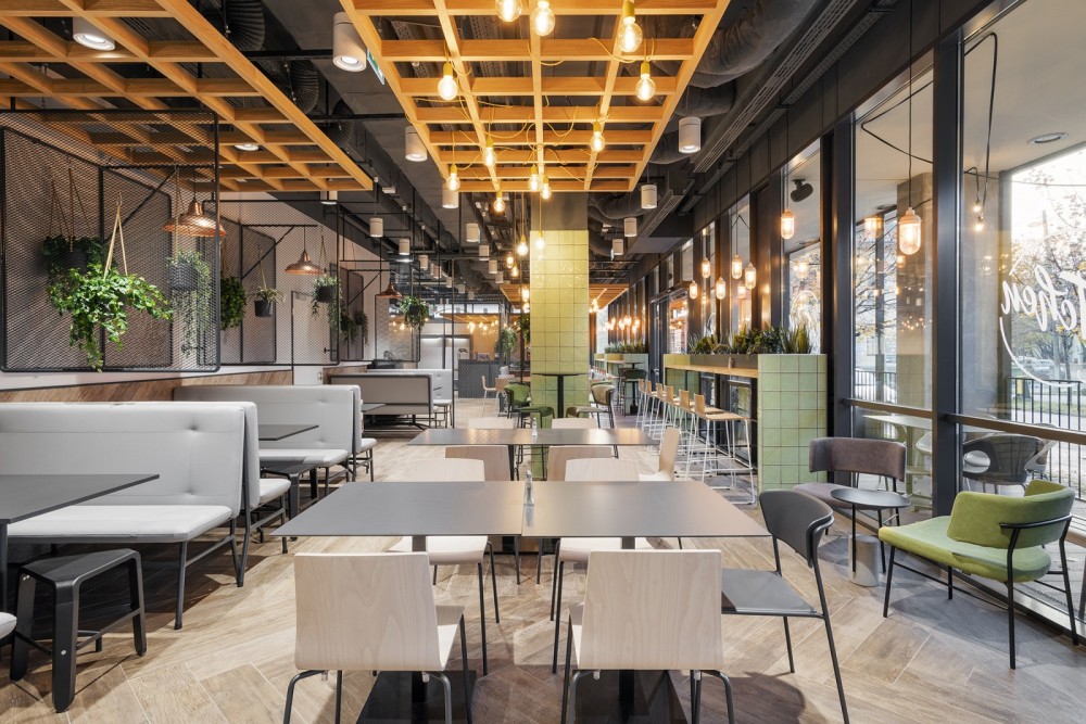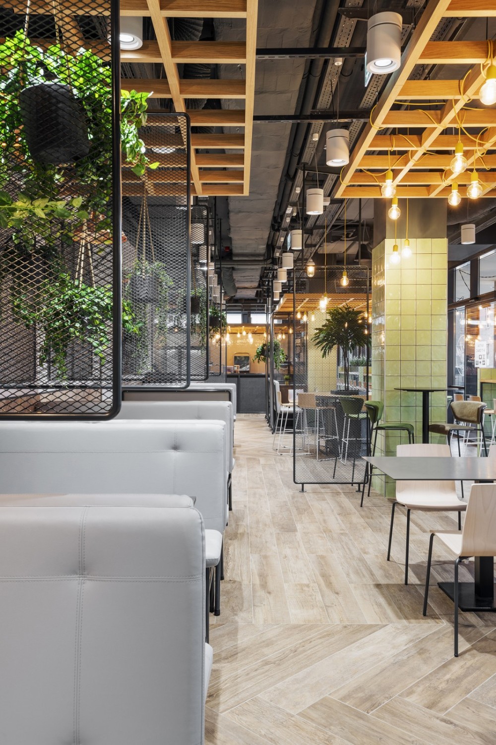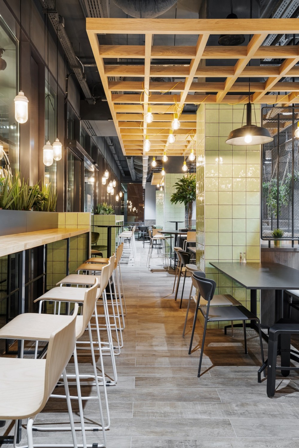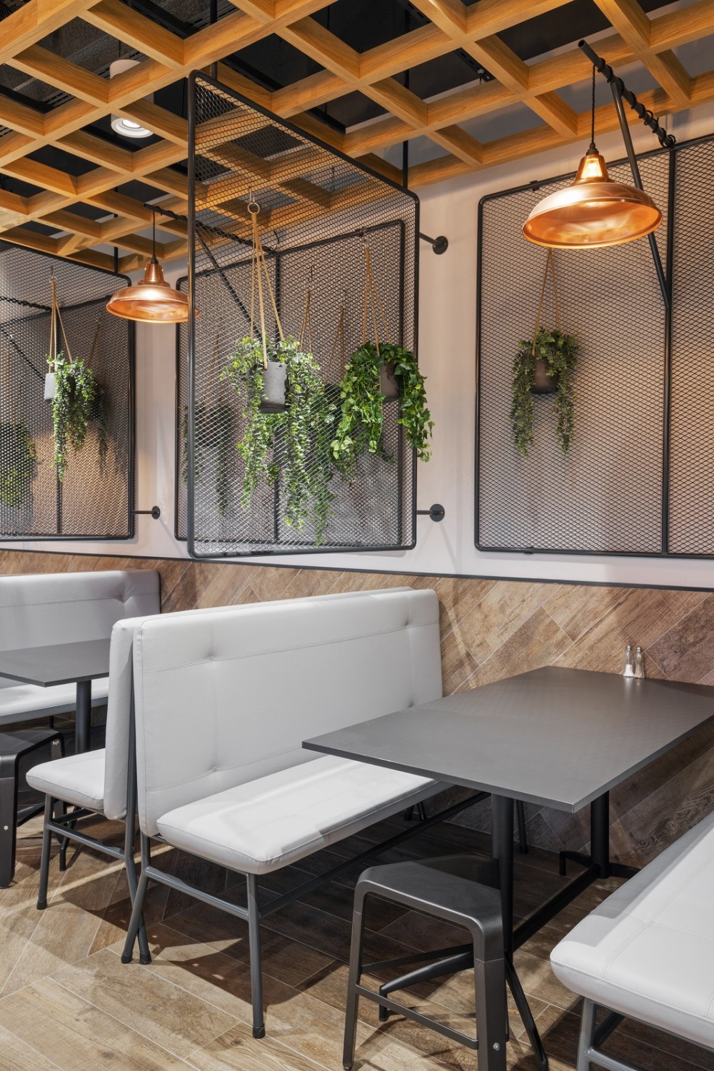 A dizájn és az anyaghasználat INDUSZTRIÁLIS stílusjegyekből építkezik. A szürkére festett látszó gépészetet lebegő farács lemezek teszik barátságosabbá. A fahatású kerámia és festett fémlemez felületeket, a halványzöld csempe pillérburkolatok és a bronz kiegészítők ellenpontozzák. Az áttört fémrácsokon, asztalokon és pultokon elhelyezett növények tovább oldják a tér hangulatát.