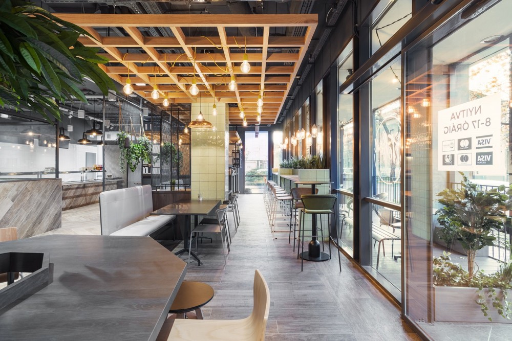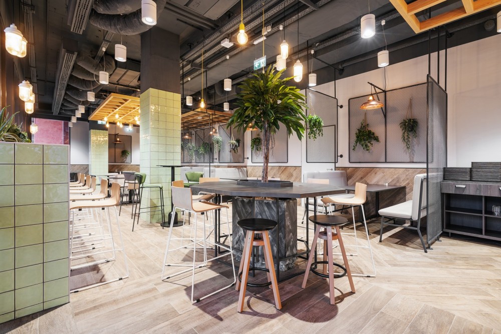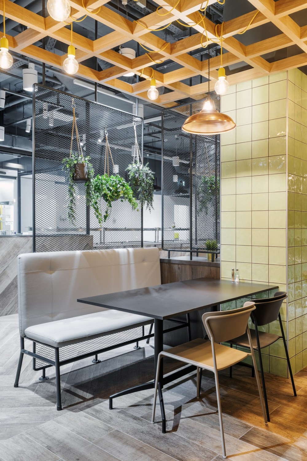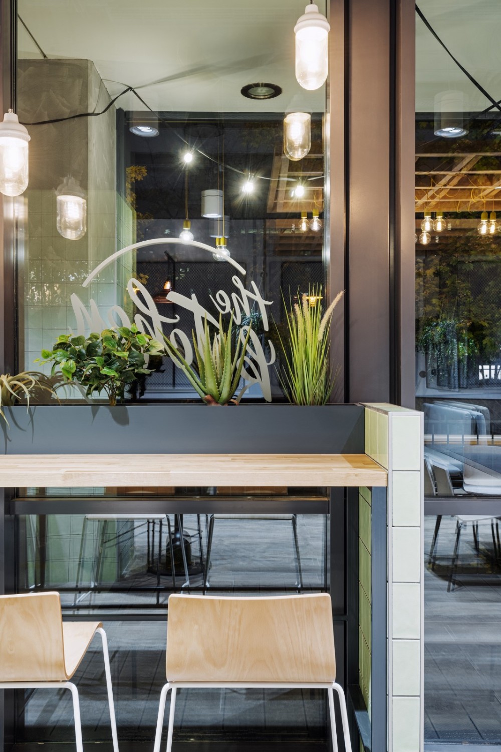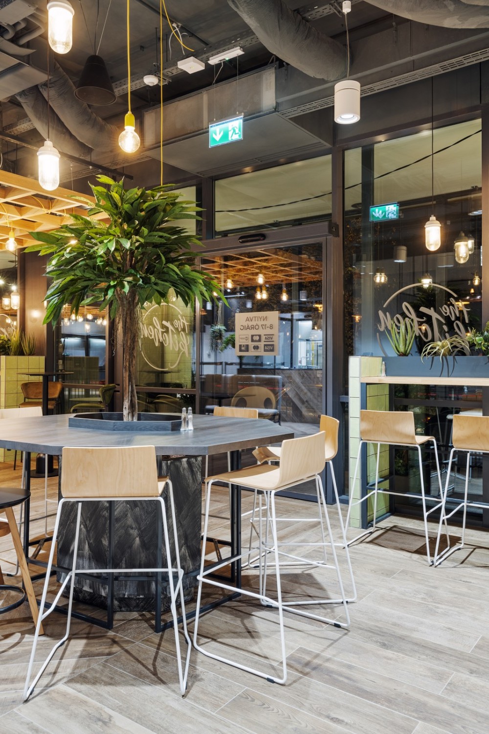 A dizájn és az anyaghasználat INDUSZTRIÁLIS stílusjegyekből építkezik. A szürkére festett látszó gépészetet lebegő farács lemezek teszik barátságosabbá. A fahatású kerámia és festett fémlemez felületeket, a halványzöld csempe pillérburkolatok és a bronz kiegészítők ellenpontozzák. Az áttört fémrácsokon, asztalokon és pultokon elhelyezett növények tovább oldják a tér hangulatát.
