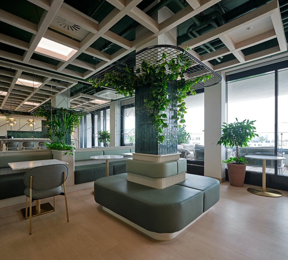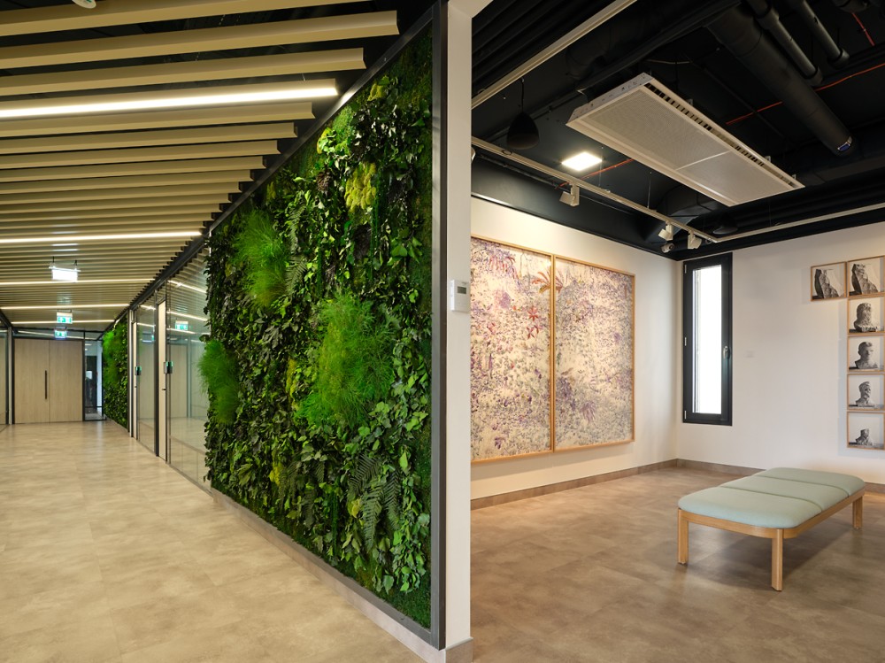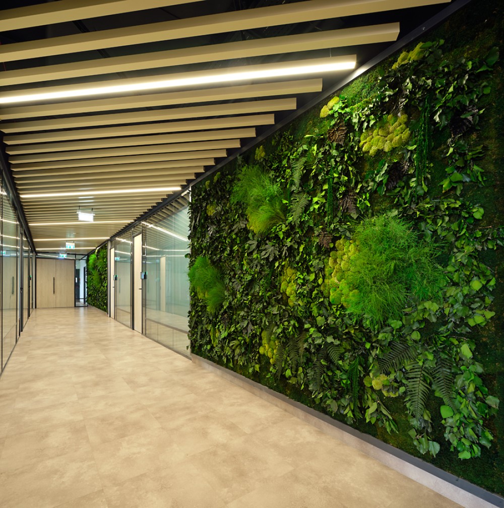 – Jelentős beltéri növényzet, mohafalak és zöldfelületek biztosítják a jó közérzetet és javítják a levegő minőségét.