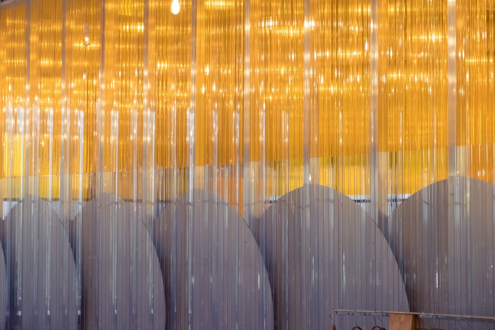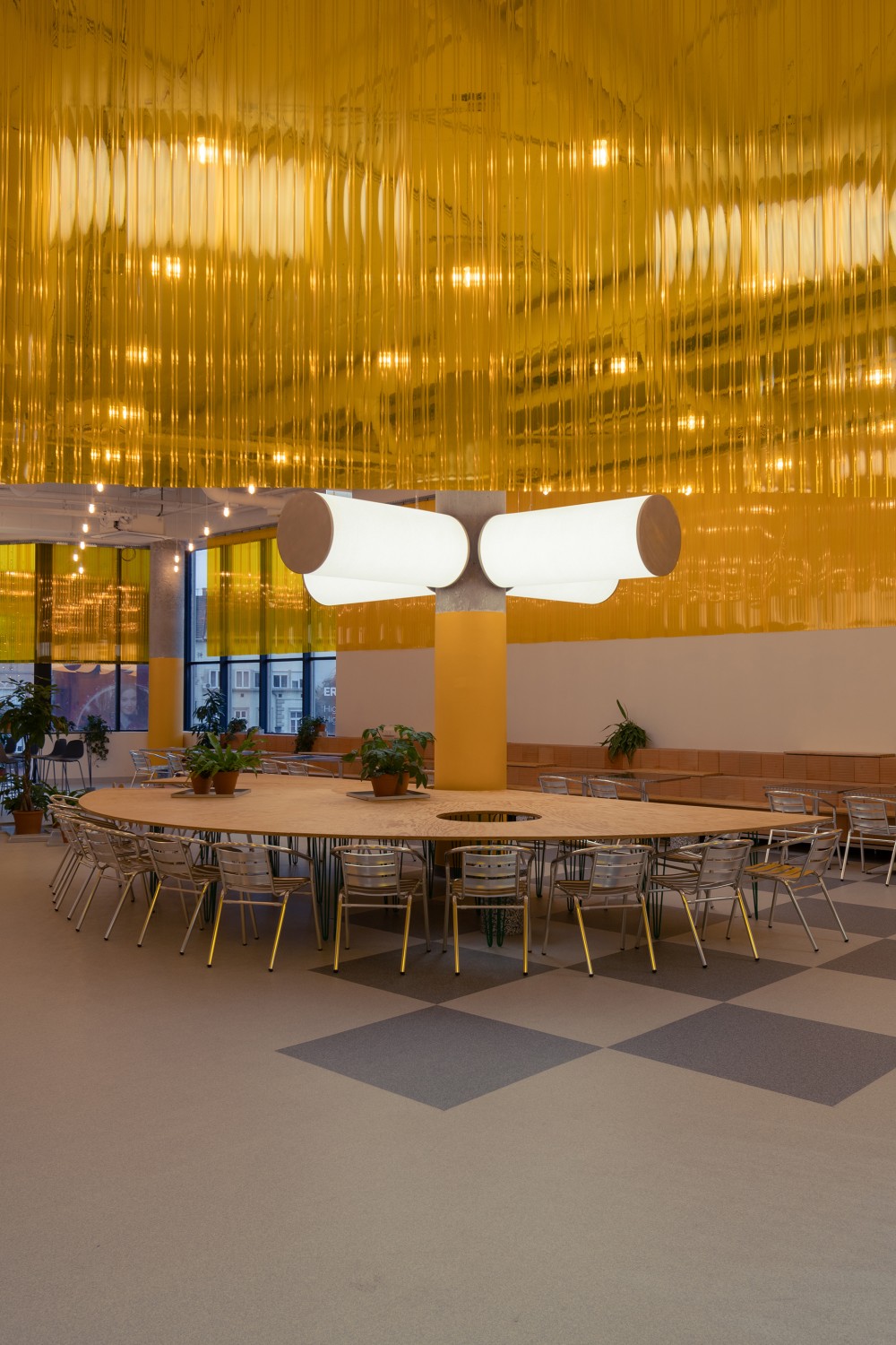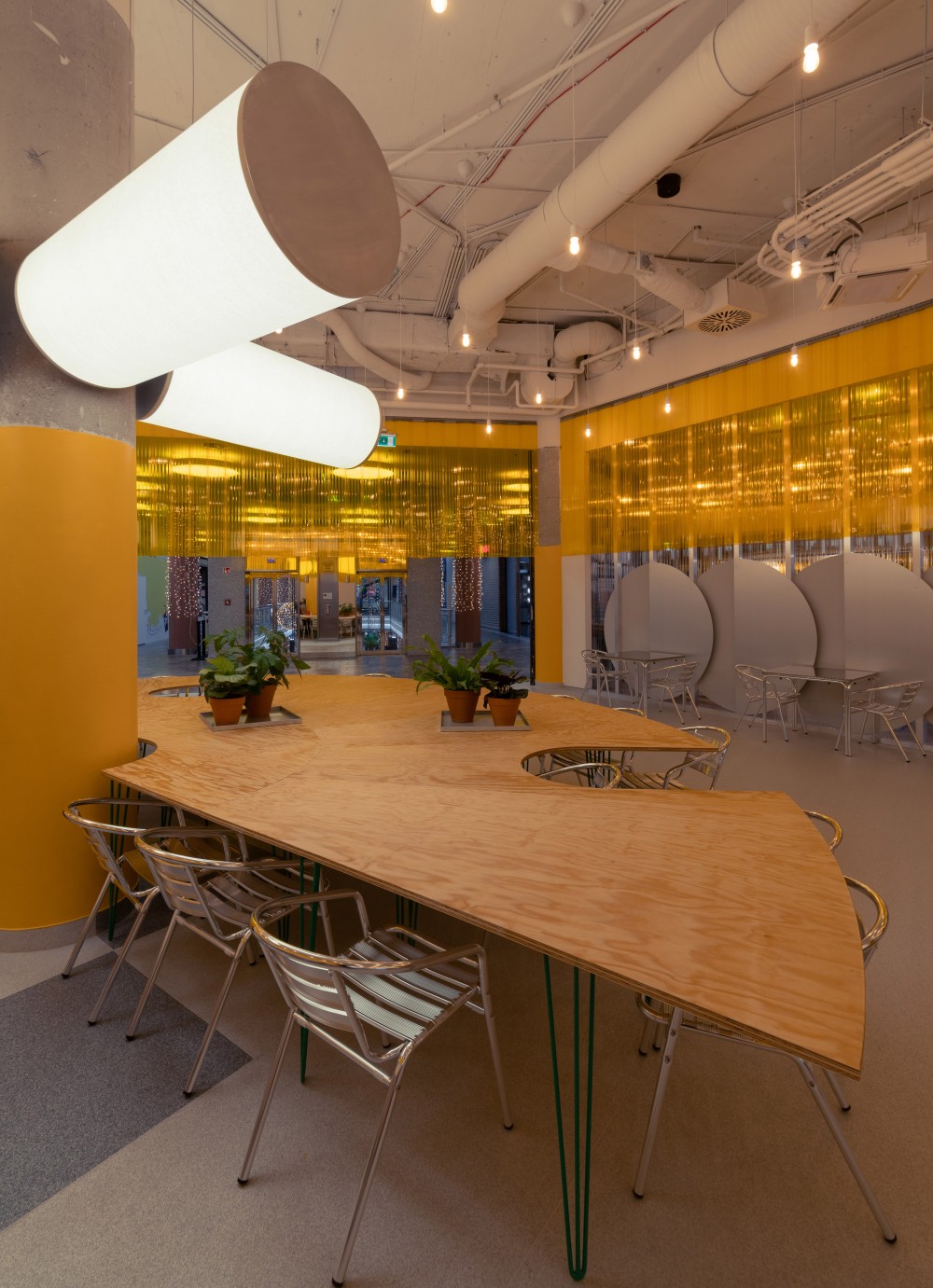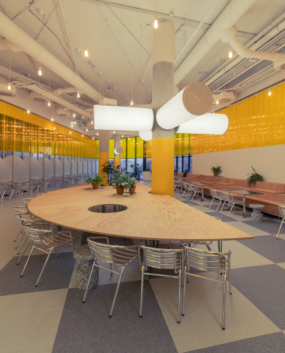 A nagy hengeres világító elemek az általános világítás mellett a borús napokon is napfény hőmérsékletével megegyező fényt árasztanak. A térben található pillérek méretével egyező formájuk pedig hozzájárulnak ehhez a természetességhez és elemelkednek az átlagos világítóelemektől. Ezek a lámpatestek jól értelemben uralják a tér hangulatát.