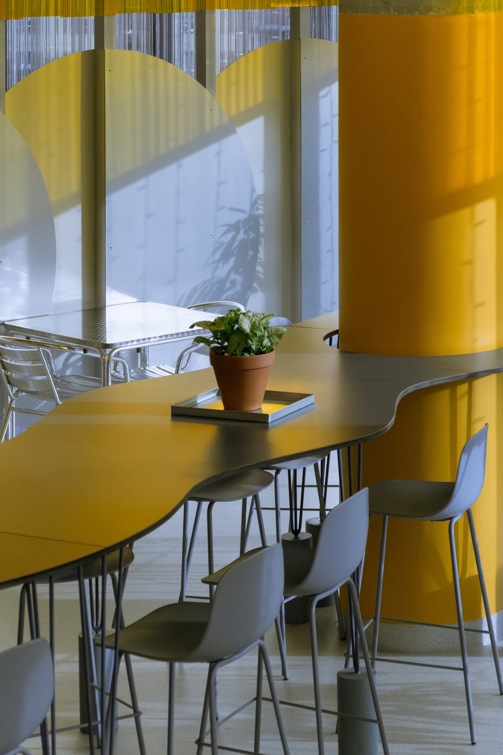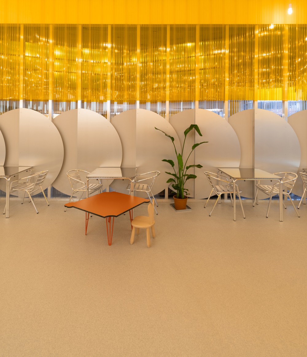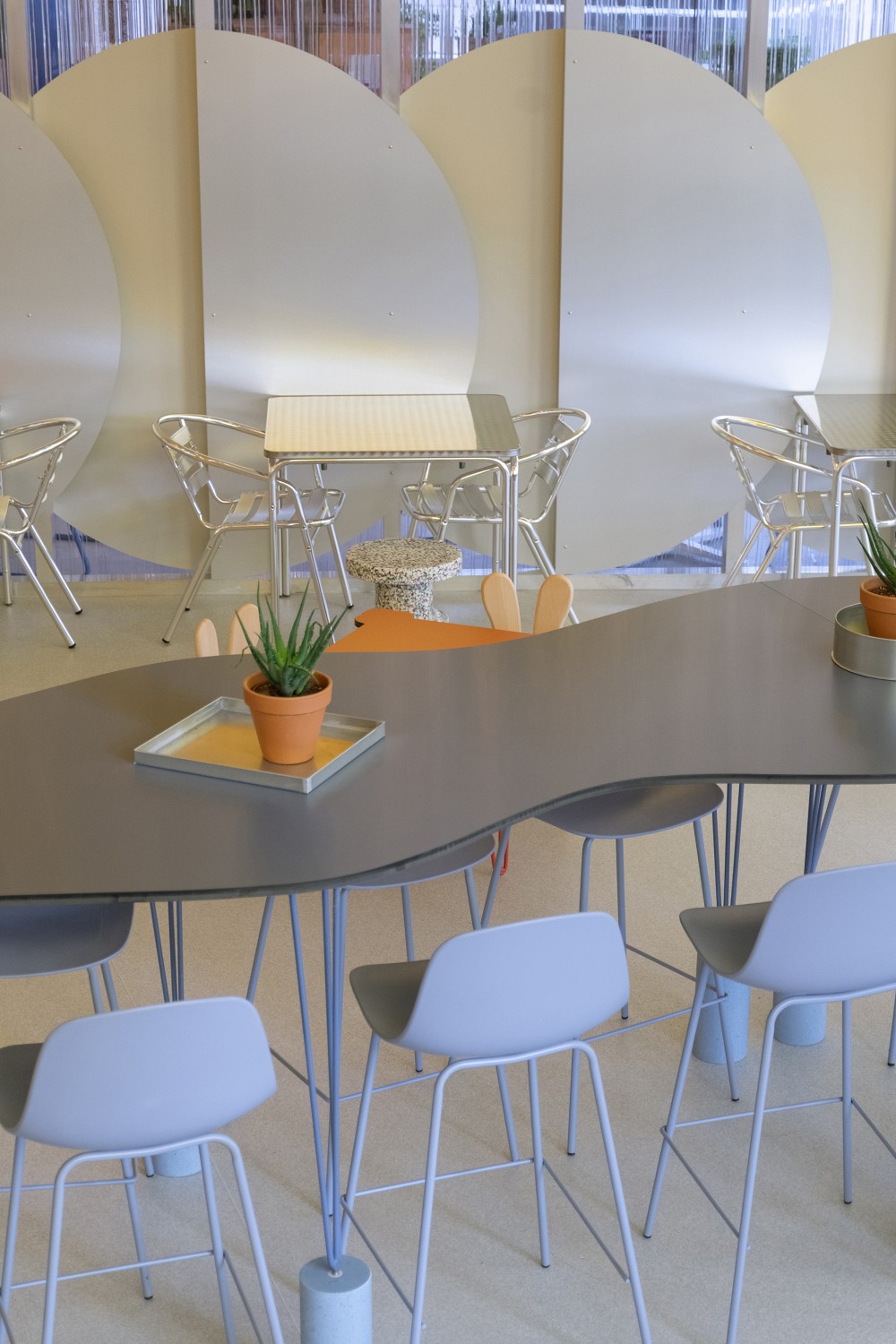 A három fix bútorelem között hagyományosabb fém asztalok és karosszékek kaptak helyet, azok számára, akik a megszokott ülésformát részesítik előnyben. Fontos szempont volt, hogy a Mammutot sok idős ember is látogatja és számunkra biztosítani akartuk a megszokott körülményeket is.
