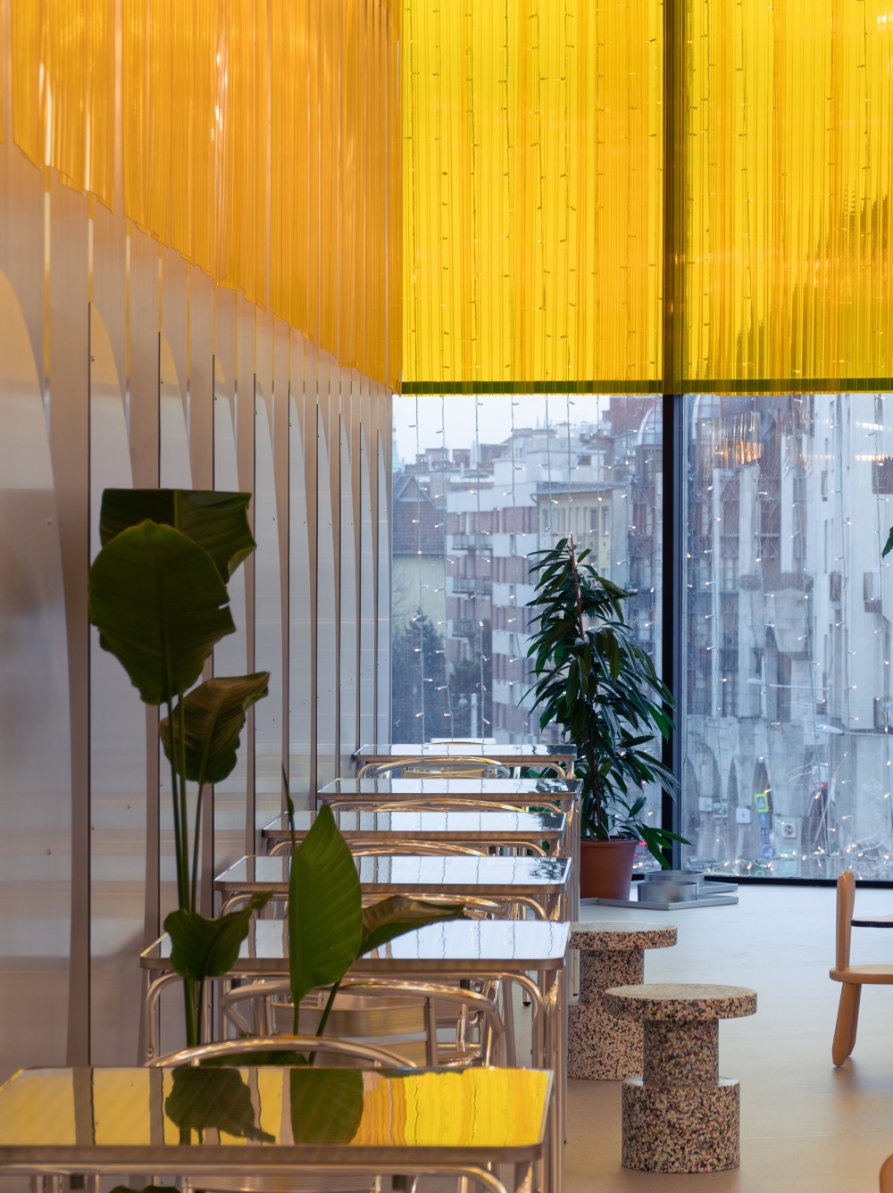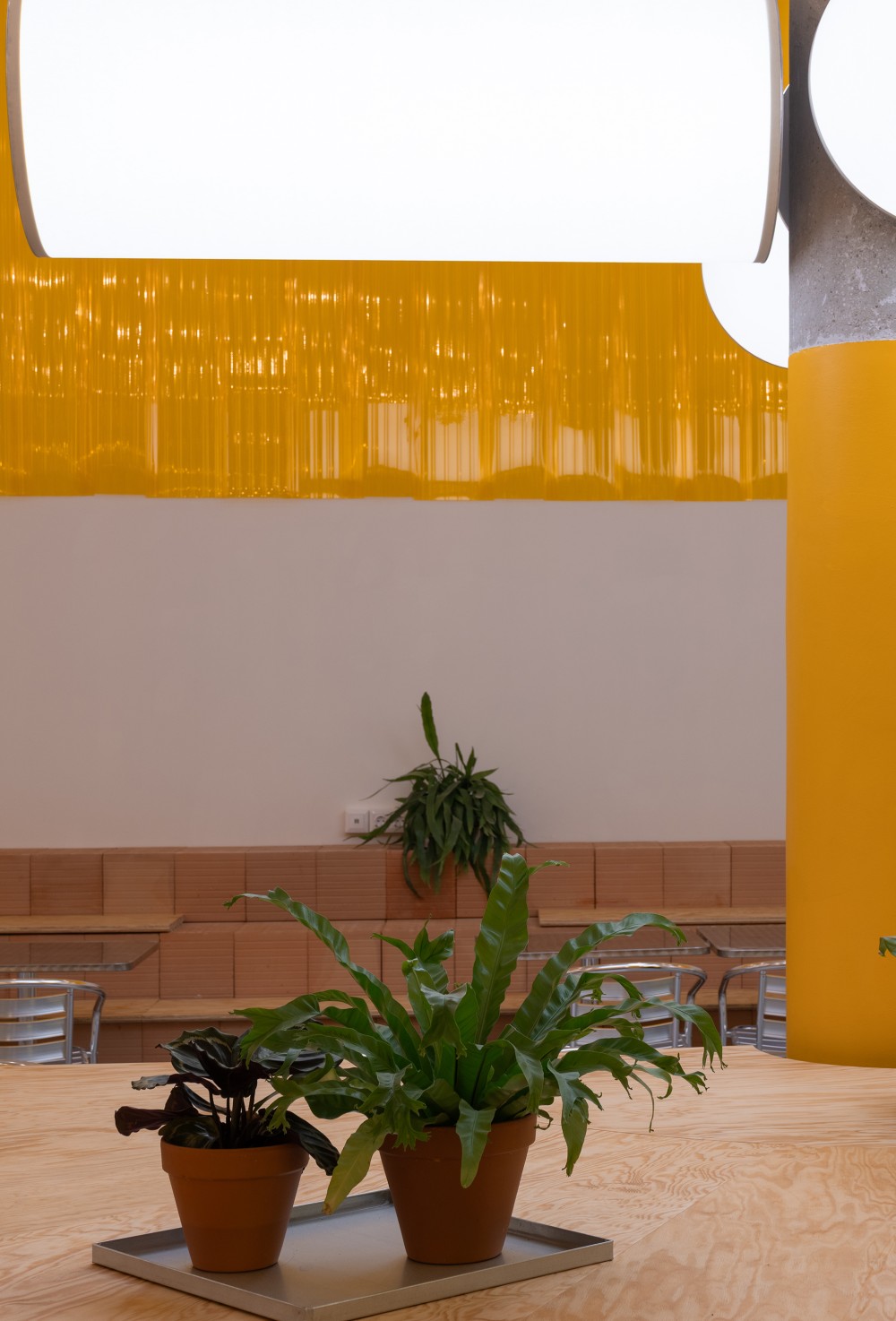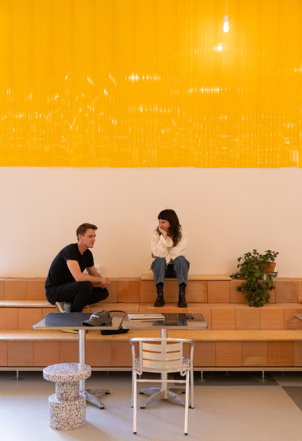 A három fix bútorelem között hagyományosabb fém asztalok és karosszékek kaptak helyet, azok számára, akik a megszokott ülésformát részesítik előnyben. Fontos szempont volt, hogy a Mammutot sok idős ember is látogatja és számunkra biztosítani akartuk a megszokott körülményeket is.