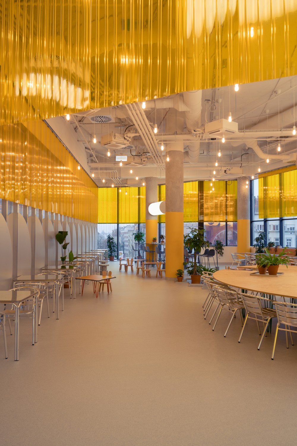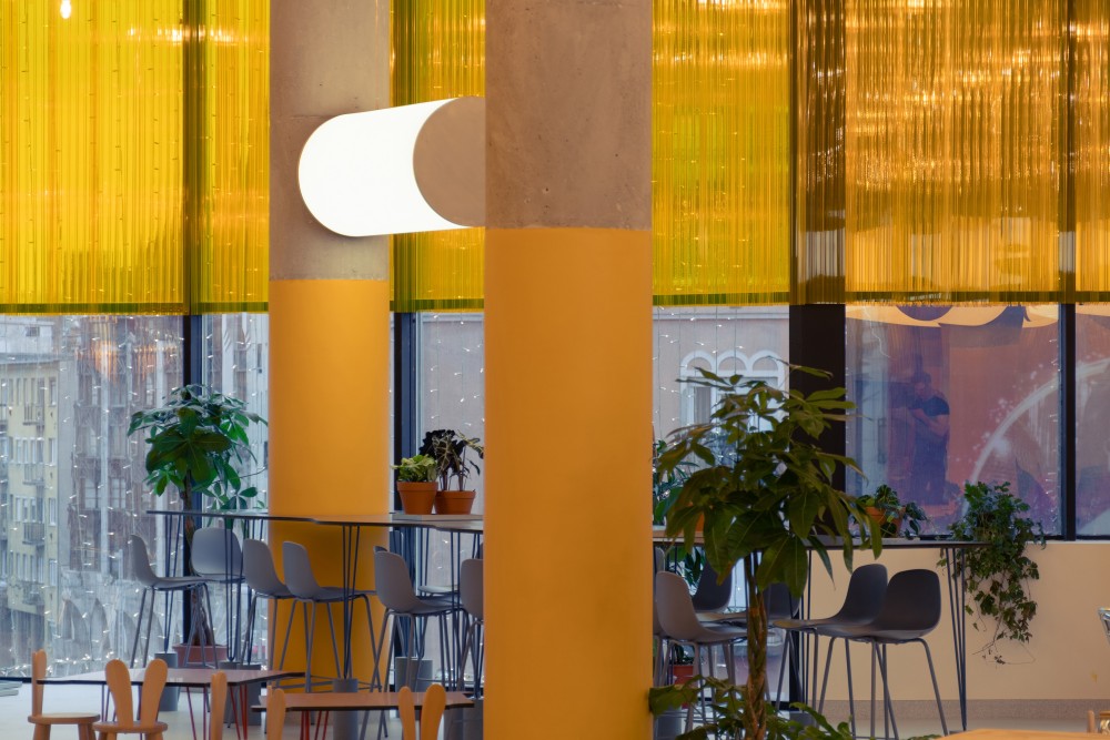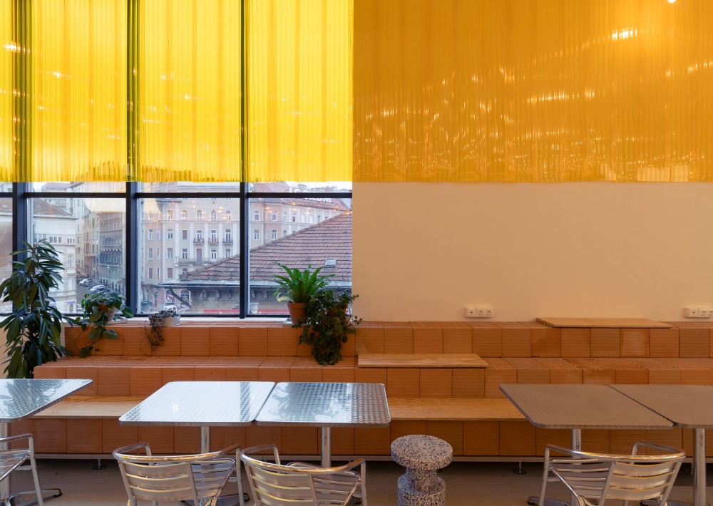 Az ételudvart a Kollabtól elválasztó fal, légies, könnyed karaktere az első pillanattól fontos volt a projekt minden szereplőjének. Így nem éles határ választja el a két teret egymástól. Ennek köszönhetően mind a Kollab, mind pedig az ételudvar tágasabbnak hat, az egybefüggő panoráma ablak pedig egységesebb hatást kelt.