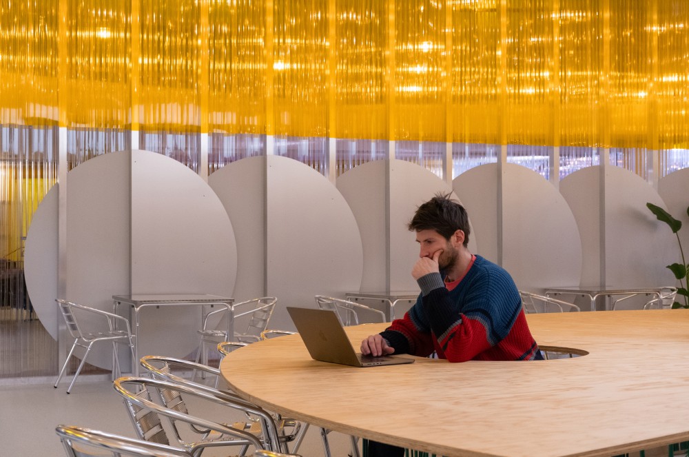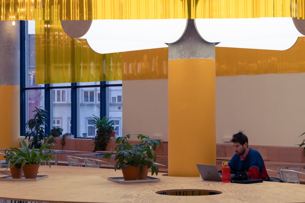 A 192 négyzetméteres tér maximum 94 ülőhelyet kínál, ami a budapesti foodcourtok átlagánál jóval szellősebb környezetet eredményez. Itt nem egymás könyökét lökdösve kell helyet foglalni. Ez a tudatos korlátozás teszi lehetővé, hogy a tér túlmutasson az étkezés funkcióján, és helyet adjon másféle időtöltéseknek és akár munkának is. Mivel az ételudvar elsősorban csak csúcsidőben telik meg, a multifunkcionalitás kiemelt szempont volt.