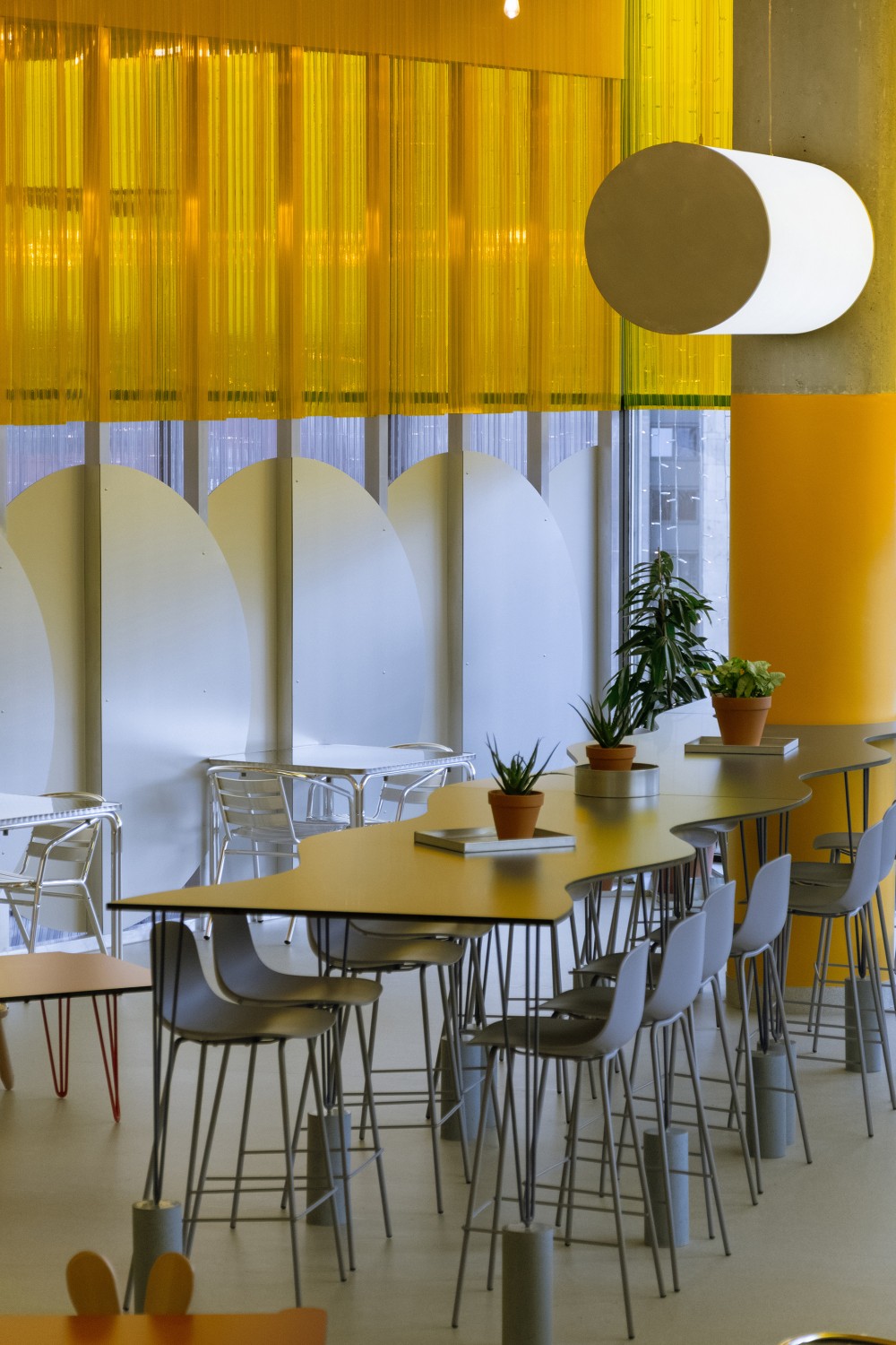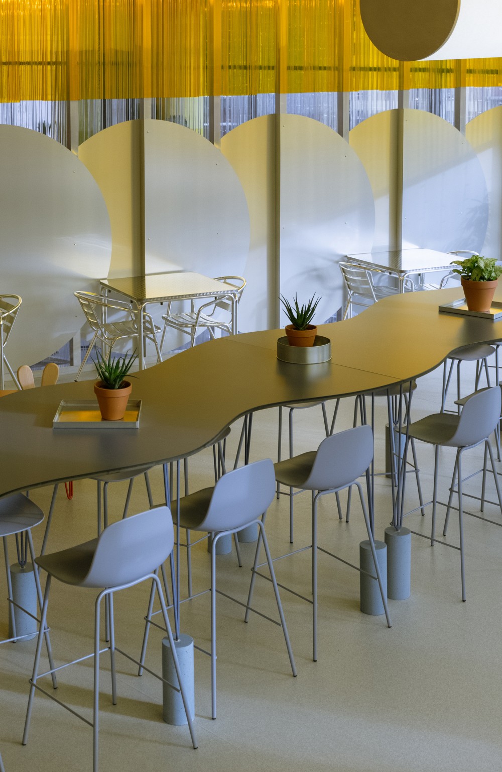 A hátsó részben elhelyezett emelt bárasztal hullámzó formája különböző közelségbe hozza az egymással szemben ülőket, magasabb kialakítása pedig a panorámát is jobban érvényesíti.