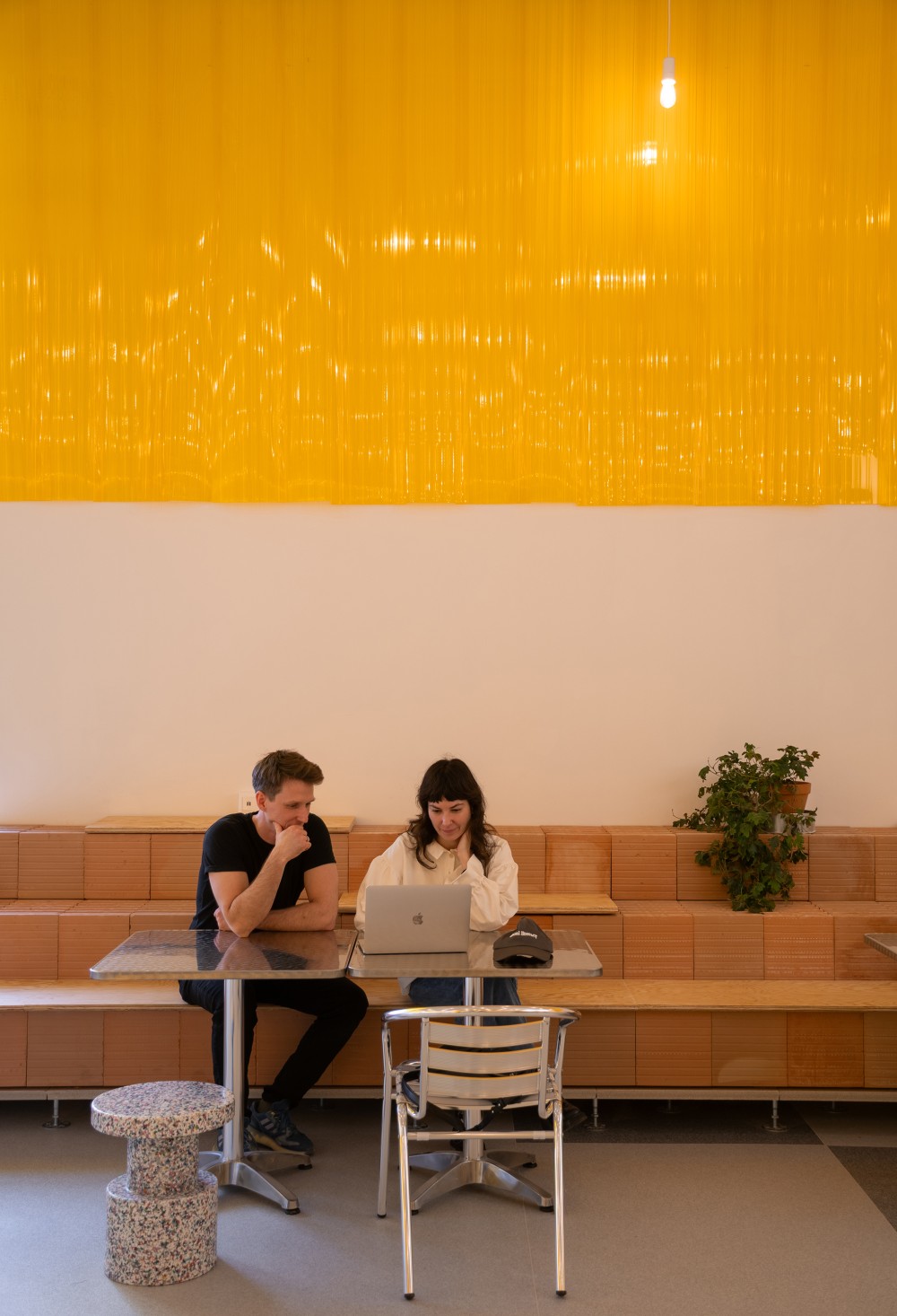 A bel-budai közönség részéről évek óta látszik az igény arra, hogy egy bevásárlóközponton belül, de annak hagyományos környezetétől elkülönülve találjanak közösségi munkatereket. Ennek jó példája a 2023-ban megvalósult, az ételudvar mellett található Kollab, amely hasonló esztétikai elvek mentén készült, és azóta is fenntarthatóan működik. Ezért már a tervezés első lépéseitől kezdve világos volt, hogy a Kollab világát érdemes továbbgondolni, majd az ételudvar igényeihez igazítva magasabb minőségben megvalósítani. Ez főleg az anyaghasználatban és a használati módok bővítésében jelent meg, miközben a nyers, őszinte felületek – amelyek élesen eltérnek a szokványos plázadizájntól – megmaradtak.