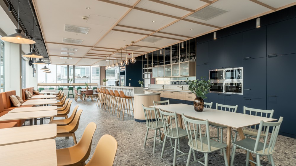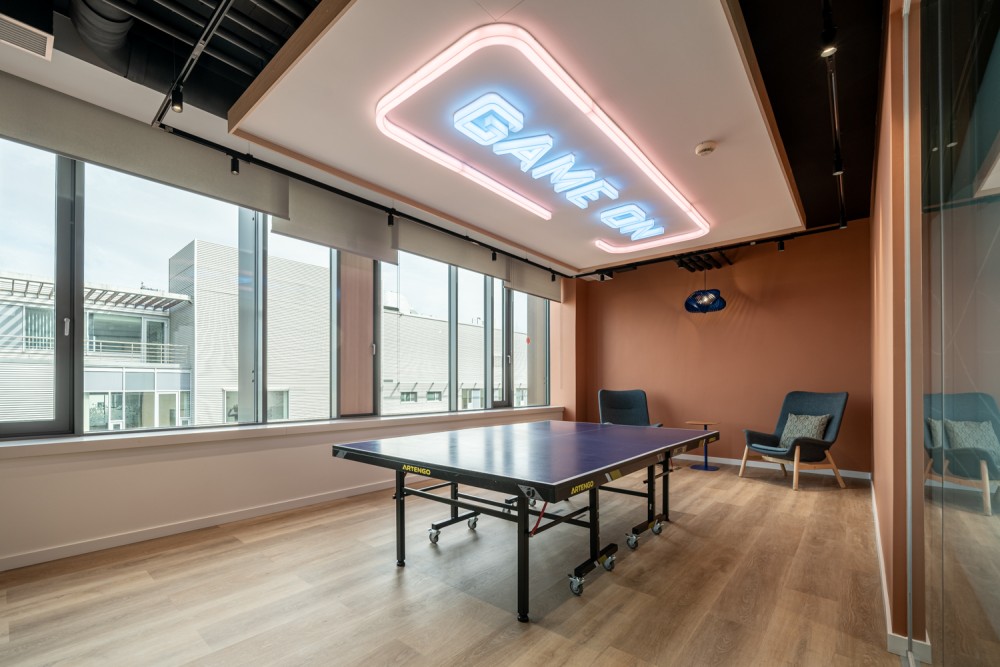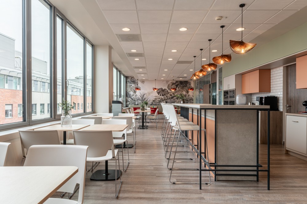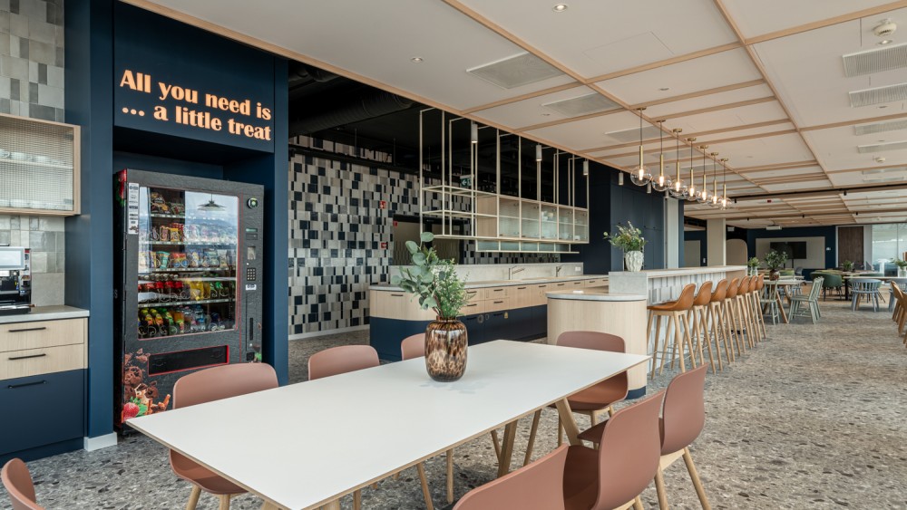 Az iroda egyik kiemelkedő újítása az Agora multifunkcionális közösségi tér, amely 100 fő befogadására alkalmas. Ez a tér napközben tréningek, townhall események, délben élénk kantin, délután pedig játék- és kávézósarokként funkcionál, rugalmasan alkalmazkodva a szervezet igényeihez.