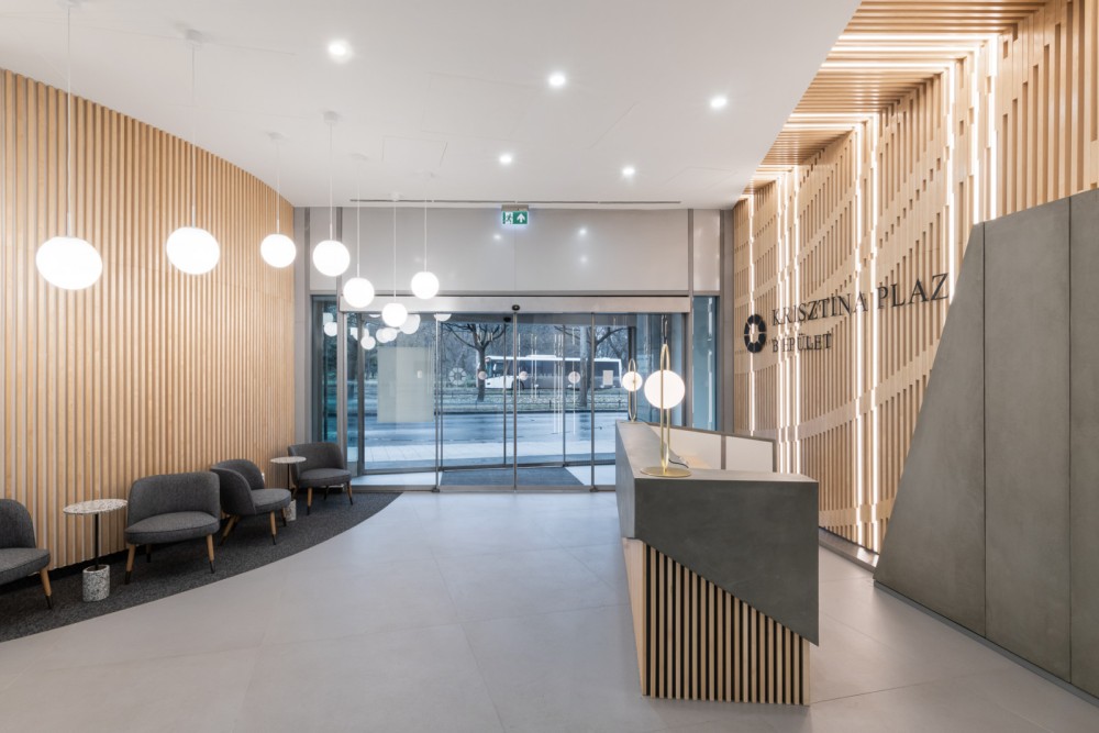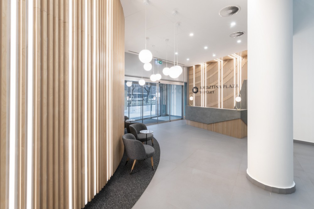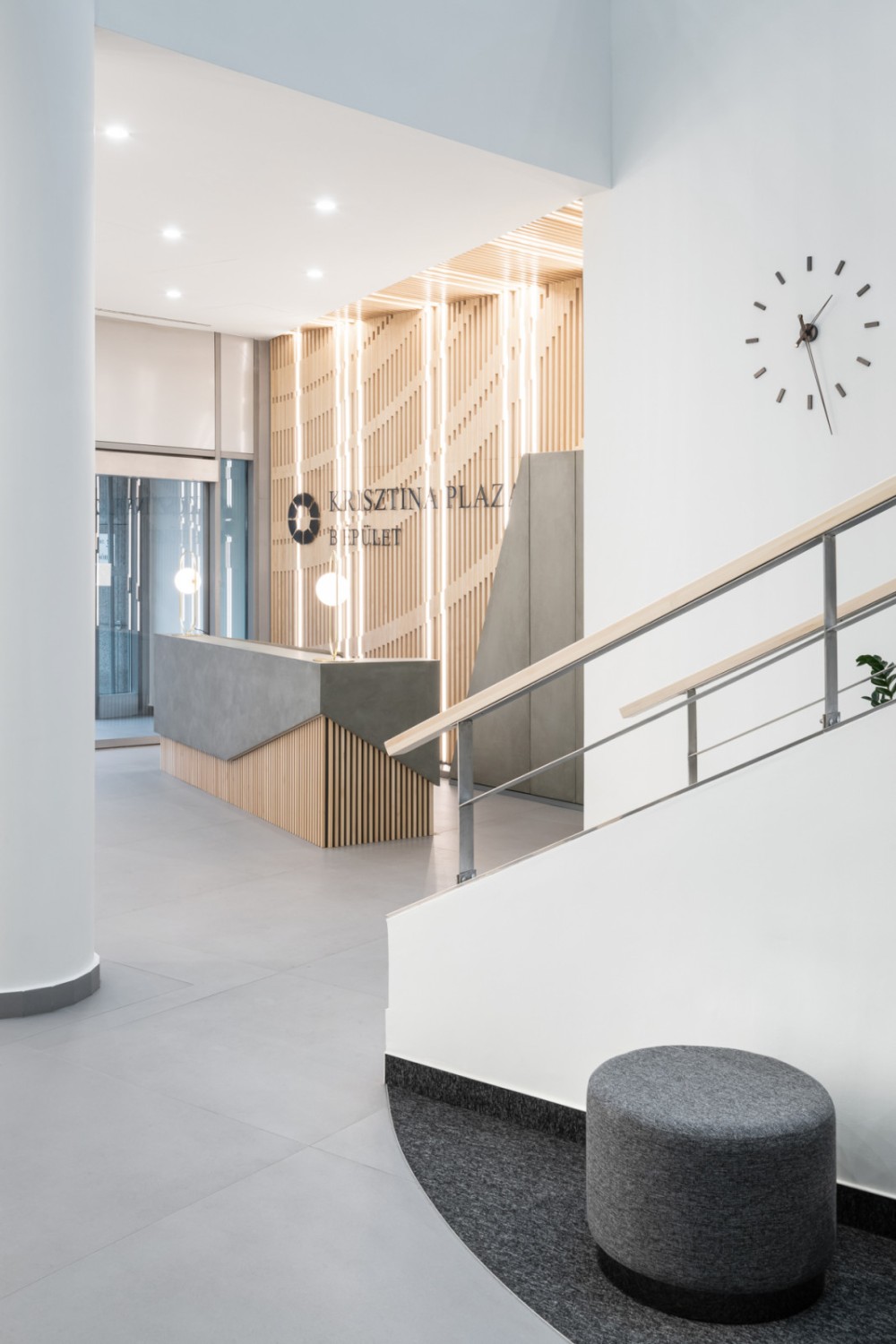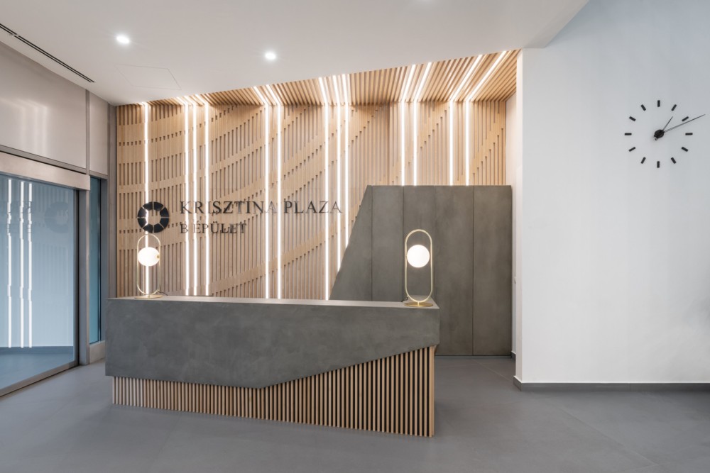 Csaknem húsz év üzemelés után az irodaházban esedékessé vált a közös területek adaptálása a megváltozott trendekhez – a B recepció fogadótere ennek a folyamatnak köszönhetően érkezett meg egy új korszakba.