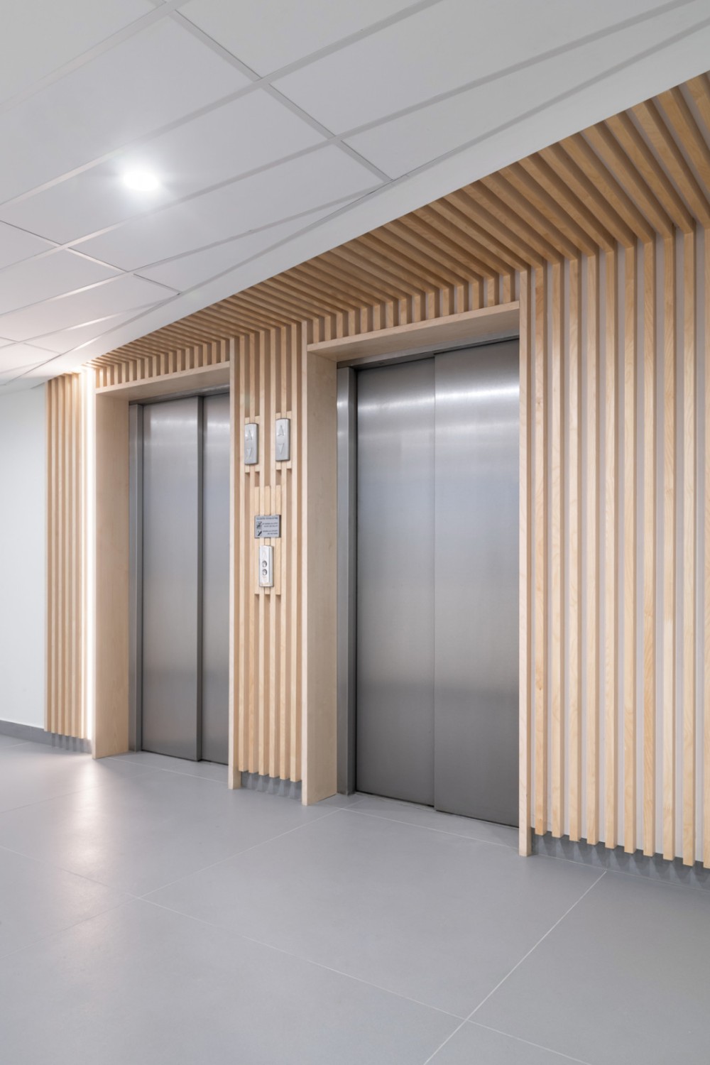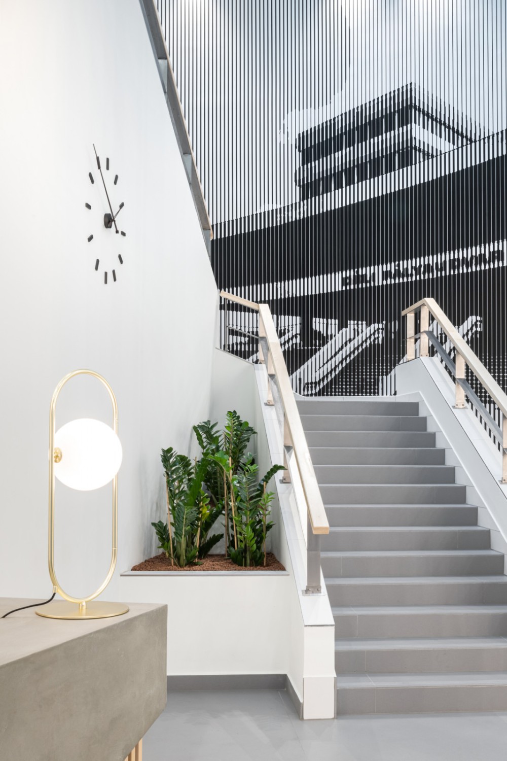 A lágy ívek, hűvös fehérek és a sok fa elegáns egysége új időszámítást képvisel, méltó beléptetést a megbízó és a bérlők kölcsönös bizalmához.
