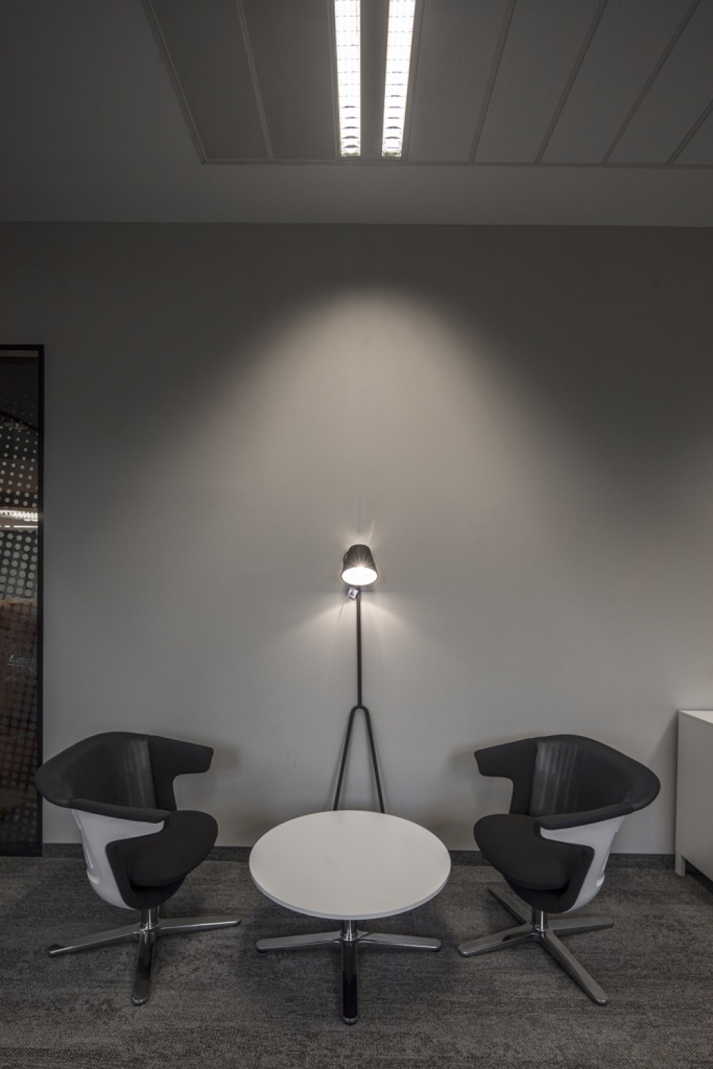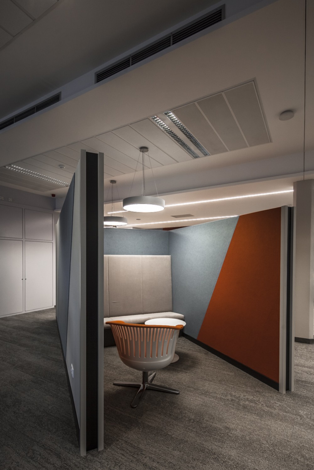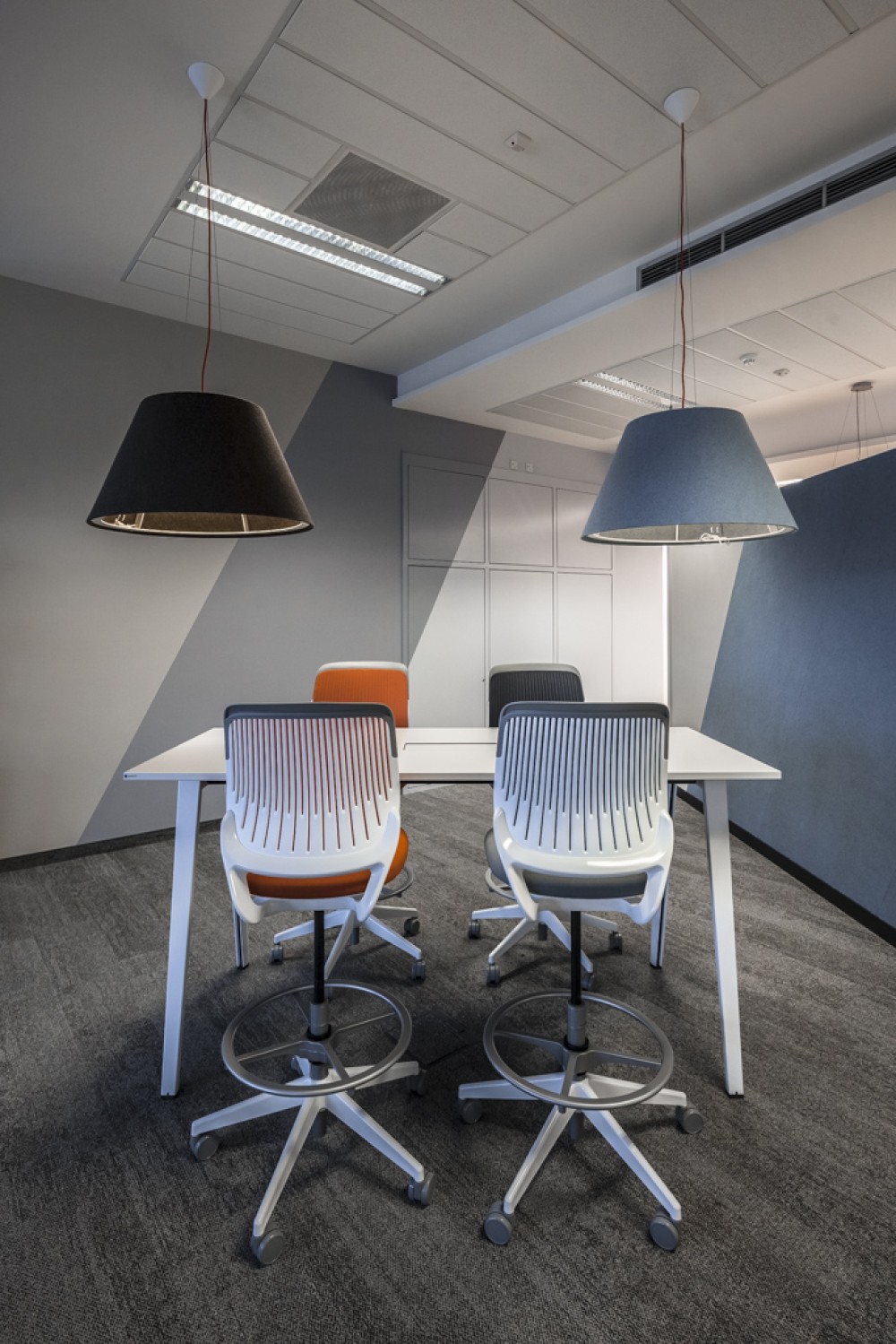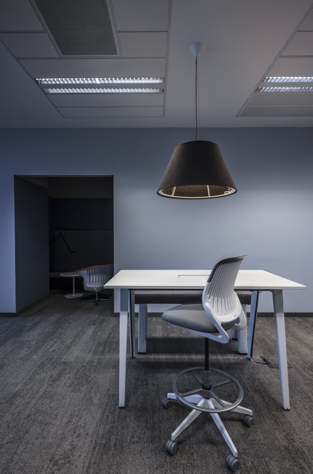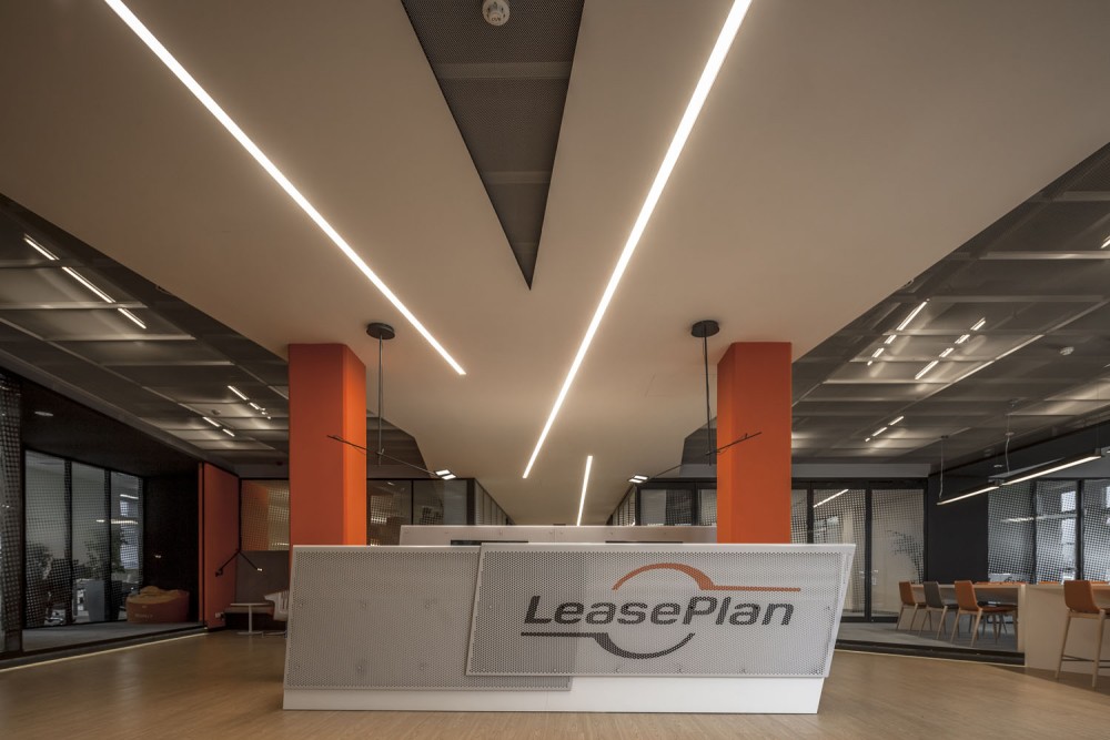 A jellemzően egyterű irodastruktúra megtartása mellett több “formális” zárt,- és számos kisebb nyitott “informális” tárgyaló létesült. A recepció most organikusabban kapcsolódik az irodaterülethez és tágasabb, világosabb lett; kiegészült egy kollaborációra, pihenésre és vendégek fogadására egyaránt alkalmas „work café” területtel. Ez a tér egybenyitható a nagytárgyalóval, rendezvények vagy a közel 100 fős all-staff értekezletek alkalmával – a tárgyaló üvegfalai ugyanis mozgathatóak. A nagykonyha áthelyezésével értékes homlokzati felület szabadult fel, ahol munkaállomások lettek kialakítva. Az irodaterületeken új álpadló készült, ami vezetékezés szempontjából a korábbi parapetcsatornás megoldásnál nagyobb rugalmasságot biztosít. A meglévő álmennyezeti struktúra kisebb átalakítások mellett megmaradt; a recepciós tér felett terpesztett hálós álmennyezet lett létrehozva. A meglévő fénycsöves általános világítást függesztett lámpatestekkel egészítették ki – ezek kiosztása a munkahelyekhez lett igazítva, asztalcsoportonként szabályozhatóak. A falburkolatok között található ragasztott üveg, mágneses festék és hangelnyelő filc felület. A szín-, és anyagkoncepció, a grafikai installációk a Leaseplan arculati elemeinek megkötéseit figyelembe véve készültek. Az iroda korszerűsítése mellet az irodabútorok is megújultak – a helypazarló L alakú munkaállomások helyére hatékony bench rendszerű bútorok kerültek. A munkatársak csapatmunkáját a leginnovatívabb kollaborációs bútorok segítik, mint a Bene Toguna tárgyalósziget, a Steelcase B-free és I2I rendszerek. Az irodabútorok kiválasztásánál fontos szerepet kaptak a munkatársak, akik 2 héten át tesztelhették, véleményezhették a tenderre meghívott beszállítók munka-és tárgyalószékeit. A nyertes munkaszéket mindenki magáénak érzi, miután a kárpitok színét – adott színsémákból – szintén mindenki maga választhatta meg.