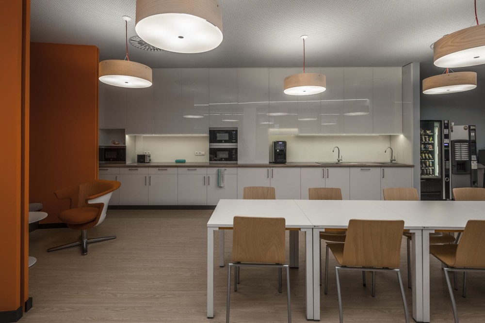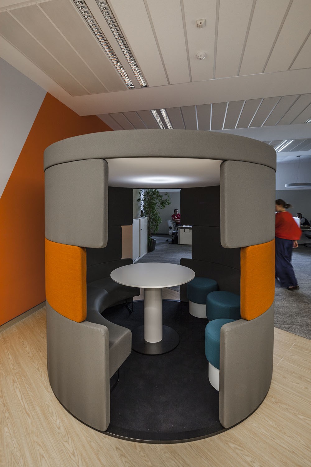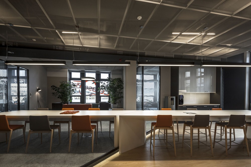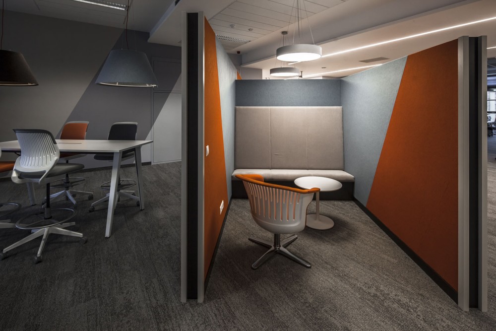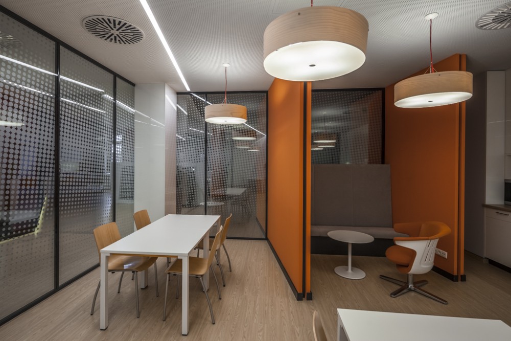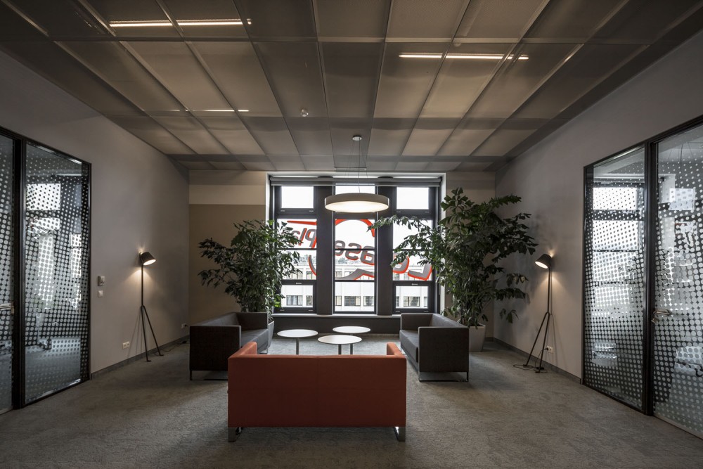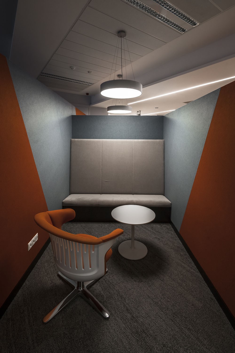 A jellemzően egyterű irodastruktúra megtartása mellett több “formális” zárt,- és számos kisebb nyitott “informális” tárgyaló létesült. A recepció most organikusabban kapcsolódik az irodaterülethez és tágasabb, világosabb lett; kiegészült egy kollaborációra, pihenésre és vendégek fogadására egyaránt alkalmas „work café” területtel. Ez a tér egybenyitható a nagytárgyalóval, rendezvények vagy a közel 100 fős all-staff értekezletek alkalmával – a tárgyaló üvegfalai ugyanis mozgathatóak. A nagykonyha áthelyezésével értékes homlokzati felület szabadult fel, ahol munkaállomások lettek kialakítva. Az irodaterületeken új álpadló készült, ami vezetékezés szempontjából a korábbi parapetcsatornás megoldásnál nagyobb rugalmasságot biztosít. A meglévő álmennyezeti struktúra kisebb átalakítások mellett megmaradt; a recepciós tér felett terpesztett hálós álmennyezet lett létrehozva. A meglévő fénycsöves általános világítást függesztett lámpatestekkel egészítették ki – ezek kiosztása a munkahelyekhez lett igazítva, asztalcsoportonként szabályozhatóak. A falburkolatok között található ragasztott üveg, mágneses festék és hangelnyelő filc felület. A szín-, és anyagkoncepció, a grafikai installációk a Leaseplan arculati elemeinek megkötéseit figyelembe véve készültek. Az iroda korszerűsítése mellet az irodabútorok is megújultak – a helypazarló L alakú munkaállomások helyére hatékony bench rendszerű bútorok kerültek. A munkatársak csapatmunkáját a leginnovatívabb kollaborációs bútorok segítik, mint a Bene Toguna tárgyalósziget, a Steelcase B-free és I2I rendszerek. Az irodabútorok kiválasztásánál fontos szerepet kaptak a munkatársak, akik 2 héten át tesztelhették, véleményezhették a tenderre meghívott beszállítók munka-és tárgyalószékeit. A nyertes munkaszéket mindenki magáénak érzi, miután a kárpitok színét – adott színsémákból – szintén mindenki maga választhatta meg.