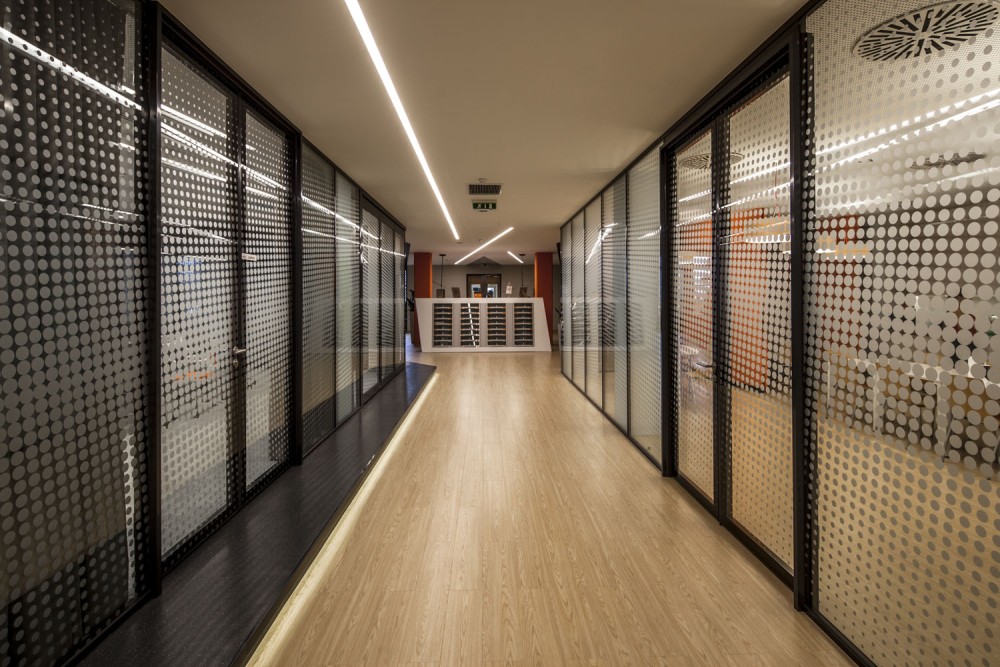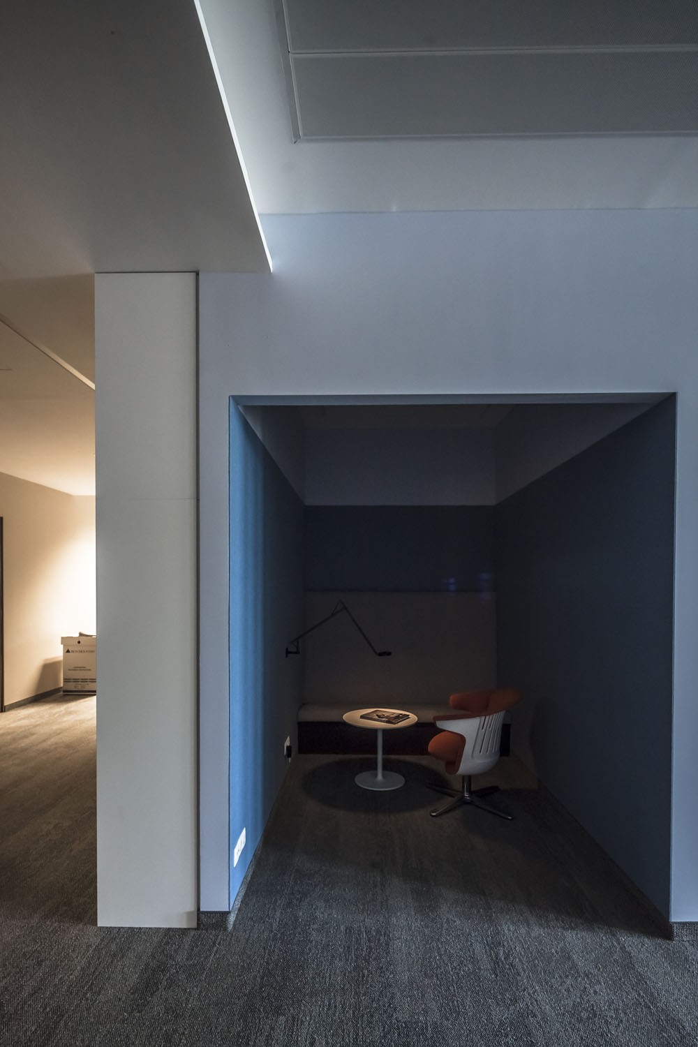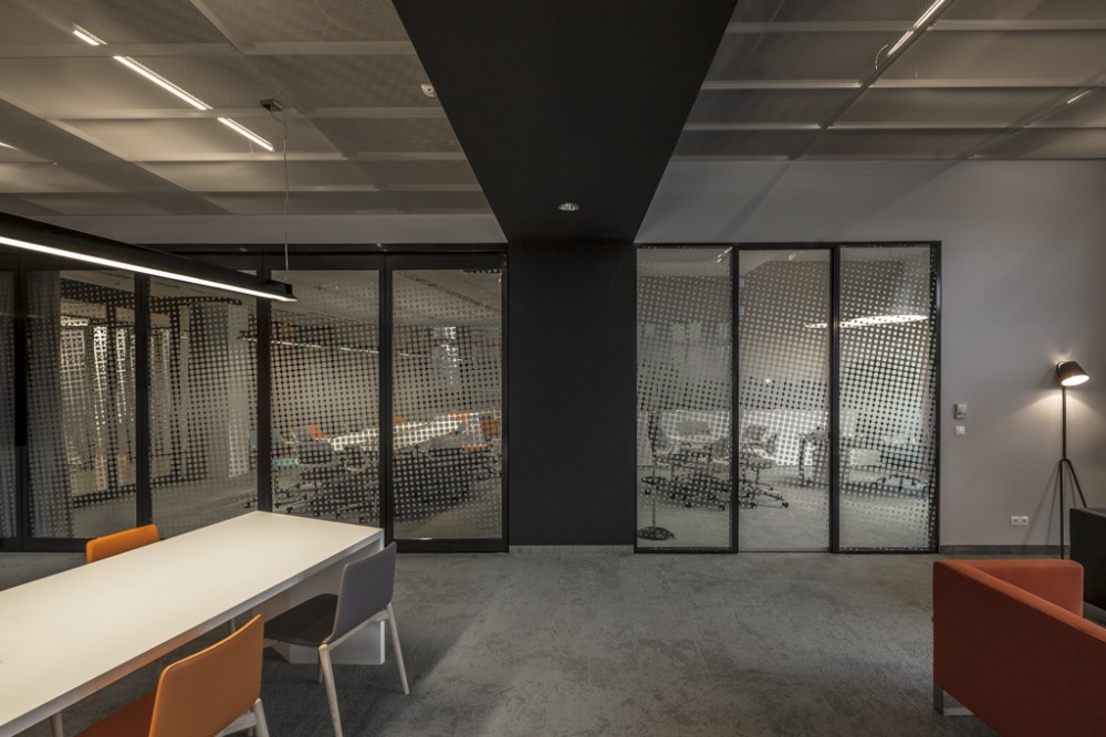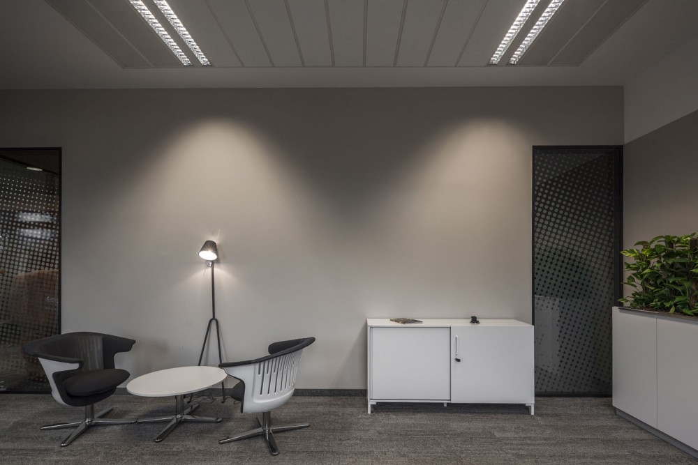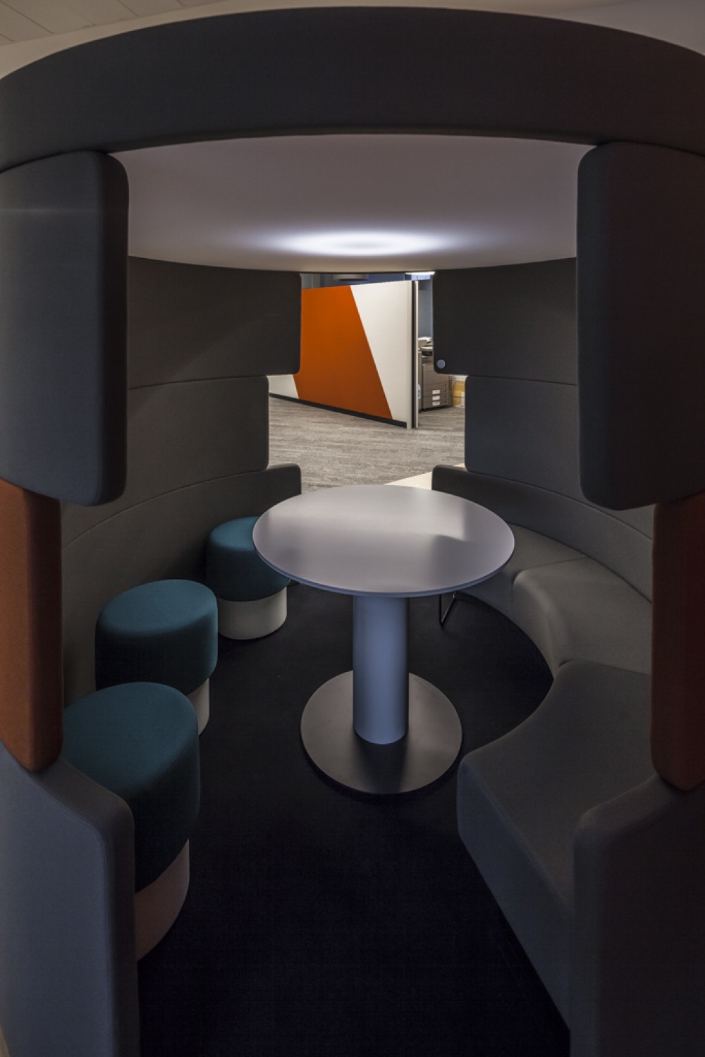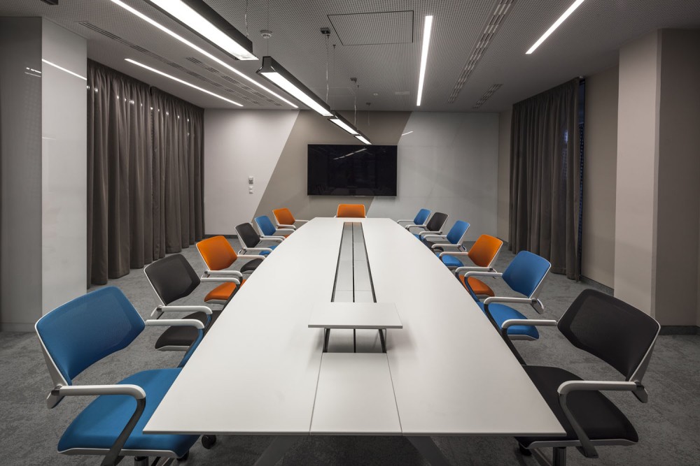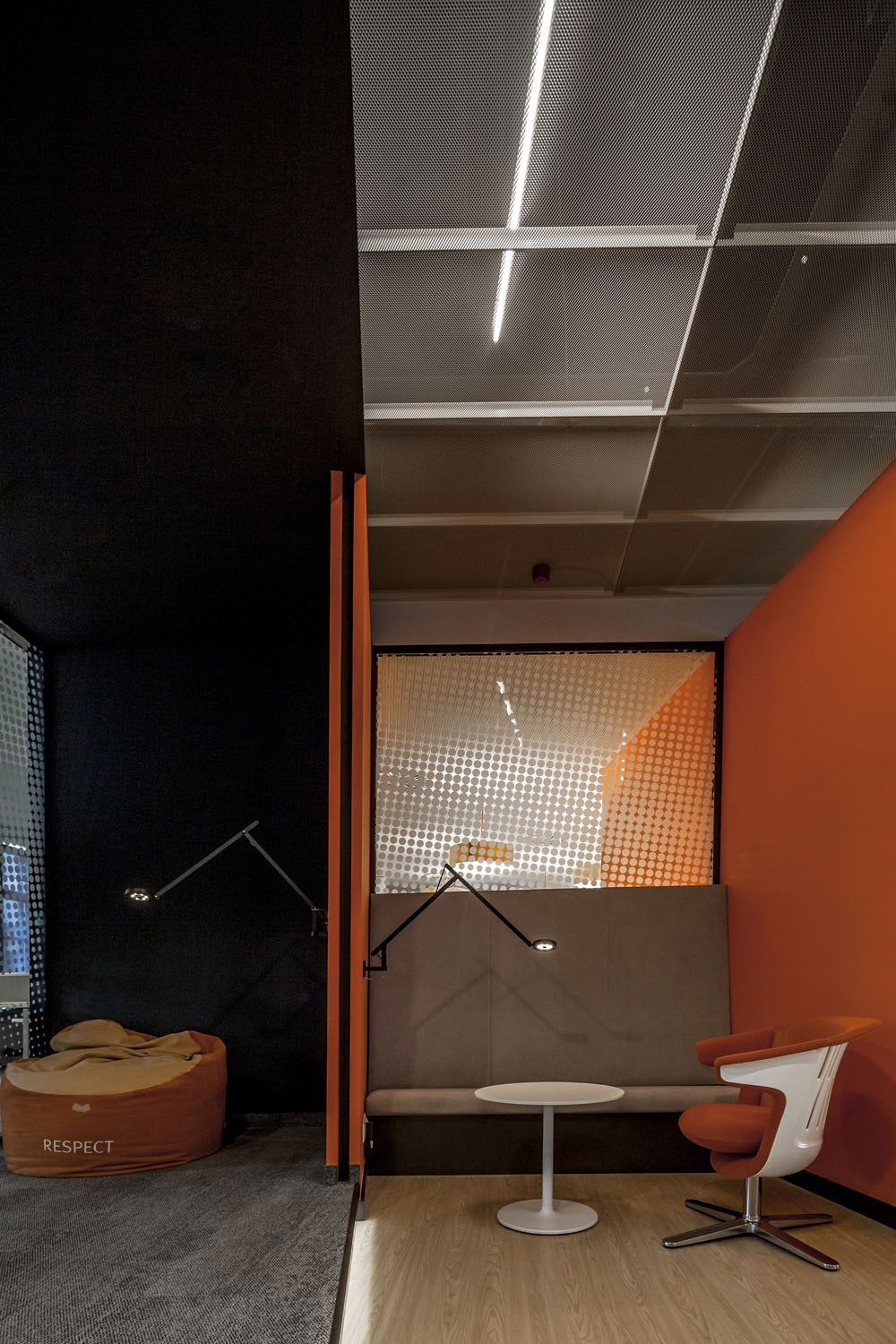 A jellemzően egyterű irodastruktúra megtartása mellett több “formális” zárt,- és számos kisebb nyitott “informális” tárgyaló létesült. A recepció most organikusabban kapcsolódik az irodaterülethez és tágasabb, világosabb lett; kiegészült egy kollaborációra, pihenésre és vendégek fogadására egyaránt alkalmas „work café” területtel. Ez a tér egybenyitható a nagytárgyalóval, rendezvények vagy a közel 100 fős all-staff értekezletek alkalmával – a tárgyaló üvegfalai ugyanis mozgathatóak. A nagykonyha áthelyezésével értékes homlokzati felület szabadult fel, ahol munkaállomások lettek kialakítva. Az irodaterületeken új álpadló készült, ami vezetékezés szempontjából a korábbi parapetcsatornás megoldásnál nagyobb rugalmasságot biztosít. A meglévő álmennyezeti struktúra kisebb átalakítások mellett megmaradt; a recepciós tér felett terpesztett hálós álmennyezet lett létrehozva. A meglévő fénycsöves általános világítást függesztett lámpatestekkel egészítették ki – ezek kiosztása a munkahelyekhez lett igazítva, asztalcsoportonként szabályozhatóak. A falburkolatok között található ragasztott üveg, mágneses festék és hangelnyelő filc felület. A szín-, és anyagkoncepció, a grafikai installációk a Leaseplan arculati elemeinek megkötéseit figyelembe véve készültek. Az iroda korszerűsítése mellet az irodabútorok is megújultak – a helypazarló L alakú munkaállomások helyére hatékony bench rendszerű bútorok kerültek. A munkatársak csapatmunkáját a leginnovatívabb kollaborációs bútorok segítik, mint a Bene Toguna tárgyalósziget, a Steelcase B-free és I2I rendszerek. Az irodabútorok kiválasztásánál fontos szerepet kaptak a munkatársak, akik 2 héten át tesztelhették, véleményezhették a tenderre meghívott beszállítók munka-és tárgyalószékeit. A nyertes munkaszéket mindenki magáénak érzi, miután a kárpitok színét – adott színsémákból – szintén mindenki maga választhatta meg.