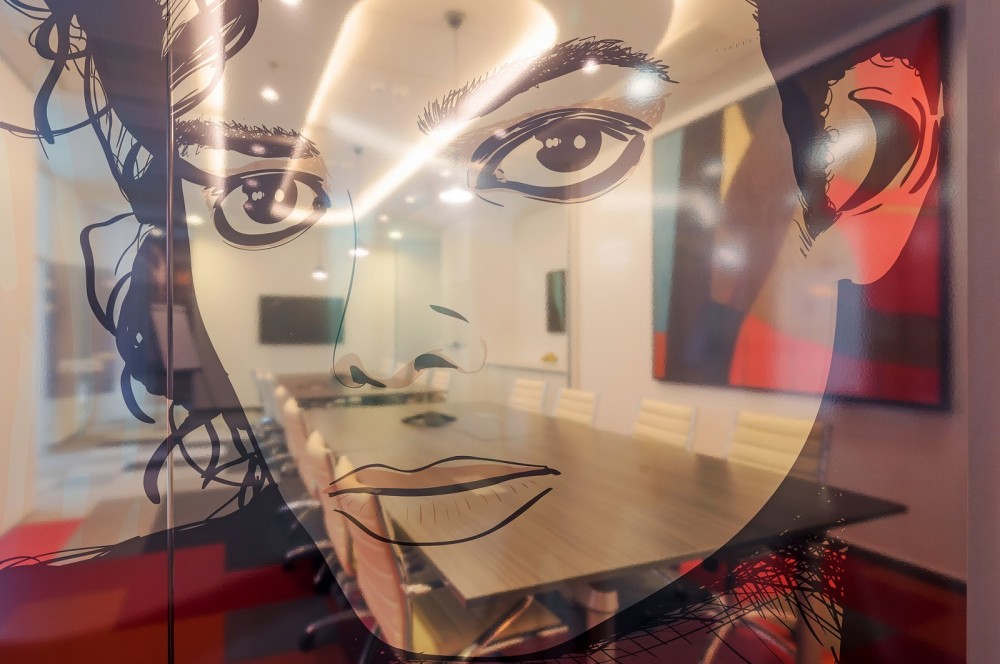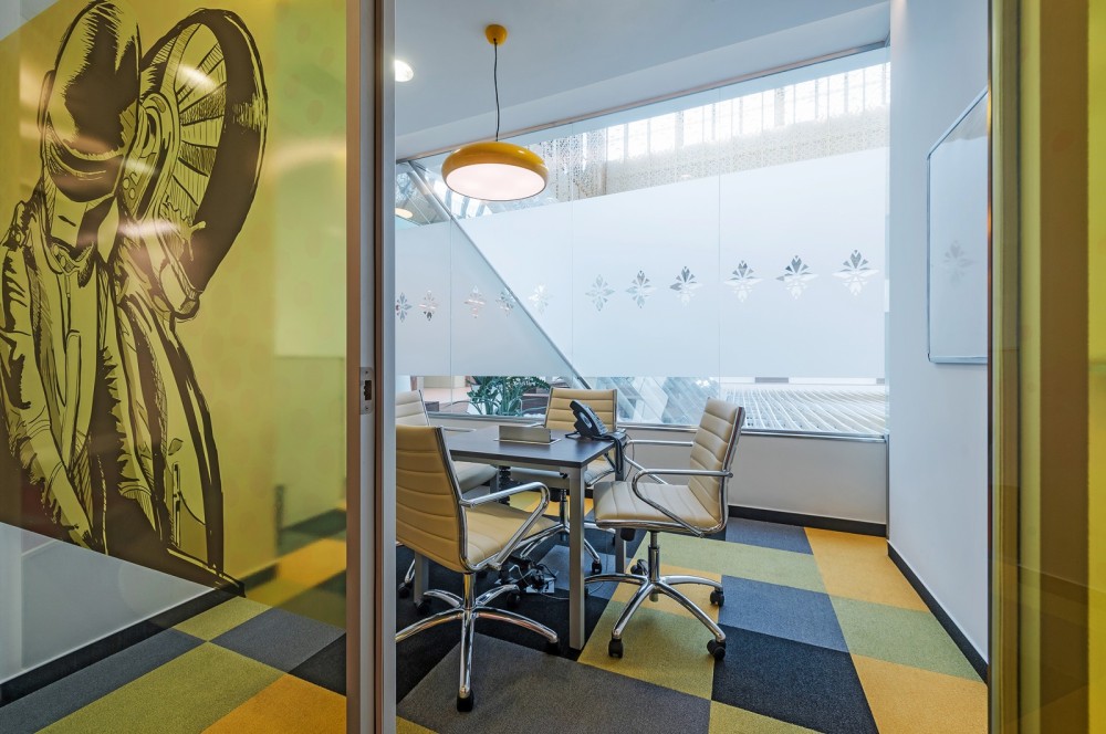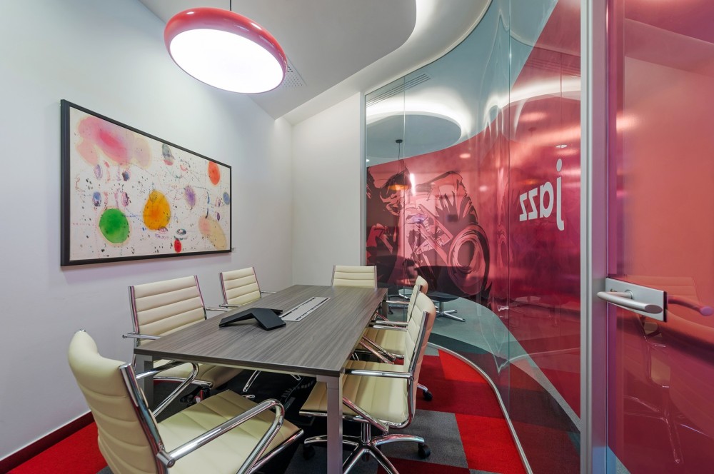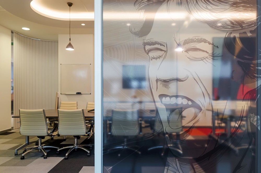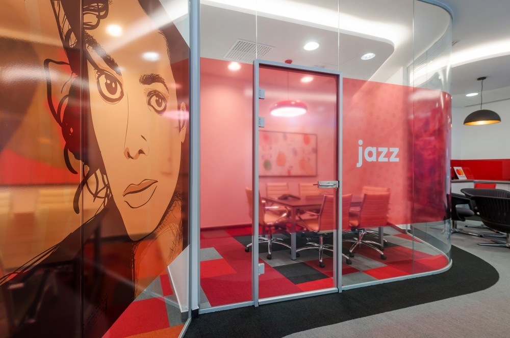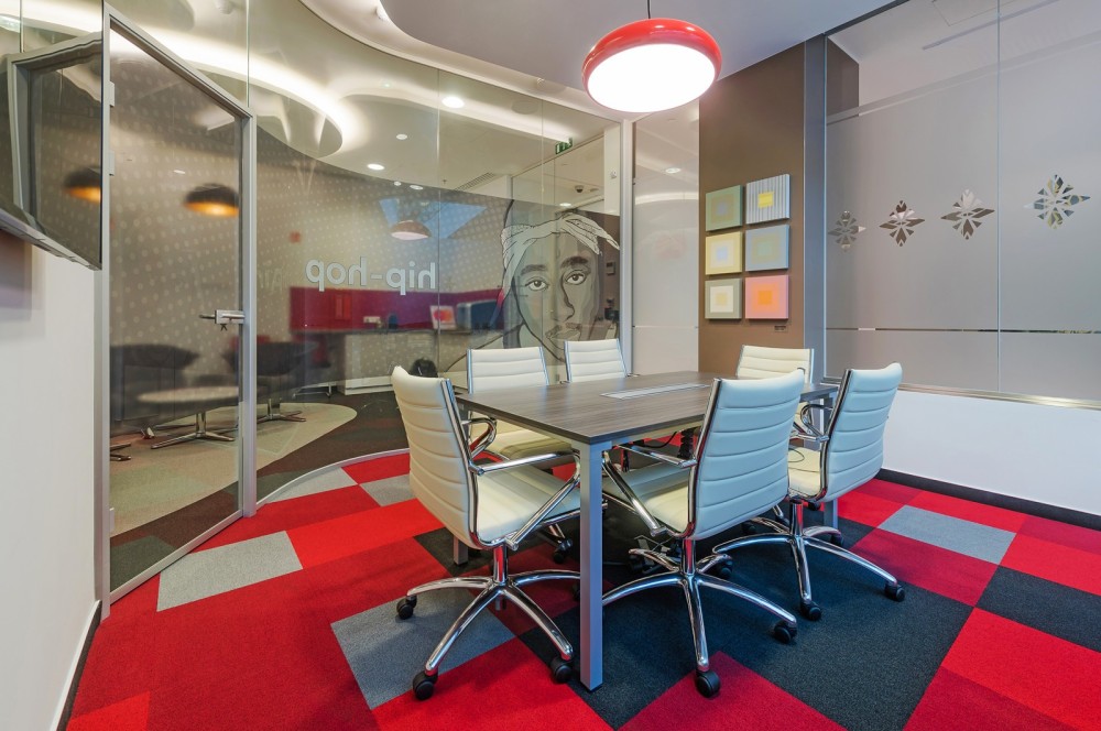 A bútorok kiválasztásában a kényelem és a funkcionalitás dominált, ugyanakkor minden helyiségnek sajátos karaktert és hangulatot kölcsönöztek – köszönhetően az egyedi “kódolásnak” és színválasztásnak. A kisebb alapterületű irodahelyiségek és a tárgyaló üvegfalait egy-egy zenei stílussal fémjelzett illusztráció díszíti – így került például 2Pac a Hip-Hop vagy Jackson a Pop szoba külső falára. A képregények világát idéző arcmások mellett egy-egy meghatározó színnel jelölték a helyiségeket, ami a padlószőnyeg geometrikus mintázatában is visszaköszön. A sárga és a piros jellemzően a szürke, zöld vagy a narancs árnyalataival együtt jelenik meg, így nem válik hivalkodóvá az arculati színek dominanciája.