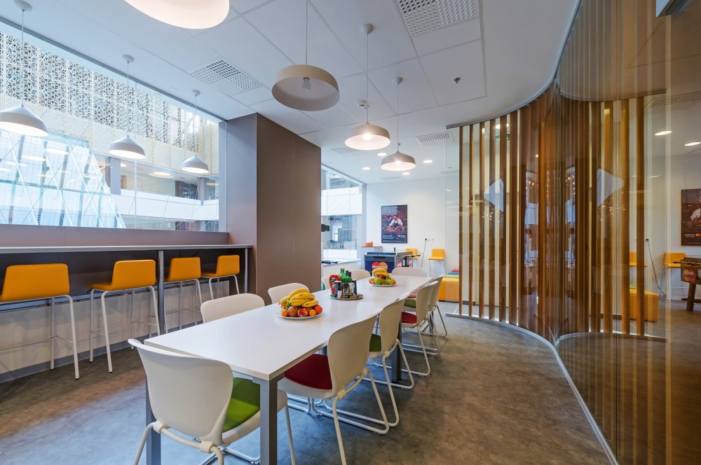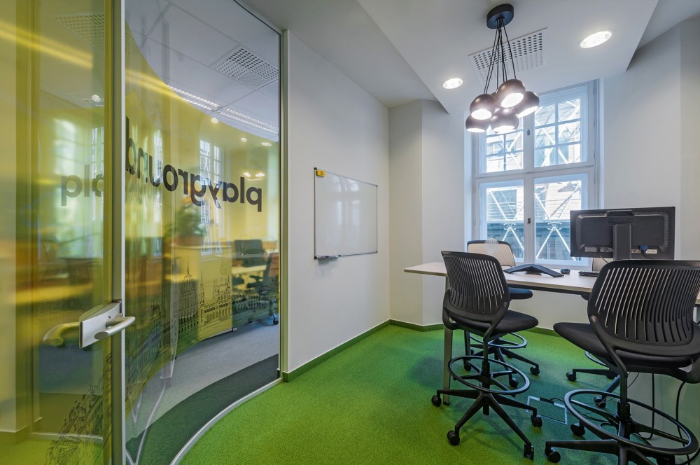 A konyha és az abban helyet kapó ún. breakout sarok színkezelése jóval visszafogottabb, itt a világos, natúr színek és anyagok hangsúlyosak. Ebédszünetben vagy játék közben felpillantva pedig a kortárs építészet tolmácsolásában a Váci 1 neoklasszicista épületbelsőjének lenyűgöző látványa tárul elénk.