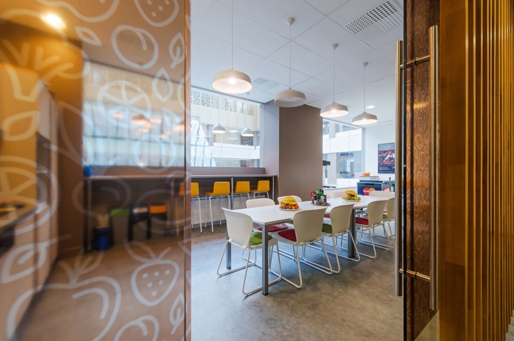 Az open office és a közösségi terek felé tartva egy átvezető pihenőhelyiségbe érkezünk, ahol a két irodafunkciót is szimbolizálva megjelenik a MasterCard logója. A szervezeti egységeket összefogó coworking iroda a kreatív projektszoba és a Playground névre keresztelt ügyvezetői iroda között helyezkedik el. Itt már nem díszítik nagyméretű grafikák az üvegfalakat – az üveg gyakori és domináns felhasználását fa lamellázással oldották fel, mind a közösségi munkatér, mind az étkezőhelyiség falán.