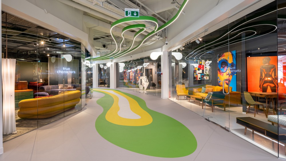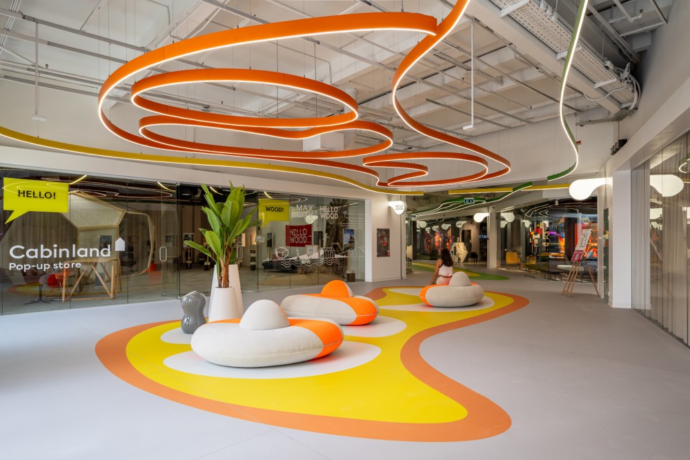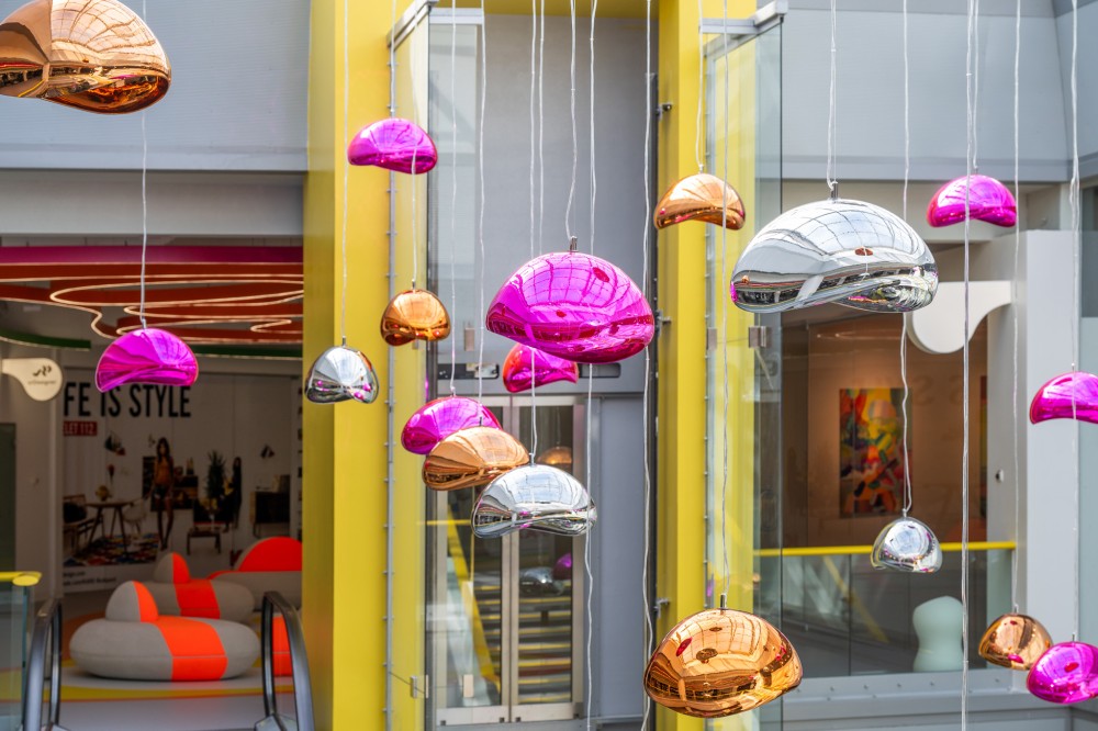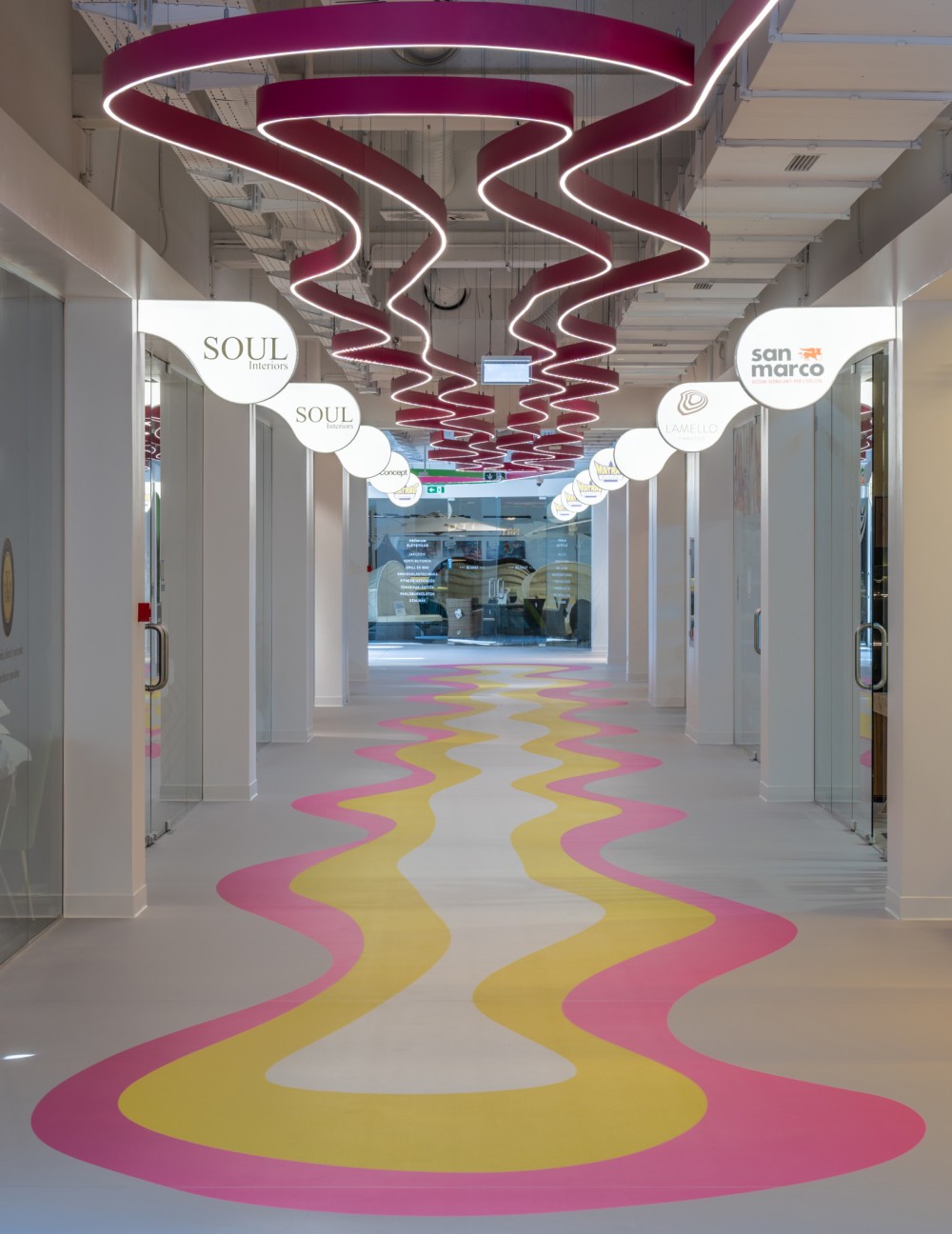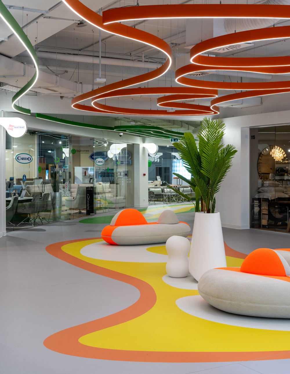 A frissen kialakított terek hűen tükrözik Karim Rashid egyedi látásmódját: a folyosókat és közösségi tereket áramló formák és dinamikus színvilág jellemzi, amelyek a látogatót végigvezetik a bevásárlóközpont három szintjén. A színkódok segítségével a különböző funkcionális egységek vizuálisan is elkülönülnek, miközben a formatervezett cégérek és piktogramok egységesítik a látványt, erősítve a „város a városban” koncepciót. A terek kialakítása „flow” élmény dinamikájára reflektál.