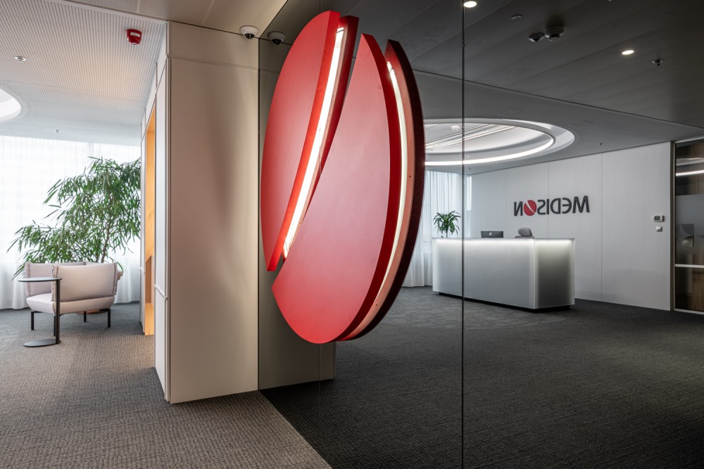 A Medison karakteres piros színe az ügyfélterekben közvetlenül jelenik meg, míg a közösségi és munkaterekben visszafogottabb, harmonikus árnyalatokban köszön vissza. A közlekedő fókuszpontján, sötét tükörfelületre rögzített nagyméretű logó vizuális kapcsolatot teremt a dolgozók és a Medison szellemisége között, erősítve a közös identitást és a kollektív növekedést, a vállalati értékeket a mindennapok részévé téve.