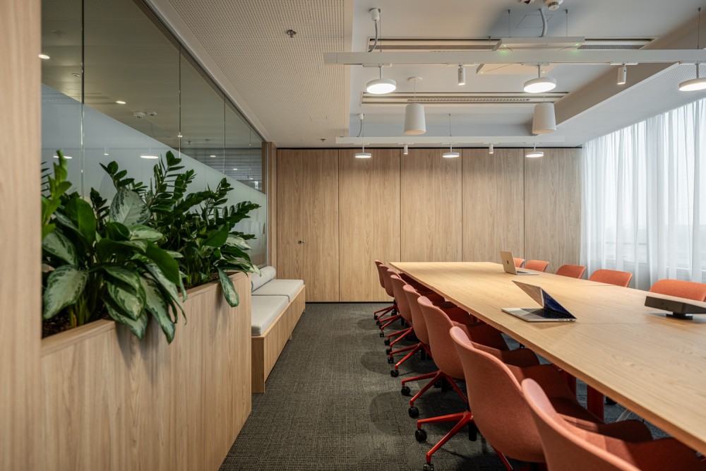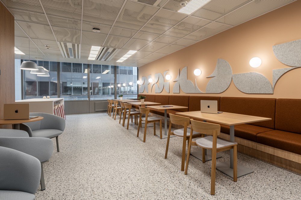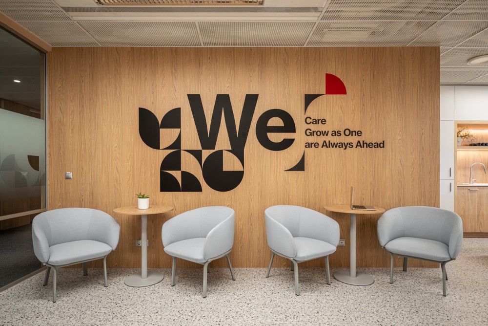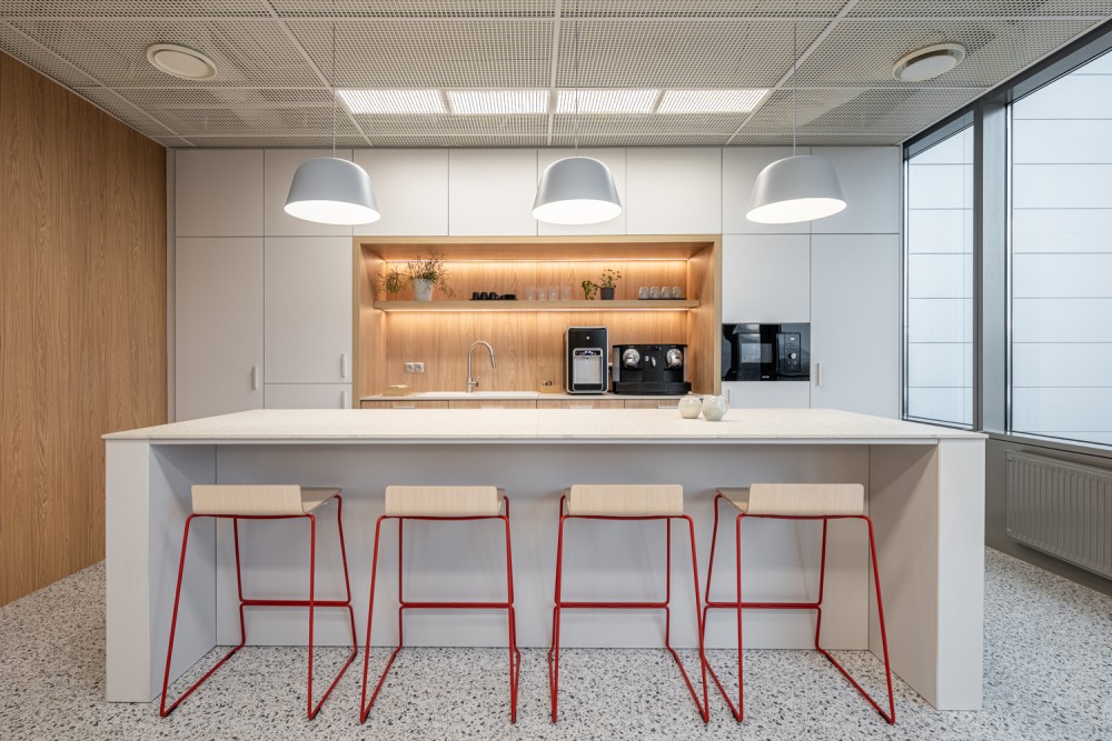 A konyha és közösségi tér tudatosan eltér az iroda többi részének visszafogottabb hangulatától: színes felületek, gazdagabb textúrák és merészebb színválasztások segítik a kikapcsolódást és a kötetlenebb légkört. Kapcsolódásra és eszmecserére tervezett térként a Grow as One értéket testesíti meg, a fa bútorok pedig kávézói hangulatot idéznek, természetes találkozási ponttá téve a teret.