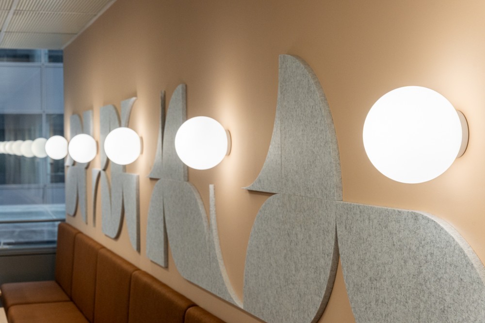 Az otthonos, meleg atmoszféra megteremtése a belsőépítészeti koncepció központi eleme. A We Care értékkel összhangban a puha felületek, a természetes anyaghasználat és a meleg színpaletta ellensúlyozzák az irodaépületekre jellemző steril érzetet. A folytonos felületek – szőnyeg, falburkolatok, üvegfalak és a közösségi tér világítása – vizuálisan összekötik a tereket, míg a körformák az egységet és az összetartozást erősítik, visszhangozva a Medison hitvallását az együtt növekedésről és sikerről. Ennek markáns példája a recepció fölött megjelenő nagyméretű íves lámpa és a logó integrált használata a térben.