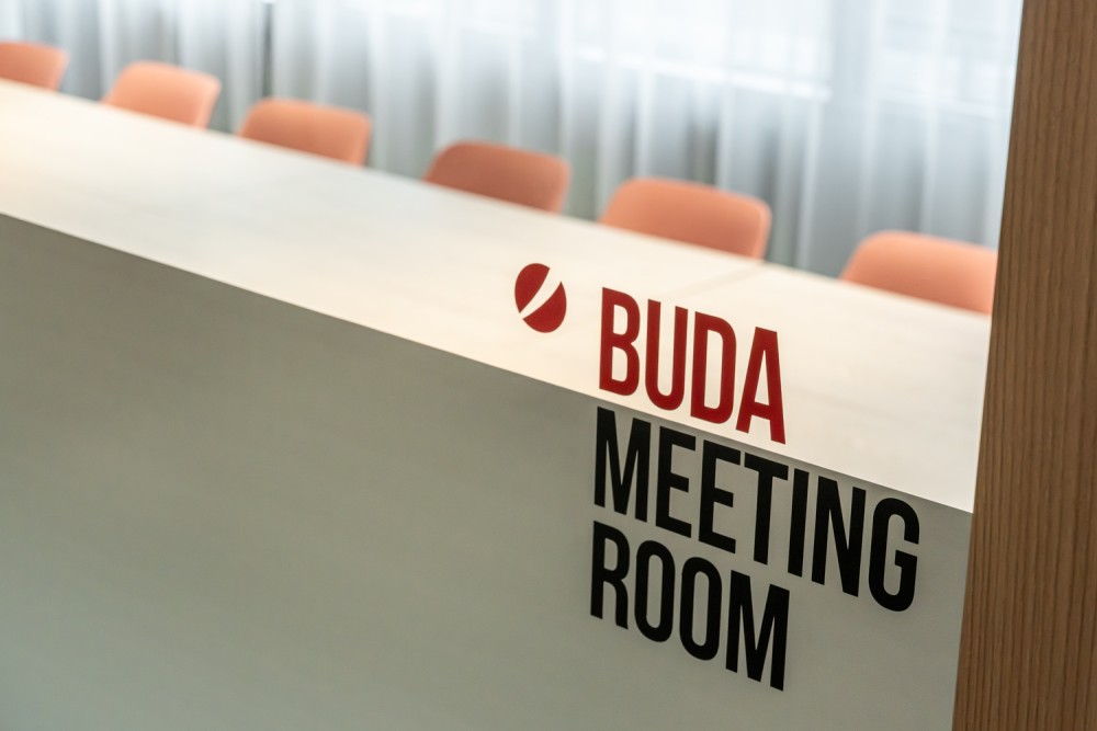 A lokáció meghatározó szerepet játszott a térszervezésben: a Dunára és a budai hegyekre nyíló panoráma a belső elrendezés egyik fő szervezőelvévé vált. Az open office – ahol a kollégák idejük jelentős részét töltik – és a közösségi tér a panorámás homlokzat mentén kapott helyet, így a természetes fény és a kilátás a mindennapi munkakörnyezet szerves részévé vált. Ez a tudatos nyitottság támogatja az együttműködést és a közös élményt, erősítve a Grow as One értéket. Az épület függönyfal rasztere szintén alakította a térstruktúrát: ritmusa a belső falakon is tovább él, finoman erősítve az iroda és az épület kapcsolatát.