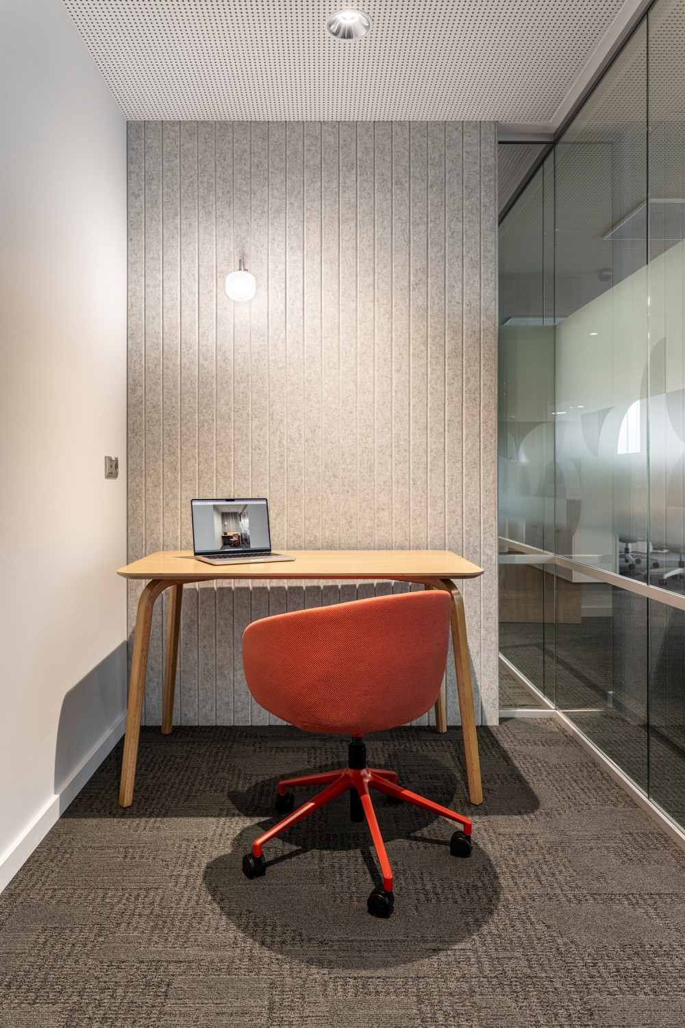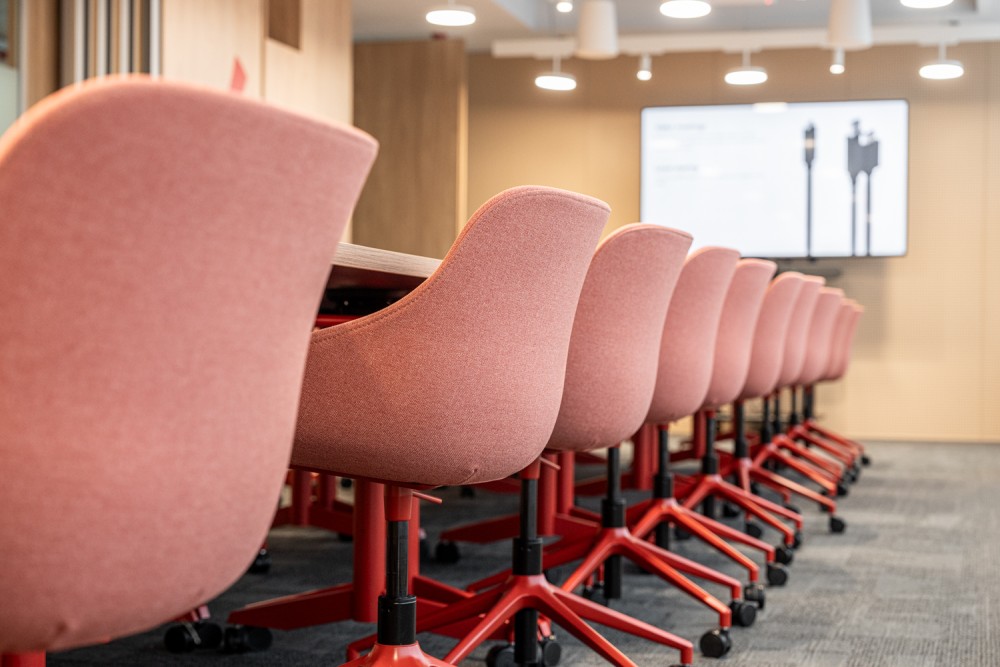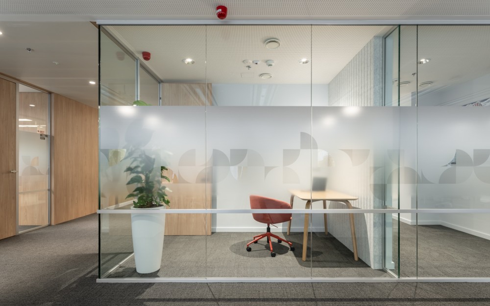 A taktilis felületek tudatos alkalmazása – különösen a szőnyeg textúrája és mintázata – segít kijelölni és hangsúlyozni az egyes zónákat. Az álmennyezet szintváltásai dinamizmust és térbeli mélységet adnak, miközben egyértelműen jelölik a funkcionális területeket, az innovatív térszervezés jegyében. A koncentrált munkát és zavartalan hívásokat szolgáló focus boothok akusztikus falburkolatot kaptak, figyelmet fordítva az egyéni munkastílusokra és jóllétre. A közösségi térben elhelyezett térbeli akusztikus panelek egyszerre töltenek be funkcionális és esztétikai szerepet, a brand jellegzetes elemeit újraértelmezve.