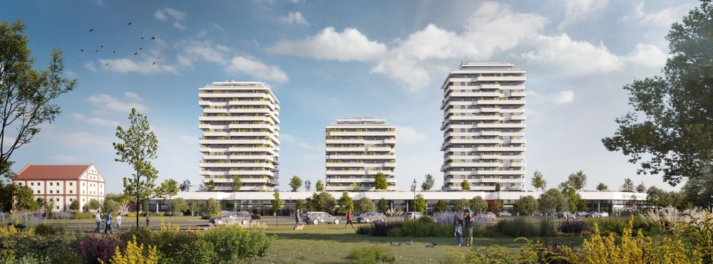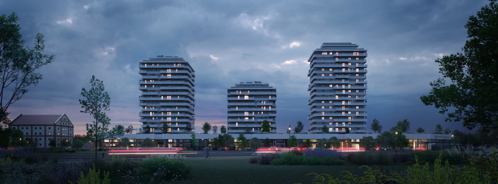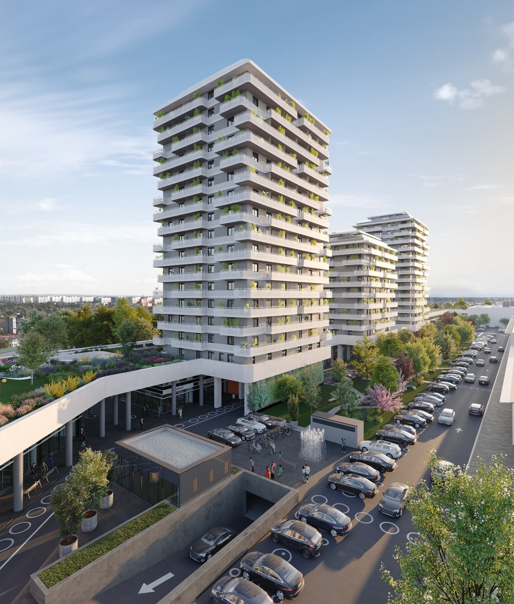 Az épületegyüttes a kereskedelmi funkciója feletti horizontálisan elnyúló, egybefüggő intenzív zöldtetőből kinövő 3 tornyának „táncoló” sziluettjével a városrész szimbólumává, városépítészeti jellé válik.