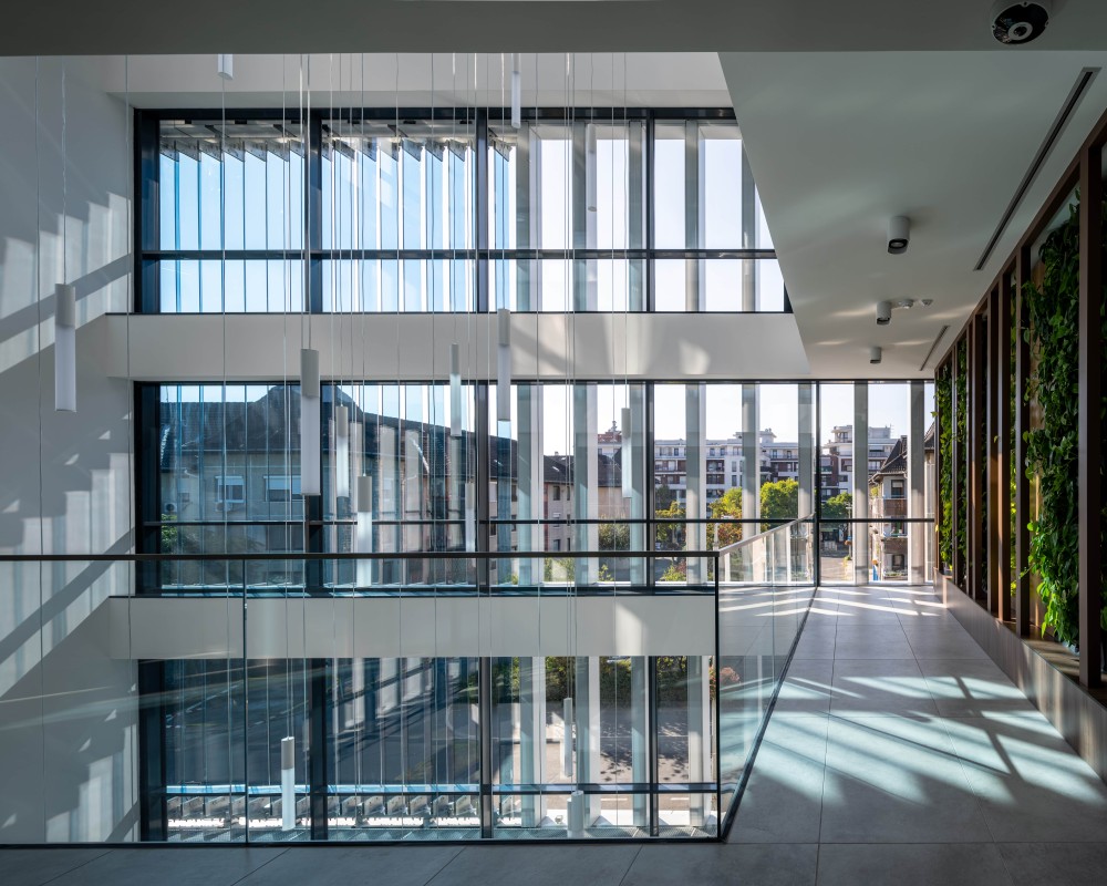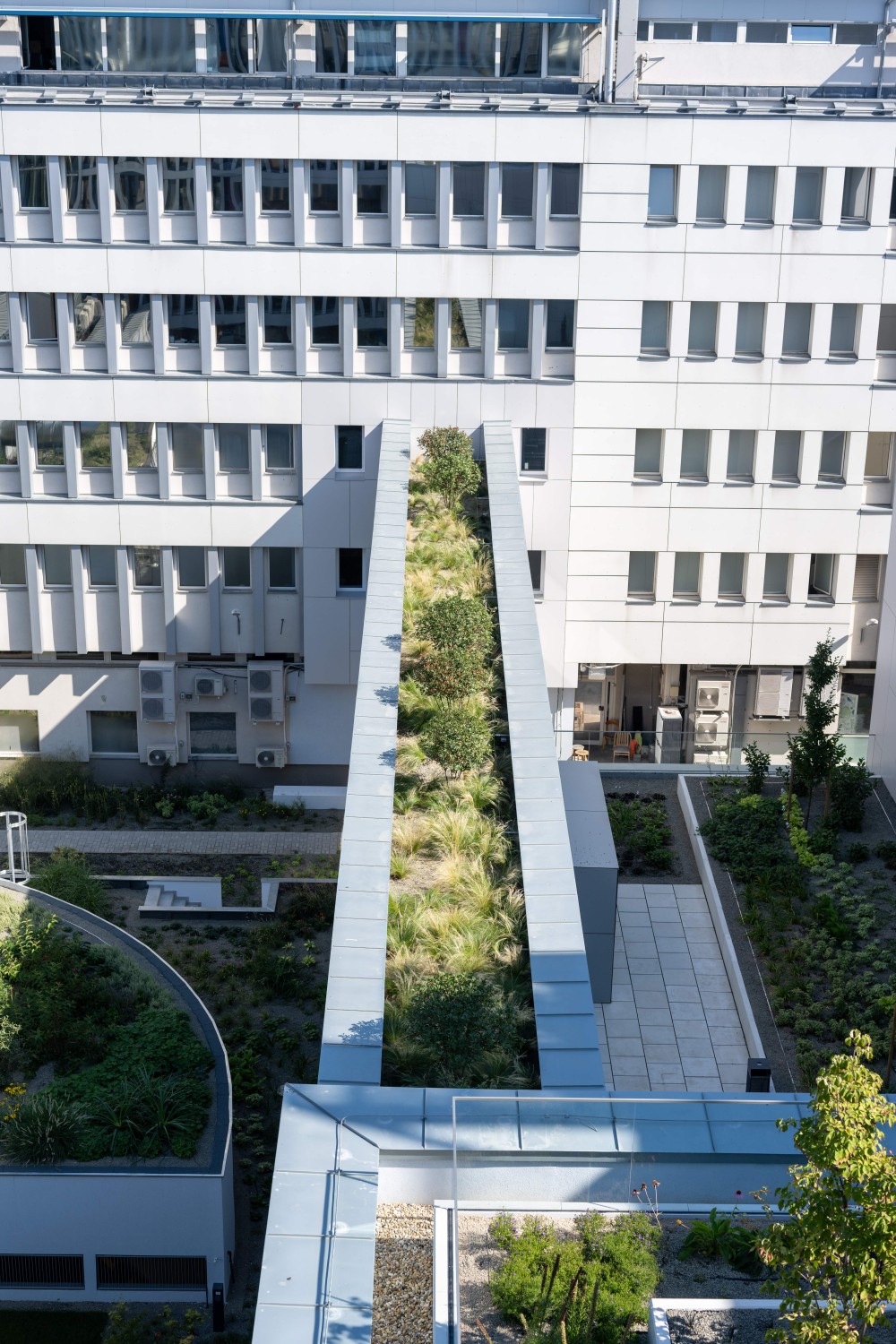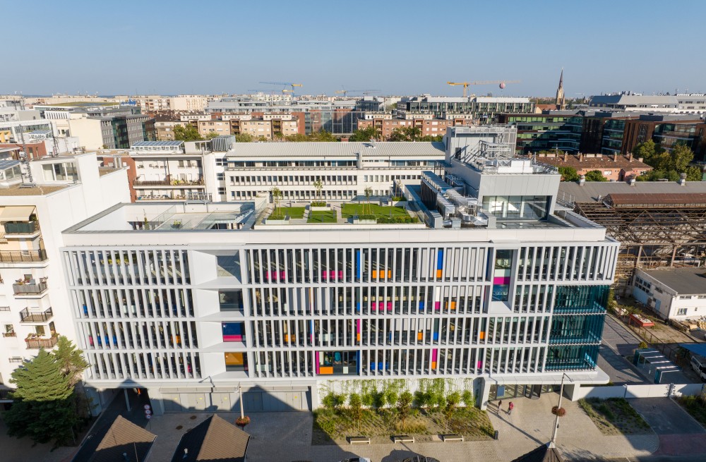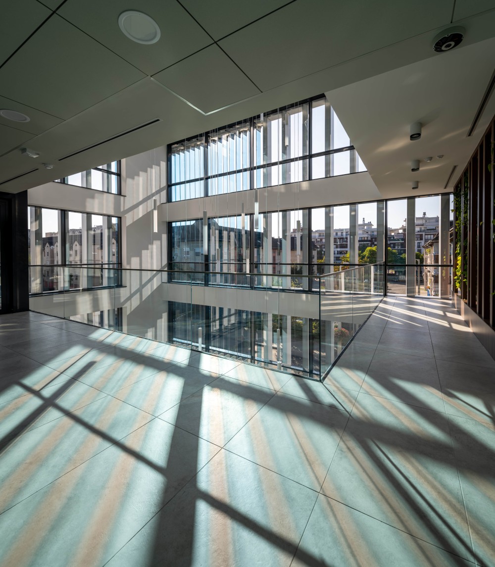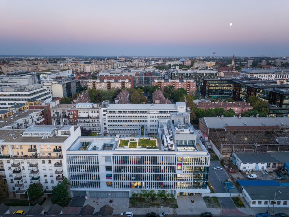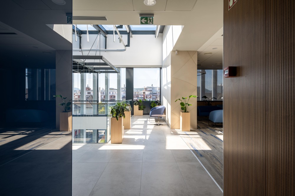 dB-es zajából az akusztikai megoldásoknak köszönhetően semmi nem hallatszik, nem zavarja az épületben folyó munkát, a környező lakóközösséget. Nagy figyelmet fordítottam a kulturált üzemeltethetőség miatt arra, hogy az ablakok könnyen hozzáférhetők, tisztíthatók legyenek. Nagyon sok hazai épületnél sajnos erre kevés figyelmet fordítanak, főleg az anyagi vonzata miatt. Itt viszont készült egy külön közlekedőrendszer az összes üvegfelület előtt, melynek köszönhetően teljesen hétköznapi módszerekkel karbantarthatók és tisztíthatók az ablakok, üvegfelületek. Ez a megoldás tette azt is lehetővé, hogy minden egyes iroda – annak ellenére, hogy el van látva automatizált hűtési, fűtési rendszerrel – természetes úton, ajtó- vagy ablaknyitással szellőztethető legyen. Ezt a természetes szellőzést viszont össze kellett hangoljuk az automatizált rendszerekkel az energiahatékonyság érdekében, azaz egy ablaknyitás esetén a hűtési/fűtési rendszer automatikusan leáll abban a helyiségben.”