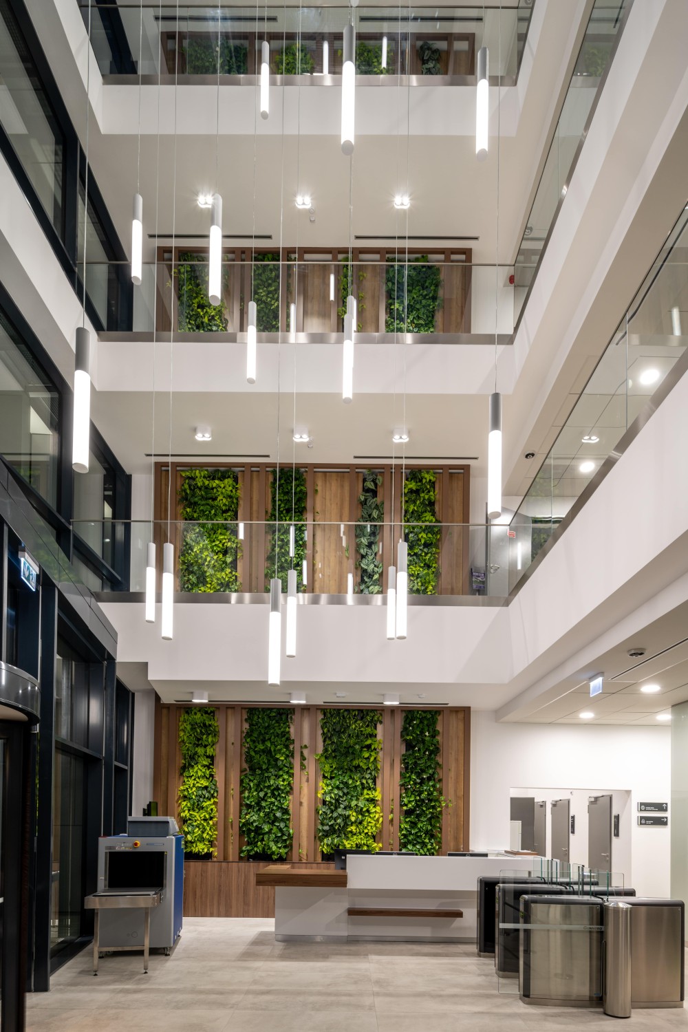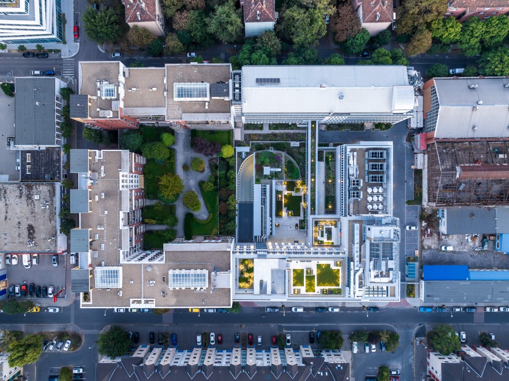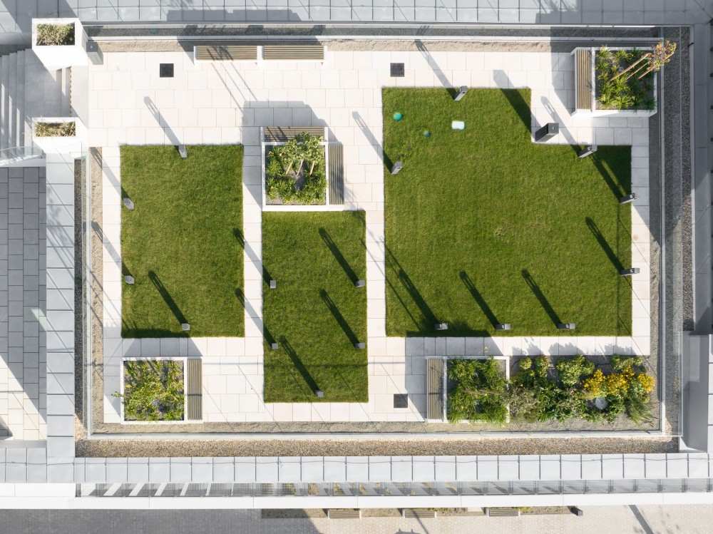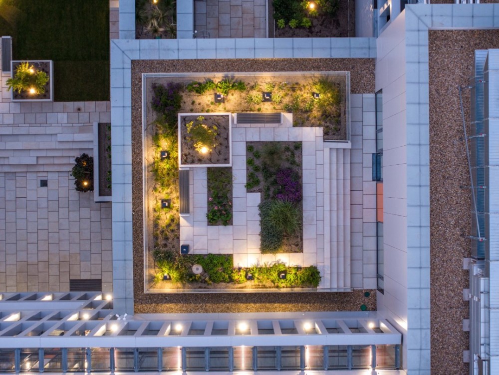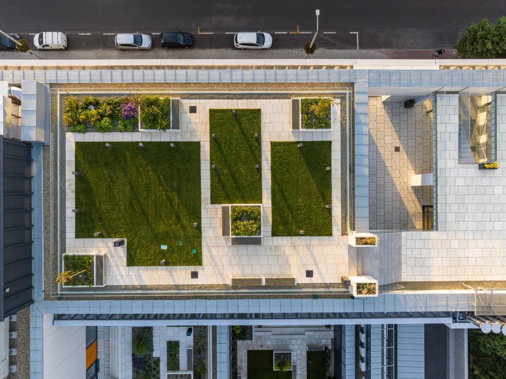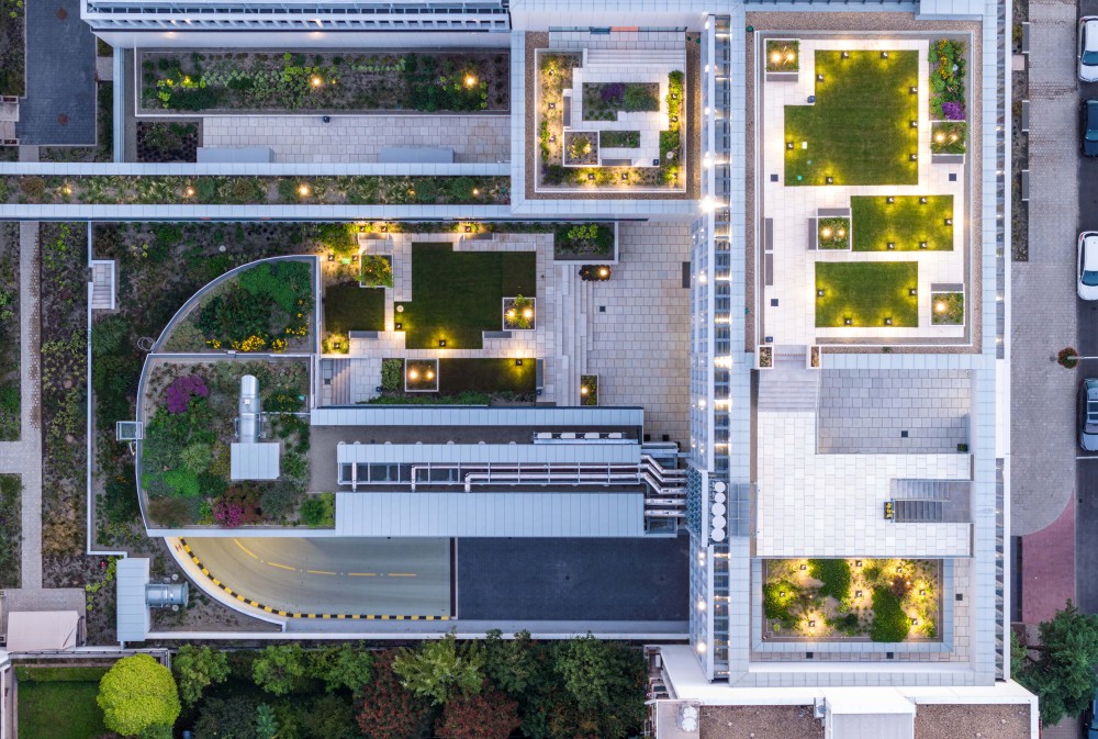 „A tervezés a zöld szemléleten alapult: megújuló energiaforrások és környezetkímélő megoldások biztosítják, hogy az új székház a lehető legkisebb mértékben terhelje a környezetet. Ennek megfelelően az épületben gáz egyáltalán nem lesz, a fűtést és hűtést levegő-vizes hőszivattyús technológia biztosítja. A szervertermeknél, ahol extrém hőterhelés keletkezik, a hűtést egy nagyon takarékos, trópusi körülményekre optimalizált folyadékhűtős rendszer végzi. A levegő minőségének javítására növeltük a zöldterületet. A mintegy 2000 m2-es horizontális zöldfelület mellett közel azonos nagyságban vertikális zöldfelületek is készültek, melyek együtt rengeteg városi port kötnek meg. Az érintett területen a zöldfelületekre meghatározott arányérték nagyon magas, többek között annak érdekében, hogy a létrejövő zöld felület visszafogja a hirtelen lezúduló nagy csapadékot, ami az utcai, elégtelen vízelvezető rendszert terhelné. Ennél az épületnél kialakított zöld területek jóvoltából a csapadék mintegy 90%-át felfogjuk, és mindössze 10% terheli ezt a rendszert. Külön gyűjtjük az esővizet, amivel locsolni is lehet. A közvetlen környezetét így nem terheli a ház. Ez a földszint alá helyezett szerverek miatt is fontos, hogy a nagy csapadékmennyiség ne jelentsen veszélyt rájuk. A zöldfelületeket minőségi zöldfelületként terveztem meg, mely mind a régi mind az új épületrészt kiszolgálja. Egy háromszintes zöldfelületi rendszert, keleties, függőkertes elrendezést alakítottunk ki. Az így létrehozott mikrokertes, otthonos környezet a dolgozók számára is plusz értéket jelent. Minden kiskertnek megvan a területhez rendelt funkciója: a két épületrészt összekötő hídnál a kert az összeolvadás tájépítészeti szimbólumaként jelenik meg; a legfelső tetőkert kialakítása a fenti konferenciateremhez ad egy pluszt, el lehet vonulni, külön megbeszéléseket folytatni. Továbbá a környéken sétálók számára az utcafronton kialakított park nyújt lehetőséget pihenésre. Ezek a minőségi zöldfelületek kiemelik az épületet a környezetéből, hozzájárulnak egy élhetőbb, szerethetőbb
